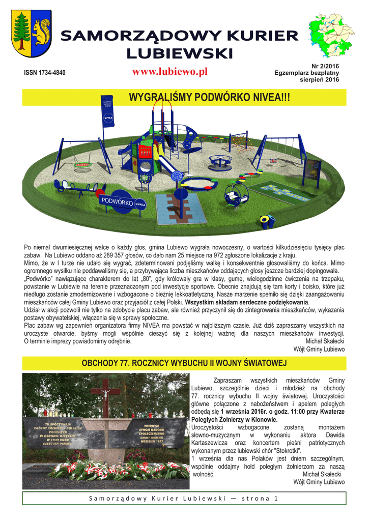 ISSN 1734-4840 www.lubiewo.pl Nr 2/2016 Egzemplarz bezpłatny sierpień 2016 WYGRALIŚMY PODWÓRKO NIVEA!!! Po niemal dwumiesięcznej walce o każdy głos, gmina Lubiewo wygrała nowoczesny, o wartości kilkudziesięciu tysięcy plac zabaw. Na Lubiewo oddano aż 289 357 głosów, co dało nam 25 miejsce na 972 zgłoszone lokalizacje z kraju. Mimo, że w I turze nie udało się wygrać, zdeterminowani podjęliśmy walkę i konsekwentnie głosowaliśmy do końca. Mimo ogromnego wysiłku nie poddawaliśmy się, a przybywająca liczba mieszkańców oddających głosy jeszcze bardziej dopingowała. „Podwórko” nawiązujące charakterem do lat „80”, gdy królowały gra w klasy, gumę, wielogodzinne ćwiczenia na trzepaku, powstanie w Lubiewie na terenie przeznaczonym pod inwestycje sportowe. Obecnie znajdują się tam korty i boisko, które już niedługo zostanie zmodernizowane i wzbogacone o bieżnię lekkoatletyczną. Nasze marzenie spełniło się dzięki zaangażowaniu mieszkańców całej Gminy Lubiewo oraz przyjaciół z całej Polski. Wszystkim składam serdeczne podziękowania. Udział w akcji pozwolił nie tylko na zdobycie placu zabaw, ale również przyczynił się do zintegrowania mieszkańców, wykazania postawy obywatelskiej, włączenia się w sprawy społeczne. Plac zabaw wg zapewnień organizatora firmy NIVEA ma powstać w najbliższym czasie. Już dziś zapraszamy wszystkich na uroczyste otwarcie, byśmy mogli wspólnie cieszyć się z kolejnej ważnej dla naszych mieszkańców inwestycji. O terminie imprezy powiadomimy odrębnie. Michał Skałecki Wójt Gminy Lubiewo OBCHODY 77. ROCZNICY WYBUCHU II WOJNY ŚWIATOWEJ Zapraszam wszystkich mieszkańców Gminy Lubiewo, szczególnie dzieci i młodzież na obchody 77. rocznicy wybuchu II wojny światowej. Uroczystości główne połączone z nabożeństwem i apelem poległych odbędą się 1 września 2016r. o godz. 11:00 przy Kwaterze Poległych Żołnierzy w Klonowie. Uroczystości wzbogacone zostaną montażem słowno-muzycznym w wykonaniu aktora Dawida Kartaszewicza oraz koncertem pieśni patriotycznych wykonanym przez lubiewski chór "Stokrotki". 1 września dla nas Polaków jest dniem szczególnym, wspólnie oddajmy hołd poległym żołnierzom za naszą wolność. Michał Skałecki Wójt Gminy Lubiewo Samorządowy Kurier Lubiewski — strona 1 INWESTYCJE DROGOWE Przebudowa drogi gminnej 010643C Sucha- Cierplewo- zakończona W dniu 07 lipca 2016r. odbył się odbiór inwestycji pn.: „Przebudowa drogi gminnej Sucha - Cierplewo do gruntów rolnych na działkach o nr ewid. 397/1, 407 i 415/1”. Wykonawcą przedmiotowego zadania był Zakład Sprzętowo-Transportowy Czesław Pawłowski. Zamówienie zostało wykonane zgodnie z zawartą umową z wykonawcą oraz dokumentacją techniczną. Tym samym droga gruntowa zyskała nawierzchnię asfaltową o długości 990 metrów, co zdecydowanie przyczyni się do poprawy komfortu przejazdu zarówno przez mieszkańców, jaki i odwiedzających gminę turystów. Dnia 09 sierpnia br. przedstawiciel Urzędu Marszałkowskiego w Toruniu przeprowadził kontrolę ww. inwestycji, podczas której stwierdzono wykonanie zadania zgodnie z umową o przyznaniu środków. Wartość robót drogowych wyniosła: 294.076,76 PLN Inwestycja została współfinansowana ze środków budżetu Województwa Kujawsko-Pomorskiego pochodzących z tytułu wyłączeń gruntów rolnych z produkcji. Dotacja celowa w ramach ww. programu wyniosła 111.171,31 zł. Przebudowa ulicy 13 Lutego na odcinku 679,0 m w Bysławiu wraz z budową kablowej linii oświetlenia drogowego i kanalizacji deszczowej Dnia 09.08.2016r. odbył się odbiór ww. inwestycji. W ramach zadania wykonano prace ziemne, kanalizację deszczową, oświetlenie uliczne, nawierzchnie chodników z kostki brukowej o gr. 6 cm., zjazdów również z kostki brukowej o r. 8 cm., nawierzchnie ulicy z masy mineralno-bitumicznej składającej się z warstwy wiążącej o gr. 5 cm. i warstwy ścieralnej o gr. 4 cm. Ponadto wykonano wyniesione skrzyżowania z drogami gminnymi, zamontowano urządzenia bezpieczeństwa ruchu drogowego oraz właściwe oznakowanie poziome i pionowe. Wartość robót wyniosła: 815.131,21 PLN Dotacja celowa z budżetu państwa w ramach Programu Rozwoju Gminnej i Powiatowej Infrastruktury Drogowej na lata 2016-2019 wynosi 407.565,00 PLN Przebudowa ul. Okrężnej z łącznikami i częścią ul. Krótkiej w Bysławiu wraz z budową kanalizacji deszczowej, gmina Lubiewo Plac budowy został przekazany w dniu 13.06.2016r., planowany termin realizacji zamówienia - 30.11.2016r. Wykonawcą robót budowlanych jest Przedsiębiorstwo w Tucholi. Projekt budowlany przewiduje wykonanie: Wielobranżowe SOLO Tomasz Koczyński z siedzibą -nawierzchni ulicy, zjazdów i chodnika w technologii kostki betonowej, -sieci kanalizacji deszczowej wraz z wpustami, przykanalikami, studniami rewizyjnymi oraz separatorami koalescencyjnymi. Wartość robót wynosi: 497.779,61 PLN Pomoc w ramach Programu Rozwoju Obszarów Wiejskich na lata 2014-2020 ze środków Europejskiego Funduszu Rolnego na rzecz Rozwoju Obszarów Wiejskich wynosi 63,63% kosztów kwalifikowalnych. Arkadiusz Kowalikowski Samorządowy Kurier Lubiewski — strona 2 FUNDUSZ SOŁECKI W GMINIE LUBIEWO NA ROK 2017 Ustawa o funduszu sołeckim z dnia 21 lutego 2014 roku określa sposób prowadzenia gospodarki finansowej sołectw w ramach budżetu gminnego. Uchwalenie Ustawy miało na celu wzmocnienie sołectwa pod względem finansowym w celu realizacji zadań własnych gminy, służących poprawie warunków życia mieszkańców i zgodnych ze strategią rozwoju gminy. W budżecie Gminy Lubiewo wydzielono środki finansowe w ramach funduszu sołeckiego na 2017r., których podział przedstawia się następująco: Sołectwo Kwota do dyspozycji na 2017 rok Szanowni Mieszkańcy Bysław 34.827,33 zł Bysławek 21.000,88 zł Cierplewo 10.517,85 zł Klonowo 28.837,03 zł Lubiewice 16.438,50 zł Lubiewo 34.827,33