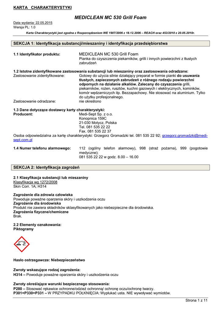 KARTA CHARAKTERYSTYKI MEDICLEAN MC 530 Grill Foam Data wydania: 22.05.2015 Wersja PL: 1.0 Karta Charakterystyki jest zgodna z Rozporządzeniem WE 1907/2006 z 18.12.2006 – REACH oraz 453/2010 z 20.05.2010r. SEKCJA 1: Identyfikacja substancji/mieszaniny i identyfikacja przedsiębiorstwa 1.1 Identyfikator produktu: MEDICLEAN MC 530 Grill Foam Pianka do czyszczenia piekarników, grilli i innych powierzchni z tłustych zabrudzeń 1.2 Istotne zidentyfikowane zastosowania substancji lub mieszaniny oraz zastosowania odradzane: Zastosowanie zidentyfikowane: Gotowy do użycia silnie działający preparat w formie pianki do usuwania tłustych, zapieczonych zabrudzeń z różnego rodzaju powierzchni odpornych na działanie alkaliów. Zalecany do czyszczenia grilli, piekarników, rożen, rusztów, kuchni gazowych i elektrycznych, kominków, komór wędzarniczych itp. Bezzapachowy. Nie stosować na aluminium. Tylko do użytku profesjonalnego. Zastosowanie odradzane: nie określono 1.3 Dane dotyczące dostawcy karty charakterystyki: Producent: Medi-Sept Sp. z o.o. Konopnica 159C 21-030 Motycz, Polska Tel. 081 535 22 22 Fax. 081 535 22 37 Osoba odpowiedzialna za kartę charakterystyki: Grzegorz Gromadzki tel. 081 535 22 92; [email protected] 1.4 Numer telefonu alarmowego: 112 (ogólny telefon alarmowy), 998 (straż pożarna), 999 (pogotowie medyczne); 081 535 22 22 w godz. 8.00 – 16.00 SEKCJA 2: Identyfikacja zagrożeń 2.1 Klasyfikacja substancji lub mieszaniny Klasyfikacja wg 1272/2008 Skin Corr. 1A; H314 Zagrożenie dla zdrowia człowieka Powoduje poważne oparzenia skóry i uszkodzenia oczu Zagrożenie dla środowiska Produkt nie zawiera składników sklasyfikowanych jako niebezpieczne dla środowiska. Zagrożenia fizyczne/chemiczne Brak. 2.2 Elementy oznakowania: Piktogramy Hasło ostrzegawcze: Niebezpieczeństwo Zwroty wskazujące rodzaj zagrożenia: H314 – Powoduje poważne oparzenia skóry i uszkodzenia oczu Zwroty określające warunki bezpiecznego stosowania: P280 – Stosować rękawice ochronne/odzież ochronną/ ochronę oczu/ochronę twarzy. P301+P330+P331 – W PRZYPADKU POŁKNIĘCIA: Wypłukać usta. NIE wywoływać wymiotów. Strona 1 z 11 KARTA CHARAKTERYSTYKI MEDICLEAN MC 530 Grill Foam Data wydania: 22.05.2015 Wersja PL: 1.0 Karta Charakterystyki jest zgodna z Rozporządzeniem WE 1907/2006 z 18.12.2006 – REACH oraz 453/2010 z 20.05.2010r. P303+P361+P353 – W PRZYPADKU DOSTANIA SIĘ NA SKÓRĘ (lub na włosy): Natychmiast usunąć/zdjąć całą zanieczyszczoną odzież. spłukać skórę pod strumieniem wody/prysznicem. P305+P351+P338 – W PRZYPADKU DOSTANIA SIĘ DO OCZU: Ostrożnie płukać wodą przez kilka minut. Wyjąć soczewki kontaktowe, jeżeli są i można je łatwo usunąć. P310 – Natychmiast skontaktować się z OŚRODKIEM ZATRUĆ/lekarzem P405 – Przechowywać pod zamknięciem. Zawiera: Wodorotlenek potasu (CAS : 1310-58-3) Wg 648/2004: Zawiera <5% niejonowych środków powierzchniowo czynnych. Środki powierzchniowo czynne spełniają wymogi biodegradacji zgodne z Rozp. 648/2004. Arkusz danych składników dostępny na stronie: www.medisept.pl 2.3 Inne zagrożenia: Brak informacji na temat spełnienia kryteriów PBT lub vPvB zgodnie z załącznikiem XIII rozporządzenia REACH. Odpowiednie badania nie były przeprowadzone. SEKCJA 3: Skład/informacja o składnikach 3.1 Substancje: Nie dotyczy. 3.2 Mieszaniny: Niebezpieczne składniki: Identyfikator produktu Wodorotlenek potasu CAS : 1310-58-3 WE : 215-181-3 Numer indeksowy : 019-002-00-8 Numer rejestracji : 01-2119487136-33-xxxx Alkilopoliglukozyd CAS: 68515-73-1 WE: 500-220-1 Nr indeksowy: Nr REACH: 01-2119488530-36-XXXX Pełna treść zwrotów H w sekcji 16 Zawartość % Klasyfikacja CLP Kody zwrotów Klasa zagrożenia i wskazujących rodzaj kody kategorii zagrożenia 11 Acute Tox. 4 Skin Corr. 1A H302 H314 <2 Eye Dam. 1 H318 Dodatkowo zawiera: Eter metylowy glikolu dipropylenowego CAS: 34590-94-8 Nr REACH: 01-2119450011-60-XXXX Stężenie: <3% SEKCJA 4: Środki pierwszej pomocy 4.1 Opis środków pierwszej pomocy W przypadku kontaktu ze skórą: Umyć zabrudzoną skórę wodą z mydłem, spłukać dokładnie wodą, w przypadku pojawienia się podrażnienia, rumieni skontaktować się z lekarzem. W przypadku kontaktu z oczami: Przepłukać oczy przez kilkanaście minut (ok. 15) dużą ilością wody, trzymając powieki szeroko rozwarte. Unikać silnego strumienia, ze względu na niebezpieczeństwo uszkodzenia rogówki, skontaktować się z lekarzem. Strona 2 z 11 KARTA CHARAKTERYSTYKI MEDICLEAN MC 530 Grill Foam Data wydania: 22.05.2015 Wersja PL: 1.0 Karta Charakterystyki jest zgodna z Rozporządzeniem WE 1907/2006 z 18.12.2006 – REACH oraz 453/2010 z 20.05.2010r. Narażenie inhalacyjne: W razie zawrotów głowy lub nudności wyprowadzić poszkodowanego na świeże powietrze, w razie braku szybkiej poprawy zasięgnąć porady lekarza. W przypadku połknięcia: Nie wywoływać wymiotów. Przepłukać usta wodą. Podać do wypicia szklankę wody. Natychmiast skontaktować się z lekarzem. 4.2 Najważniejsze ostre i opóźnione objawy oraz skutki narażenia: Kontakt ze skórą: poparzenia, zaczerwienienie, ból. Kontakt z oczami: poparzenia, może dojść do uszkodzenia oczu.. Układ oddechowy: wdychanie stężonych par produktu powoduje podrażnienia błon śluzowych nosa, gardła i dalszych odcinków układu oddechowego. Przewód pokarmowy: silne podrażnienia przewodu pokarmowego z ryzykiem perforacji przełyku, żołądka, objawy zatrucia pokarmowego, bóle brzucha, nudności, wymioty. 4.3 Wskazania dotyczące wszelkiej natychmiastowej pomocy lekarskiej i szczególnego postępowania z poszkodowanym: Decyzję o sposobie postępowania podejmuje lekarz po ocenie stanu poszkodowanego. SEKCJA 5: Postępowanie w przypadku pożaru 5.1 Środki gaśnicze: Odpowiednie środki gaśnicze: suche proszki gaśnicze, dwutlenek węgla, mgła wodna. W przypadku dużych pożarów stosować pianę akoholoodporną i wodę.
