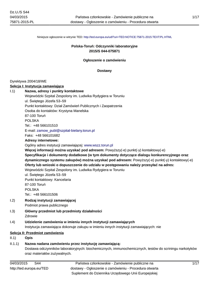 Dz.U./S S44 04/03/2015 75871-2015-PL Państwa członkowskie - Zamówienie publiczne na dostawy - Ogłoszenie o zamówieniu - Procedura otwarta 1/17 Niniejsze ogłoszenie w witrynie TED: http://ted.europa.eu/udl?uri=TED:NOTICE:75871-2015:TEXT:PL:HTML Polska-Toruń: Odczynniki laboratoryjne 2015/S 044-075871 Ogłoszenie o zamówieniu Dostawy Dyrektywa 2004/18/WE Sekcja I: Instytucja zamawiająca I.1) Nazwa, adresy i punkty kontaktowe Wojewódzki Szpital Zespolony im. Ludwika Rydygiera w Toruniu ul. Świętego Józefa 53–59 Punkt kontaktowy: Dział Zamówień Publicznych i Zaopatrzenia Osoba do kontaktów: Krystyna Manelska 87-100 Toruń POLSKA Tel.: +48 566101510 E-mail: [email protected] Faks: +48 566101682 Adresy internetowe: Ogólny adres instytucji zamawiającej: www.wszz.torun.pl Więcej informacji można uzyskać pod adresem: Powyższy(-e) punkt(-y) kontaktowy(-e) Specyfikacje i dokumenty dodatkowe (w tym dokumenty dotyczące dialogu konkurencyjnego oraz dynamicznego systemu zakupów) można uzyskać pod adresem: Powyższy(-e) punkt(-y) kontaktowy(-e) Oferty lub wnioski o dopuszczenie do udziału w postępowaniu należy przesyłać na adres: Wojewódzki Szpital Zespolony im. Ludwika Rydygiera w Toruniu ul. Świętego Józefa 53–59 Punkt kontaktowy: Kancelaria 87-100 Toruń POLSKA Tel.: +48 566101506 I.2) Rodzaj instytucji zamawiającej Podmiot prawa publicznego I.3) Główny przedmiot lub przedmioty działalności Zdrowie I.4) Udzielenie zamówienia w imieniu innych instytucji zamawiających Instytucja zamawiająca dokonuje zakupu w imieniu innych instytucji zamawiających: nie Sekcja II: Przedmiot zamówienia II.1) Opis II.1.1) Nazwa nadana zamówieniu przez instytucję zamawiającą: Dostawa odczynników laboratoryjnych: biochemicznych, immunochemicznych, testów do scriningu narkotyków oraz materiałów zużywalnych. 04/03/2015 S44 http://ted.europa.eu/TED Państwa członkowskie - Zamówienie publiczne na dostawy - Ogłoszenie o zamówieniu - Procedura otwarta Suplement do Dziennika Urzędowego Unii Europejskiej 1/17 Dz.U./S S44 04/03/2015 75871-2015-PL Państwa członkowskie - Zamówienie publiczne na dostawy - Ogłoszenie o zamówieniu - Procedura otwarta 2/17 II.1.2) Rodzaj zamówienia oraz lokalizacja robót budowlanych, miejsce realizacji dostawy lub świadczenia usług Dostawy Kupno Główne miejsce lub lokalizacja robót budowlanych, miejsce realizacji dostawy lub świadczenia usług: Magazyny zlokalizowane w siedzibie Zamawiającego przy ul. św. Józefa 53–59, przy ul. Konstytucji 3 Maja 42 i przy ul. Krasińskiego 4/4a. Kod NUTS II.1.3) Informacje na temat zamówienia publicznego, umowy ramowej lub dynamicznego systemu zakupów (DSZ) Ogłoszenie dotyczy zamówienia publicznego II.1.4) Informacje na temat umowy ramowej II.1.5) Krótki opis zamówienia lub zakupu Przedmiotem zamówienia jest dostawa odczynników laboratoryjnych: biochemicznych, immunochemicznych, testów do scriningu narkotyków oraz materiałów zużywalnych. Zadanie nr 1: odczynniki do badań biochemicznych, metody manualne – spektrofotometr, możliwość dostosowania do automatycznego analizatora biochemicznego AU680, AU480, ciekłe, gotowe do użycia, z kalibratorami i kontrolami (kontrola min. 2 poziomy). 1. Zestaw do ilościowego oznaczania całkowitych kwasów żółciowych (TBA) metodą enzymatyczną (opakowania dopasowane do analizatorów AU680, AU480), częstotliwość kontroli 1 x 2 tygodnie – 400 oznaczeń. Wymogi dotyczące przedmiotu zamówienia. Odczynniki biochemiczne i materiały eksploatacyjne do analizatora AU680 i AU480: 1) konfekcjonowanie odczynników – odczynniki w opakowaniach umożliwiających bezpośrednie wstawienie ich do analizatora; 2) opakowania muszą posiadać kody kreskowe umożliwiające analizatorowi odczytanie następujących informacji o odczynniku: rodzaj testu, nr serii, wielkość i nr butelki (opakowania); 3) odczynniki muszą posiadać oryginalne aplikacje do analizatorów: AU680 i AU480, dostarczone przez producenta testów; 4) aplikacje muszą posiadać polską instrukcję wykonania, opis zasady metody i wielkość opakowania. Zadanie 2: odczynniki do testów Elisa do analizatora Analyser I-2P. Anty-Transglutaminaza tkankowa IgA (ELISA) 96 t. Zestaw do ilościowego oznaczania – 10 op. Przeciwciała anty-GAD 96 t. – 5 op. Przeciwciała anty-IA2A 96 t. – 5 op. Krztusiec IgM 96 t. – 7 op. Wymogi dotyczące przedmiotu zamówienia. Odczynniki do testów Elisa do analizatora Analyser I-2P. 1) Zestawy testowe ELISA do oznaczania przeciwciał klasy IgA przeciwko ludzkiej transglutaminazie tkankowej w surowicy lub plazmie: 1. antygen: ludzka rekombinowana transglutaminaza tkankowa; 2. testy ilościowe w klasie IgA; 3. możliwość odłamywania pasków ze studzienkami; 4. minimum 3 kalibratory; 5. kontrola pozytywna i negatywna; 6. kalibratory i kontrole gotowe do użycia; 04/03/2015 S44 http://ted.europa.eu/TED Państwa członkowskie - Zamówienie publiczne na dostawy - Ogłoszenie o zamówieniu - Procedura otwarta Suplement do Dziennika Urzędowego Unii Europejskiej 2/17 Dz.U./S S44 04/03/2015 75871-2015-PL Państwa członkowskie - Zamówienie publiczne na dostawy - Ogłoszenie o zamówieniu - Procedura otwarta 3/17 7. możliwość transmisji danych w systemie LIS (Hipokrates firmy Asseco). 2) Zestawy testowe ELISA do oznaczania przeciwciał przeciw Bordetella pertusis IgM: 1. antygen: wysoko oczyszczona toksyna Bordetella pertusis (szczep TOHAMA). 3) Zestaw do oznaczania przeciwciał anty-GAD: 1. antygen rekombinowany (GAD); 2. wynik wyrażony w IU/ml; 3. krzywa kalibracyjna kilkupunktowa (min. 5-cio punktowa), zakresy kalibratorów: najniższy max. 5 IU/ml, najwyższy min. 2 000 IU/ml. 4) Zestaw do oznaczania przeciwciał anty-IA2: 1. antygen rekombinowany (IA-2); 2. wynik wyrażony w IU/ml; 3. krzywa kalibracyjna kilkupunktowa (min. 5-cio punktowa), zakresy kalibratorów: najniższy max. 10 IU/ml, najwyższy min. 4 000 IU/ml. Zadanie 3: odczynnik