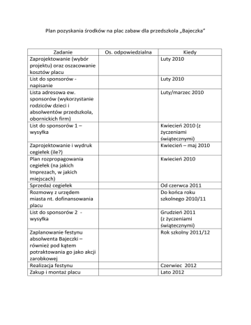Plan pozyskania środków na plac zabaw dla przedszkola „Bajeczka” Zadanie Zaprojektowanie (wybór projektu) oraz oszacowanie kosztów placu List do sponsorów napisanie Lista adresowa ew. sponsorów (wykorzystanie rodziców dzieci i absolwentów przedszkola, obornickich firm) List do sponsorów 1 – wysyłka Zaprojektowanie i wydruk cegiełek (ile?) Plan rozpropagowania cegiełek (na jakich Imprezach, w jakich miejscach) Sprzedaż cegiełek Rozmowy z urzędem miasta nt. dofinansowania placu List do sponsorów 2 wysyłka Zaplanowanie festynu absolwenta Bajeczki – również pod kątem potraktowania go jako akcji zarobkowej Realizacja festynu Zakup i montaż placu Os. odpowiedzialna Kiedy Luty 2010 Luty 2010 Luty/marzec 2010 Kwiecieo 2010 (z życzeniami świątecznymi) Kwiecieo – maj 2010 Kwiecieo 2010 Od czerwca 2011 Do kooca roku szkolnego 2010/11 Grudzieo 2011 (z życzeniami świątecznymi) Rok szkolny 2011/12 Czerwiec 2012 Lato 2012