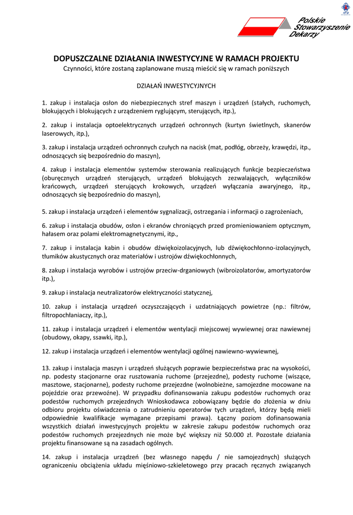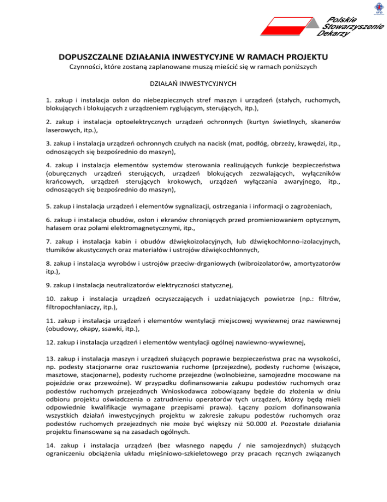 DOPUSZCZALNE DZIAŁANIA INWESTYCYJNE W RAMACH PROJEKTU Czynności, które zostaną zaplanowane muszą mieścić się w ramach poniższych DZIAŁAŃ INWESTYCYJNYCH 1. zakup i instalacja osłon do niebezpiecznych stref maszyn i urządzeń (stałych, ruchomych, blokujących i blokujących z urządzeniem ryglującym, sterujących, itp.), 2. zakup i instalacja optoelektrycznych urządzeń ochronnych (kurtyn świetlnych, skanerów laserowych, itp.), 3. zakup i instalacja urządzeń ochronnych czułych na nacisk (mat, podłóg, obrzeży, krawędzi, itp., odnoszących się bezpośrednio do maszyn), 4. zakup i instalacja elementów systemów sterowania realizujących funkcje bezpieczeństwa (oburęcznych urządzeń sterujących, urządzeń blokujących zezwalających, wyłączników krańcowych, urządzeń sterujących krokowych, urządzeń wyłączania awaryjnego, itp., odnoszących się bezpośrednio do maszyn), 5. zakup i instalacja urządzeń i elementów sygnalizacji, ostrzegania i informacji o zagrożeniach, 6. zakup i instalacja obudów, osłon i ekranów chroniących przed promieniowaniem optycznym, hałasem oraz polami elektromagnetycznymi, itp., 7. zakup i instalacja kabin i obudów dźwiękoizolacyjnych, lub dźwiękochłonno-izolacyjnych, tłumików akustycznych oraz materiałów i ustrojów dźwiękochłonnych, 8. zakup i instalacja wyrobów i ustrojów przeciw-drganiowych (wibroizolatorów, amortyzatorów itp.), 9. zakup i instalacja neutralizatorów elektryczności statycznej, 10. zakup i instalacja urządzeń oczyszczających i uzdatniających powietrze (np.: filtrów, filtropochłaniaczy, itp.), 11. zakup i instalacja urządzeń i elementów wentylacji miejscowej wywiewnej oraz nawiewnej (obudowy, okapy, ssawki, itp.), 12. zakup i instalacja urządzeń i elementów wentylacji ogólnej nawiewno-wywiewnej, 13. zakup i instalacja maszyn i urządzeń służących poprawie bezpieczeństwa prac na wysokości, np. podesty stacjonarne oraz rusztowania ruchome (przejezdne), podesty ruchome (wiszące, masztowe, stacjonarne), podesty ruchome przejezdne (wolnobieżne, samojezdne mocowane na pojeździe oraz przewoźne). W przypadku dofinansowania zakupu podestów ruchomych oraz podestów ruchomych przejezdnych Wnioskodawca zobowiązany będzie do złożenia w dniu odbioru projektu oświadczenia o zatrudnieniu operatorów tych urządzeń, którzy będą mieli odpowiednie kwalifikacje wymagane przepisami prawa). Łączny poziom dofinansowania wszystkich działań inwestycyjnych projektu w zakresie zakupu podestów ruchomych oraz podestów ruchomych przejezdnych nie może być większy niż 50.000 zł. Pozostałe działania projektu finansowane są na zasadach ogólnych. 14. zakup i instalacja urządzeń (bez własnego napędu / nie samojezdnych) służących ograniczeniu obciążenia układu mięśniowo-szkieletowego przy pracach ręcznych związanych z przemieszczaniem przedmiotów, ładunków lub materiałów np. ręczne wózki paletowe, wózki magazynowe, ręczne wózki platformowe dwunożycowe, wciągniki i żurawiki do 450 kg, 15. zakup i instalacja wózków jezdniowych podnośnikowych i innych urządzeń samojezdnych służących ograniczeniu obciążenia układu mięśniowo-szkieletowego, w przypadkach, gdy zastosowanie urządzeń przemieszczanych ręcznie, wymienionych w punkcie 14, nie zapewnia skutecznego ograniczenia tych obciążeń. Łączny poziom dofinansowania wszystkich działań inwestycyjnych projektu w zakresie zakupu wózków jezdniowych podnośnikowych i innych urządzeń samojezdnych nie może być większy niż 50.000 zł, 16. zakup i instalacja urządzeń służących poprawie bezpieczeństwa pracy w przypadku narażenia na szkodliwe czynniki biologiczne, 17. zakup środków ochrony indywidualnej (wyłącznie dla firm zatrudniających do 49 pracowników pod warunkiem przedstawienia dokumentacji potwierdzającej prawidłowe przeprowadzenie oceny ryzyka zawodowego oraz dokumentacji właściwego doboru środków ochrony indywidualnej), 18. modernizacja linii technologicznej mająca na celu poprawę bezpieczeństwa pracy z wyłączeniem zakupu maszyn produkcyjnych i ich części. W przypadku, gdy działania inwestycyjne nie dotyczą gotowego, dopuszczonego do użytkowania urządzenia, niezbędne jest dostarczenie w załączeniu do Wniosku koncepcji i projektu technicznego instalacji, systemu, urządzeń, itp. Działania inwestycyjne nie mogą dotyczyć zakupu maszyn produkcyjnych i ich części, szkoleń, działań z zakresu ppoż. Kosztem niekwalifikowalnym jest m.in.: uruchomienie, odbiór czy transport urządzenia (dostawa) na miejsce realizacji projektu. Realizacja projektu inwestycyjnego powinna przyczynić się do zredukowania niekorzystnego oddziaływania przynajmniej jednego z niżej wymienionych parametrów (z wyłączeniem projektów dotyczących zakupu środków ochrony indywidualnej): zapylenie, obciążenie układu mięśniowo - szkieletowego, hałas, wibracje, promieniowanie jonizujące i niejonizujące, mikroklimat, czynniki chemiczne, czynniki biologiczne. W przypadku zakupu urządzeń, systemów itp., należy podać typ i nazwę danego produktu oraz informacje dotyczące spełniania przez urządzenie wymagań dopuszczających je do użytkowania w Polsce (np. zgodność z dyrektywą maszynową, certyfikat CE potwierdzający wykonanie oceny zgodności). W przypadku wykazywania w budżecie zakupu „kompletu” urządzeń, systemów itp., należy wyszczególnić w załączniku składowe „kompletu”, podając parametry oraz ceny jednostkowe, pozwalające na weryfikację przez eksperta zasadności zakupu produktów. Niezbędna jest również kalkulacja cenowa uwzględniająca osobno cenę urządzenia, instalacji, maszyny itp., podaną w kwocie netto oraz brutto (kwoty koniecznie podane w złotówkach). Kalkulacja powinna zawierać składowe typu: jednostka miary (sztuka, liczba roboczogodzin) oraz osobna kalkulacja dotycząca montażu, która powinna zawiera
