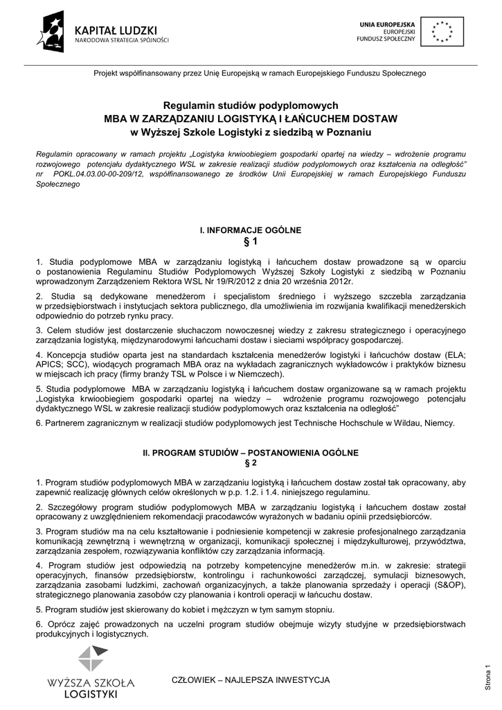 Projekt współfinansowany przez Unię Europejską w ramach Europejskiego Funduszu Społecznego Regulamin studiów podyplomowych MBA W ZARZĄDZANIU LOGISTYKĄ I ŁAŃCUCHEM DOSTAW w Wyższej Szkole Logistyki z siedzibą w Poznaniu Regulamin opracowany w ramach projektu „Logistyka krwioobiegiem gospodarki opartej na wiedzy – wdrożenie programu rozwojowego potencjału dydaktycznego WSL w zakresie realizacji studiów podyplomowych oraz kształcenia na odległość” nr POKL.04.03.00-00-209/12, współfinansowanego ze środków Unii Europejskiej w ramach Europejskiego Funduszu Społecznego I. INFORMACJE OGÓLNE §1 1. Studia podyplomowe MBA w zarządzaniu logistyką i łańcuchem dostaw prowadzone są w oparciu o postanowienia Regulaminu Studiów Podyplomowych Wyższej Szkoły Logistyki z siedzibą w Poznaniu wprowadzonym Zarządzeniem Rektora WSL Nr 19/R/2012 z dnia 20 września 2012r. 2. Studia są dedykowane menedżerom i specjalistom średniego i wyższego szczebla zarządzania w przedsiębiorstwach i instytucjach sektora publicznego, dla umożliwienia im rozwijania kwalifikacji menedżerskich odpowiednio do potrzeb rynku pracy. 3. Celem studiów jest dostarczenie słuchaczom nowoczesnej wiedzy z zakresu strategicznego i operacyjnego zarządzania logistyką, międzynarodowymi łańcuchami dostaw i sieciami współpracy gospodarczej. 4. Koncepcja studiów oparta jest na standardach kształcenia menedżerów logistyki i łańcuchów dostaw (ELA; APICS; SCC), wiodących programach MBA oraz na wykładach zagranicznych wykładowców i praktyków biznesu w miejscach ich pracy (firmy branży TSL w Polsce i w Niemczech). 5. Studia podyplomowe MBA w zarządzaniu logistyką i łańcuchem dostaw organizowane są w ramach projektu „Logistyka krwioobiegiem gospodarki opartej na wiedzy – wdrożenie programu rozwojowego potencjału dydaktycznego WSL w zakresie realizacji studiów podyplomowych oraz kształcenia na odległość” 6. Partnerem zagranicznym w realizacji studiów podyplomowych jest Technische Hochschule w Wildau, Niemcy. II. PROGRAM STUDIÓW – POSTANOWIENIA OGÓLNE §2 1. Program studiów podyplomowych MBA w zarządzaniu logistyką i łańcuchem dostaw został tak opracowany, aby zapewnić realizację głównych celów określonych w p.p. 1.2. i 1.4. niniejszego regulaminu. 2. Szczegółowy program studiów podyplomowych MBA w zarządzaniu logistyką i łańcuchem dostaw został opracowany z uwzględnieniem rekomendacji pracodawców wyrażonych w badaniu opinii przedsiębiorców. 3. Program studiów ma na celu kształtowanie i podniesienie kompetencji w zakresie profesjonalnego zarządzania komunikacją zewnętrzną i wewnętrzną w organizacji, komunikacji społecznej i międzykulturowej, przywództwa, zarządzania zespołem, rozwiązywania konfliktów czy zarządzania informacją. 4. Program studiów jest odpowiedzią na potrzeby kompetencyjne menedżerów m.in. w zakresie: strategii operacyjnych, finansów przedsiębiorstw, kontrolingu i rachunkowości zarządczej, symulacji biznesowych, zarządzania zasobami ludzkimi, zachowań organizacyjnych, a także planowania sprzedaży i operacji (S&OP), strategicznego planowania zasobów czy planowania i kontroli operacji w łańcuchu dostaw. 5. Program studiów jest skierowany do kobiet i mężczyzn w tym samym stopniu. CZŁOWIEK – NAJLEPSZA INWESTYCJA Strona 1 6. Oprócz zajęć prowadzonych na uczelni program studiów obejmuje wizyty studyjne w przedsiębiorstwach produkcyjnych i logistycznych. Projekt współfinansowany przez Unię Europejską w ramach Europejskiego Funduszu Społecznego III. ZASADY ORGANIZACJI I REALIZACJI STUDIÓW §3 1. Warunki wpisania na listę studentów studiów podyplomowych określa Regulamin rekrutacji. 2. Liczbę miejsc na studiach podyplomowych reguluje Regulamin rekrutacji. 3. Zasady rekrutacji na studia podyplomowe MBA w zarządzaniu logistyką i łańcuchem dostaw określa „Regulamin rekrutacji na Studia podyplomowe MBA w zarządzaniu logistyką i łańcuchem dostaw” stanowiący załącznik do niniejszego regulaminu. 4. Osobą odpowiedzialną za organizację i przebieg studiów jest kierownik studiów powoływany przez Rektora na wniosek kierownika projektu. 5. Kierownik studiów zawiadamia kandydatów pisemnie, elektronicznie lub telefonicznie o przyjęciu bądź nie przyjęciu na studia. Kandydatów przyjętych zawiadamia również o planie zajęć. 6. Przebieg studiów dokumentowany jest w: - protokołach zaliczeń i protokołach egzaminacyjnych, - indeksie słuchacza, - protokole egzaminu końcowego, - księdze wydanych świadectw. 7. Do dokumentacji zalicza się pracę końcową, której jeden egzemplarz w wersji papierowej oraz jeden na nośniku elektronicznym wraz z teczką osobową słuchacza przechowywane są w archiwum uczelni. 8. Program kształcenia umożliwia słuchaczom uzyskanie co najmniej 90 pktów ECTS. 9. Szczegółowe warunki uczestnictwa w studiach reguluje umowa pomiędzy słuchaczem i organizatorem. 10. Studia podyplomowe MBA w zarządzaniu logistyką i łańcuchem dostaw są realizowane w całości w języku angielskim (w tym również projekty menedżerskie, prace egzaminacyjne i kontrolne oraz praca końcowa). 11. Studia są trzy-semestralne, w trakcie poszczególnych semestrów odbywają się sesje praktycznodydaktyczne i sesje dydaktyczne wg organizacji: - 1 semestr – 2 sesje praktyczno-dydaktyczne i 3 sesje dydaktyczne, - 2 semestr – 2 sesje praktyczno-dydaktyczne i 4 sesje dydaktyczne, - 3 semestr – 2 sesje praktyczno-dydaktyczne i 3 sesje dydaktyczne. 12. Sesje praktyczno-dydaktyczne trwają 3 dni i obejmują zjazdy piątek-niedziela. Piątek w sesjach praktycznodydaktycznych jest przeznaczony na wizyty studyjne celem przeprowadzenia zajęć praktycznych i warsztatów w przedsiębiorstwach. 13. Sesje dydaktyczne trwają 2 lub 3 dni i obejmują zjazdy sobota-niedziela lub piątek-niedziela. 14. Jedna sesja praktyczno-dydaktyczna w każdym semestrze studió