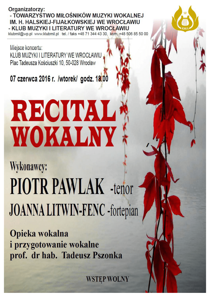 Wykonawcy PIOTR PAWLAK tenor Fortepian JOANNA LITWIN-FENC Program G. F. HAENDEL Rec. i aria Xerxesa „Frondi tenere… Ombra mai fu” z opery Xerxes W. A. MOZART „Das traumbild” op 7 nr 33 NIKOLAY RIMSKI-KORSAKOV Pieśń indyjskiego gościa z opery „Sadko” KARL JENKINS „Ave Verum” ST. MONIUSZKO aria Franka „Płyną tratwy po Wiśle” z opery „Flis” J. HAYDN rec. i aria Łukasza „Die mittagsonne brennet jezt…” z oratorium „Die Jahreszeiten” J. MASSENET aria Kawalera Des Grieux „Instant charmant… En fermant les yeux” z opery “Manon” PRZERWA W. A. MOZART aria Don Basilia „In quegli anni in cui val poco” z opery Wesele Figara G. PUCCINI aria Kawalera Des Grieux z opery “Manon Lescaut” R. STRAUSS „Ach Lieb, ich muss Nun Scheiden” H. WOLF „Verborgenheit” R. STRAUSS „Zueignung” F. SCHUBERT „Die Post” z cyklu “Winterreise” KLUB MUZYKI I LITERATURY WE WROCŁAWIU Plac Tadeusza Kościuszki 10 , 50-028 Wrocław tel. 71 344 43 30, faks 71 344 43 30, kom. 506 85 50 00 e-mail: [email protected] http://www.klubmil.pl/ _________________________________________________________________ Wykonawcy koncertu i Towarzystwo Miłośników Muzyki Wokalnej im. H. Halskiej-Fijałkowskiej we Wrocławiu serdecznie dziękują Dyrekcji i Pracownikom Klubu Muzyki i Literatury we Wrocławiu za możliwość zorganizowania koncertu i stworzenie wyjątkowo miłej, twórczej atmosfery !