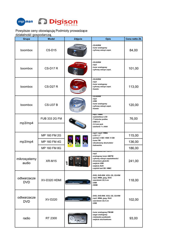 Powyższe ceny obowiązują Podmioty prowadzące działalność gospodarczą. Grupa boombox boombox boombox boombox Model Opis CS-D15 84,00 CS-D17 R - CD-R/RW - mp3 - tuner analogowy - cyfrowy odczyt częst. 101,00 CS-D27 R CS-U37 B mp3/mp4 MP 160 FM 2G MP 160 FM 4G - CD-R/RW - mp3 - tuner analogowy - cyfrowy odczyt częst. - kaseta - CD-R/RW - mp3 - USB - tuner analogowy - cyfrowy odczyt częst. - kaseta - mp3 / WMA - wyświetlacz LCD - 7 kolorów podśw. - USB 2.0 - 3,5 mm jack - zasilanie 1 x AAA - mp3 / mp4 / WMA - LCD 1,5 " - pamięć 2 GB / 4GB / 8 GB - tuner FM - wbudowany akumulator - ładowarka odtwarzacze DVD odtwarzacze DVD radio XR-M15 113,00 120,00 76,00 115,00 136,00 186,00 MP 160 FM 8G mikrosystemy audio Cena netto ZŁ - CD-R/RW - tuner analogowy - cyfrowy odczyt częst. FUB 333 2G FM mp3/mp4 Zdjęcie - odtwarzacz CD / CD-R - mp3 - analogowy tuner AM/FM - cyfrowy odczyt częstotliwości - drewniane głośniki - wejście USB - wejście AUX - czytnik kart SD / MMC 241,00 XV-D320 HDMI - DVD, DVD-RW, VCD, CD, CD-RW - mp3, WMA, jpeg, DIvX - szerokość 22,5 cm - USB - HDMI 118,00 XV-D220 - DVD, DVD-RW, VCD, CD, CD-RW - mp3, WMA, jpeg, DIvX - szerokość 22,5 cm - USB 102,00 RT 2300 - tuner analogowy FM/AM - zegar analogowy - niebieskie podświetl. - wejście słuchawkowe 93,00 radio radio Radiobudzik Radiobudzik RT 3300 RT 4300 FA 6 B FRA 150 - tuner cyfrowy FM/AM - zegar cyfrowy - wejście AUX - wejście słuchawkowe - obudowa drewniana - tuner analogowy FM/AM - odtwarzacz CD, CD-R/RW - mp3 - stereo - styl retro 124,00 247,00 - zegar cyfrowy - alarm - kalendarz - temperatura - funkcja snooze 21,00 - zegar cyfrowy - podwójny alarm, snooze - radio AM/FM - temperatura - wejście AUX 58,00