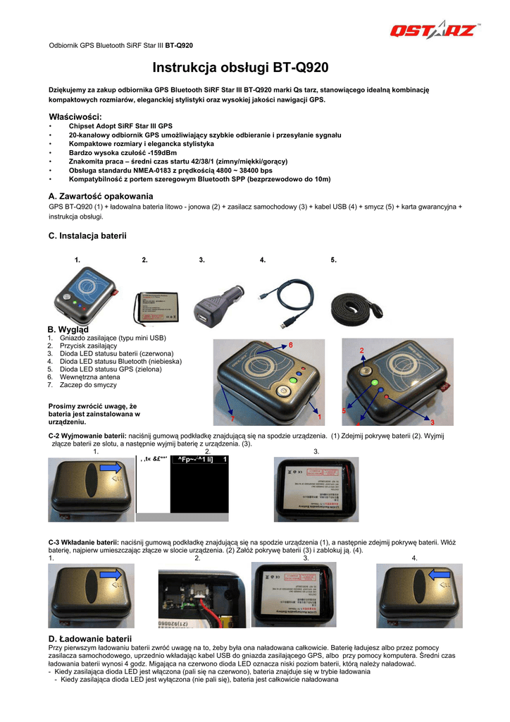 Odbiornik GPS Bluetooth SiRF Star III BT-Q920 Instrukcja obsługi BT-Q920 Dziękujemy za zakup odbiornika GPS Bluetooth SiRF Star III BT-Q920 marki Qs tarz, stanowiącego idealną kombinację kompaktowych rozmiarów, eleganckiej stylistyki oraz wysokiej jakości nawigacji GPS. Właściwości: • • • • • • • Chipset Adopt SiRF Star III GPS 20-kanałowy odbiornik GPS umożliwiający szybkie odbieranie i przesyłanie sygnału Kompaktowe rozmiary i elegancka stylistyka Bardzo wysoka czułość -159dBm Znakomita praca – średni czas startu 42/38/1 (zimny/miękki/gorący) Obsługa standardu NMEA-0183 z prędkością 4800 ~ 38400 bps Kompatybilność z portem szeregowym Bluetooth SPP (bezprzewodowo do 10m) A. Zawartość opakowania GPS BT-Q920 (1) + ładowalna bateria litowo - jonowa (2) + zasilacz samochodowy (3) + kabel USB (4) + smycz (5) + karta gwarancyjna + instrukcja obsługi. C. Instalacja baterii B. Wygląd 1. 2. 3. 4. 5. 6. 7. Gniazdo zasilające (typu mini USB) Przycisk zasilający Dioda LED statusu baterii (czerwona) Dioda LED statusu Bluetooth (niebieska) Dioda LED statusu GPS (zielona) Wewnętrzna antena Zaczep do smyczy Prosimy zwrócić uwagę, że bateria jest zainstalowana w urządzeniu. C-2 Wyjmowanie baterii: naciśnij gumową podkładkę znajdującą się na spodzie urządzenia. (1) Zdejmij pokrywę baterii (2). Wyjmij złącze baterii ze slotu, a następnie wyjmij baterię z urządzenia. (3). 1. 2. 3. ,; , ,t« &£**' ^Fp~- ^1 li] 1 C-3 Wkładanie baterii: naciśnij gumową podkładkę znajdującą się na spodzie urządzenia (1), a następnie zdejmij pokrywę baterii. Włóż baterię, najpierw umieszczając złącze w slocie urządzenia. (2) Załóż pokrywę baterii (3) i zablokuj ją. (4). 1. 2. 3. 4. D. Ładowanie baterii Przy pierwszym ładowaniu baterii zwróć uwagę na to, żeby była ona naładowana całkowicie. Baterię ładujesz albo przez pomocy zasilacza samochodowego, uprzednio wkładając kabel USB do gniazda zasilającego GPS, albo przy pomocy komputera. Średni czas ładowania baterii wynosi 4 godz. Migająca na czerwono dioda LED oznacza niski poziom baterii, którą należy naładować. - Kiedy zasilająca dioda LED jest włączona (pali się na czerwono), bateria znajduje się w trybie ładowania - Kiedy zasilająca dioda LED jest wyłączona (nie pali się), bateria jest całkowicie naładowana E. Użytkowanie E-1 Naładuj całkowicie baterię: 6-8 godzin, jeśli robisz to po raz pierwszy Całkowicie naładowana bateria może pracować do 12 godz. Wskazówka: używając odbiornika Bluetooth GPS po raz pierwszy, radzimy wynieść go na zewnątrz na ok. 5-10 min. i upewnić się, że ustawienia 3D są prawidłowe, a kalendarz update’owany. E-2 Uaktywnianie funkcji Bluetooth w urządzeniu PDA lub komputerze Zanim spróbujesz uaktywnić funkcję Bluetooth w urządzeniu PDA / komputerze, włącz odbiornik BT-Q920 w celu przeprowadzenia parowania i sprawdź, czy Twoje urządzenie PDA obsługuje funkcję Bluetooth. Jeśli nie, może się okazać konieczne dokupienie opcjonalnej karty Bluetooth CF/SD lub przejściówki Bluetooth. Wskazówka: parowanie jest wymagane tylko w przypadku pierwszego życia odbiornika GPS. Kod dostępu: "0000". E-3 Automatyczne tworzenie skrótów w oknie managera bluetooth (Bluetooth Manager) Kiedy proces parowania zostanie zakończony, w managerze Bluetooth system odnajdzie urządzenie “GPS BT-Q920”. Przy innym użyciu niż pierwsze, wystarczy kliknąć na to urządzenie, żeby się połączyć z odbiornikiem GPS Bluetooth. E-4 Sprawdzanie portu szeregowego w ustawieniach Bluetooth (Bluetooth Setting) Po zakończeniu parowania kliknij “Serial Port” (port szeregowy), żeby potwierdzić przypisanie portu COM. Jeśli do parowania używałeś urządzenia PDA / komputera, sprawdź “Outbound COM port” (zewnętrzny port COM). E-5 Ustawianie prawidłowego portu szeregowego w oprogramowaniu zawierającym mapy Uaktywnij oprogramowanie nawigacyjne i upewnij się, że wybrałeś prawidłowy port szeregowy. Wskazówka: w oprogramowaniu zawierającym mapy, np. TomTom, możesz potrzebować zmienić swoje preferencje i wybrać „Inny GPS Bluetooth” (“Other Bluetooth GPS”) lub „Inny kablowy GPS NMEA „ (“Other Cable NMEA GPS”) zgodnie z posiadanym modelem PDA / telefonu. E-6 Wyłączanie odbiornika GPS Naciskaj przycisk zasilający BT-O920 przez ok. 1-2 sek. do pozycji “Off” (wyłączony). F. INNE F-1 Wskaźniki LED Status LED 1 Zasilanie (czerwony) 2 Bluetooth (niebieski) 3 GPS (zielony) Flash Niski poziom baterii Połączenie Bluetooth Wykrywanie satelity; Pozycja GPS nie została namierzona position not fix ON (włączony) Ładowanie Tryb parowania Pozycja GPS namierzona; Nawigacja OFF (wyłączony) Wystarczające zasilanie Brak zasilania GPS Brak zasilania GPS F-2 Ustawienia producenta Protokół: NMEA 0183 (Domyślnie: GGA, GSA, GSV, RMC, VTG) / Prędkość transmisji: 9600,N,8,1 (Domyślnie); Dane: WGS-84 F-3 Właściwości GPS Odbiornik GPS SiRF Star III o bardzo wysokiej czułości: 159dBm. Częstotliwość: L1, 1575.42 MHz; Kod C/A: 1.023 MHz (chip) Czas podjęcia pracy: gorący start 1 sek. / miękki start 38 sek. / zimny start 42 sek. (średnio) F-4 Właściwości Bluetooth Wersja Bluetooth: V2.0 / SPP profile; Class 2 z 10m zasięgiem w otwartej przestrzeni F-5 Cechy ogólne Bardzo niski pobór energii, wbudowana ładowalna bateria litowo-jonowa (do 12 godz. pracy) Wymiary: 59 (szer.) x 44 (gł.) x 21 (wys.) mm / Waga < 60g (bateria w środku) G. Rozwiązywanie problemów Problem Brak wyjścia sygnału Przyczyna Zbyt słaby sygnał docierający do GPS lub w ogóle brak sygnału Działanie Spróbuj znaleźć otwartą przestrzeń dla BT-O920 Praca urządzenia została przerwana Nie można przełączyć się na port COM Nieprawidłowe działanie funkcji Bluetooth Niepełna instalacja BT-O920 lub port COM urządzenia jest używany Restartuj urządzenie PDA lub komputer i przeinstaluj oprogramo