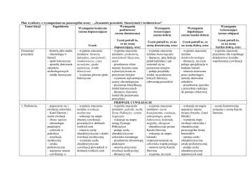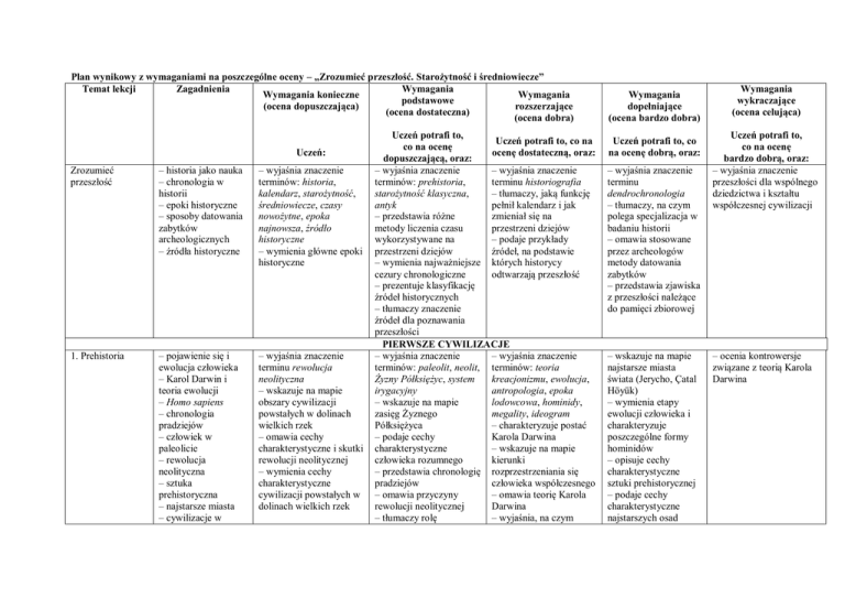 Plan wynikowy z wymaganiami na poszczególne oceny – „Zrozumieć przeszłość. Starożytność i średniowiecze” Temat lekcji Zagadnienia Wymagania Wymagania konieczne Wymagania podstawowe (ocena dopuszczająca) rozszerzające (ocena dostateczna) (ocena dobra) Uczeń: Zrozumieć przeszłość – historia jako nauka – chronologia w historii – epoki historyczne – sposoby datowania zabytków archeologicznych – źródła historyczne – wyjaśnia znaczenie terminów: historia, kalendarz, starożytność, średniowiecze, czasy nowożytne, epoka najnowsza, źródło historyczne – wymienia główne epoki historyczne 1. Prehistoria – pojawienie się i ewolucja człowieka – Karol Darwin i teoria ewolucji – Homo sapiens – chronologia pradziejów – człowiek w paleolicie – rewolucja neolityczna – sztuka prehistoryczna – najstarsze miasta – cywilizacje w – wyjaśnia znaczenie terminu rewolucja neolityczna – wskazuje na mapie obszary cywilizacji powstałych w dolinach wielkich rzek – omawia cechy charakterystyczne i skutki rewolucji neolitycznej – wymienia cechy charakterystyczne cywilizacji powstałych w dolinach wielkich rzek Uczeń potrafi to, Uczeń potrafi to, co na co na ocenę ocenę dostateczną, oraz: dopuszczającą, oraz: – wyjaśnia znaczenie – wyjaśnia znaczenie terminów: prehistoria, terminu historiografia starożytność klasyczna, – tłumaczy, jaką funkcję antyk pełnił kalendarz i jak – przedstawia różne zmieniał się na metody liczenia czasu przestrzeni dziejów wykorzystywane na – podaje przykłady przestrzeni dziejów źródeł, na podstawie – wymienia najważniejsze których historycy cezury chronologiczne odtwarzają przeszłość – prezentuje klasyfikację źródeł historycznych – tłumaczy znaczenie źródeł dla poznawania przeszłości PIERWSZE CYWILIZACJE – wyjaśnia znaczenie – wyjaśnia znaczenie terminów: paleolit, neolit, terminów: teoria Żyzny Półksiężyc, system kreacjonizmu, ewolucja, irygacyjny antropologia, epoka – wskazuje na mapie lodowcowa, hominidy, zasięg Żyznego megality, ideogram Półksiężyca – charakteryzuje postać – podaje cechy Karola Darwina charakterystyczne – wskazuje na mapie człowieka rozumnego kierunki – przedstawia chronologię rozprzestrzeniania się pradziejów człowieka współczesnego – omawia przyczyny – omawia teorię Karola rewolucji neolitycznej Darwina – tłumaczy rolę – wyjaśnia, na czym Wymagania dopełniające (ocena bardzo dobra) Uczeń potrafi to, co na ocenę dobrą, oraz: – wyjaśnia znaczenie terminu dendrochronologia – tłumaczy, na czym polega specjalizacja w badaniu historii – omawia stosowane przez archeologów metody datowania zabytków – przedstawia zjawiska z przeszłości należące do pamięci zbiorowej – wskazuje na mapie najstarsze miasta świata (Jerycho, Çatal Höyük) – wymienia etapy ewolucji człowieka i charakteryzuje poszczególne formy hominidów – opisuje cechy charakterystyczne sztuki prehistorycznej – podaje cechy charakterystyczne najstarszych osad Wymagania wykraczające (ocena celująca) Uczeń potrafi to, co na ocenę bardzo dobrą, oraz: – wyjaśnia znaczenie przeszłości dla wspólnego dziedzictwa i kształtu współczesnej cywilizacji – ocenia kontrowersje związane z teorią Karola Darwina dolinach wielkich rzek – powstanie cywilizacji 2. Mezopotamia i jej dzieje – warunki naturalne Mezopotamii – pochodzenie Sumerów – cywilizacja Sumerów – imperium Akadów – Babilonia i jej dzieje – Kodeks Hammurabiego – Asyria i jej dzieje – społeczeństwa i państwa Mezopotamii – wierzenia religijne i osiągnięcia cywilizacyjne ludów Mezopotamii – pismo klinowe – architektura i sztuka Mezopotamii – wyjaśnia znaczenie terminów: Międzyrzecze, Sumerowie, kodeks, Kodeks Hammurabiego, politeizm, pismo klinowe – charakteryzuje postać Hammurabiego – wskazuje na mapie obszar Międzyrzecza – wymienia cechy charakterystyczne cywilizacji Sumerów – wyjaśnia znaczenie pisma dla rozwoju cywilizacji Mezopotamii 3. Cywilizacja egipska – warunki naturalne Egiptu – początki cywilizacji – wyjaśnia znaczenie terminów: faraon, piramida, mumifikacja, pierwszych miast – opisuje przyczyny powstania cywilizacji w dolinach wielkich rzek – wymienia i omawia etapy powstania cywilizacji w dolinach wielkich rzek – wyjaśnia znaczenie terminów: zikkurat, imperium, Babilon, Asyria – określa czas: rozwoju cywilizacji Sumerów (IV–III tysiąclecie p.n.e.), spisania Kodeksu Hammurabiego (XVIII w. p.n.e.) – charakteryzuje postać Sargona Wielkiego – wskazuje na mapie siedziby Sumerów, Babilon – opisuje warunki naturalne Mezopotamii – przedstawia panowanie Hammurabiego – omawia Kodeks Hammurabiego – podaje cechy charakterystyczne państw i społeczeństw Mezopotamii – wymienia osiągnięcia cywilizacyjne ludów Międzyrzecza – wyjaśnia znaczenie terminów: katarakta, wezyr, „Księga polegała ewolucja człowieka – opisuje tryb życia społeczeństw w paleolicie miejskich – wyjaśnia znaczenie terminów: Akadowie, prawo talionu, muszkeni – charakteryzuje postać Nabuchodonozora II – wskazuje na mapie Akad, Asyrię, największy zasięg państw: babilońskiego i asyryjskiego – omawia okoliczności powstania i cechy charakterystyczne imperium akadyjskiego – określa kierunki ekspansji Babilonii i Asyrii – przedstawia okoliczności powstania oraz upadku imperiów: babilońskiego i asyryjskiego – opisuje wierzenia religijne ludów Mezopotamii – charakteryzuje architekturę i sztukę Mezopotamii – wyjaśnia znaczenie terminów: nom, nomarcha, Hetyci, pismo – wyjaśnia znaczenie terminu „Epos o Gilgameszu” – określa czas rozwoju poszczególnych cywilizacji na terenie Mezopotamii oraz daty: zdobycia Babilonu przez Persów (539 r. p.n.e.), upadku Asyrii (614 r. p.n.e.) – charakteryzuje postać Asurbanipala – wymienia et