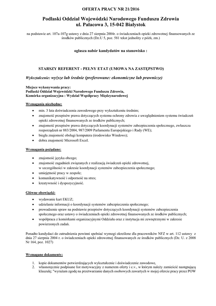 OFERTA PRACY NR 21/2016 Podlaski Oddział Wojewódzki Narodowego Funduszu Zdrowia ul. Pałacowa 3, 15-042 Białystok na podstawie art. 107a-107g ustawy z dnia 27 sierpnia 2004r. o świadczeniach opieki zdrowotnej finansowanych ze środków publicznych (Dz.U 5, poz. 581 tekst jednolity z późń, zm.) ogłasza nabór kandydatów na stanowisko : STARSZY REFERENT - PEŁNY ETAT (UMOWA NA ZASTĘPSTWO) Wykształcenie: wyższe lub średnie (preferowane: ekonomiczne lub prawnicze) Miejsce wykonywania pracy: Podlaski Oddział Wojewódzki Narodowego Funduszu Zdrowia, Komórka organizacyjna : Wydział Współpracy Międzynarodowej Wymagania niezbędne: min. 3 lata doświadczenia zawodowego przy wykształceniu średnim; znajomość przepisów prawa dotyczących systemu ochrony zdrowia z uwzględnieniem systemu świadczeń opieki zdrowotnej finansowanych ze środków publicznych; znajomość przepisów prawa dotyczących koordynacji systemów zabezpieczenia społecznego, zwłaszcza rozporządzeń nr 883/2004, 987/2009 Parlamentu Europejskiego i Rady (WE); biegła znajomość obsługi komputera (środowisko Windows); dobra znajomość Microsoft Excel. Wymagania pożądane: znajomość języka obcego; znajomość zagadnień związanych z realizacją świadczeń opieki zdrowotnej, w szczególności w zakresie koordynacji systemów zabezpieczenia społecznego; umiejętność pracy w zespole; komunikatywność i odporność na stres; kreatywność i dyspozycyjność. Główne obowiązki: wydawanie kart EKUZ; udzielanie informacji o koordynacji systemów zabezpieczenia społecznego; prowadzenie spraw na podstawie przepisów dotyczących koordynacji systemów zabezpieczenia społecznego oraz ustawy o świadczeniach opieki zdrowotnej finansowanych ze środków publicznych; współpraca z komórkami organizacyjnymi Oddziału oraz z instytucja mi zewnętrznymi w zakresie powierzonych zadań. Ponadto kandydaci do zatrudnienia powinni spełniać wymogi określone dla pracowników NFZ w art. 112 ustawy z dnia 27 sierpnia 2004 r. o świadczeniach opieki zdrowotnej finansowanych ze środków publicznych (Dz. U. z 2008 Nr 164, poz. 1027) Wymagane dokumenty: 1. 2. kopie dokumentów potwierdzających wykształcenie i doświadczenie zawodowe, własnoręcznie podpisane list motywacyjny z numerem oferty i c.v., w którym należy zamieścić następującą klauzulę; "wyrażam zgodę na przetwarzanie danych osobowych zawartych w mojej ofercie pracy przez POW NFZ, dla potrzeb niezbędnych do procesu rekrutacji – zgodnie z ustawą z dnia 29.08.1997 o ochronie danych osobowych" (Dz. U. z 2002 r. Nr 101 poz. 926 z późn. zm.), Dokumenty aplikacyjne należy składać w zamkniętej kopercie z dopiskiem: OFERTA PRACY NR 21/2016 osobiście w Kancelarii Oddziału lub przesłać listownie w terminie do 30.12.2016 r. (decyduje data wpływu do Oddziału) na adres: Podlaski Oddział Wojewódzki Narodowego Funduszu Zdrowia, ul. Pałacowa 3, 15-042 Białystok). Informacje telefoniczne pod nr: (0-85) 745–95–74 Pozostałe informacje: Oferty z niepełnymi bądź niepodpisanymi dokumentami, niezgodne z wymogami zawartymi w ogłoszeniu oraz otrzymane po terminie nie będą rozpatrywane (liczy się data wpływu do Podlaskiego Oddziału Wojewódzkiego NFZ), Kandydaci zakwalifikowani zostaną powiadomieni o terminie rozmowy wstępnej, Zgodnie z art. 107d oraz 107f ustawy z dnia 27 sierpnia 2004 r. o świadczeniach opieki zdrowotnej finansowanych ze środków publicznych listę kandydatów spełniających wymogi formalne określone w ogłoszeniu o naborze oraz wynik naboru ogłasza się w Biuletynie Informacji Publicznej na stronie :www. nfz-bialystok.pl oraz na tablicy ogłoszeń Podlaskiego Oddziału Wojewódzkiego Narodowego Funduszu Zdrowia, Oferty osób, które nie zostały wybrane na dane stanowisko w procesie rekrutacji, zostaną komisyjnie zniszczone, Dyrektor Oddziału zastrzega sobie prawo do odwołania postępowania rekrutacyjnego w każdym czasie, bez podania przyczyny.