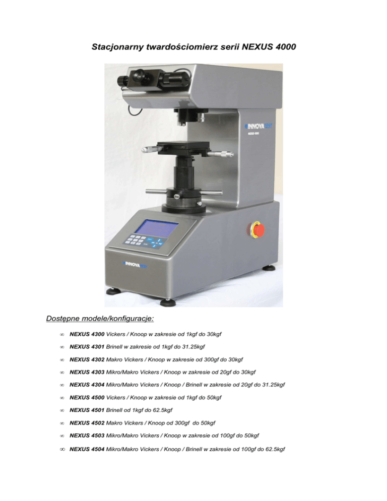 Stacjonarny twardościomierz serii NEXUS 4000 Dostępne modele/konfiguracje: • NEXUS 4300 Vickers / Knoop w zakresie od 1kgf do 30kgf • NEXUS 4301 Brinell w zakresie od 1kgf do 31.25kgf • NEXUS 4302 Makro Vickers / Knoop w zakresie od 300gf do 30kgf • NEXUS 4303 Mikro/Makro Vickers / Knoop w zakresie od 20gf do 30kgf • NEXUS 4304 Mikro/Makro Vickers / Knoop / Brinell w zakresie od 20gf do 31.25kgf • NEXUS 4500 Vickers / Knoop w zakresie od 1kgf do 50kgf • NEXUS 4501 Brinell od 1kgf do 62.5kgf • NEXUS 4502 Makro Vickers / Knoop od 300gf do 50kgf • NEXUS 4503 Mikro/Makro Vickers / Knoop w zakresie od 100gf do 50kgf • NEXUS 4504 Mikro/Makro Vickers / Knoop / Brinell w zakresie od 100gf do 62.5kgf SPECYFIKACJA TECHNIECZNA: model NEXUS 4300 NEXUS 4301 NEXUS 4302 NEXUS 4303 NEXUS 4304 NEXUS 4500 NEXUS 4501 NEXUS 4502 NEXUS 4503 NEXUS 4504 wybór siły obciążenia: procedura pomiaru: wielkość twardości: prędkość obciążania: wieżyczka: dokładność: wyświetlacz: rozdzielczość: konwersja do: normalizacja: obciążenia 1 - 2 – 2.5 - 3 - 4 - 5 - 10 - 20 - 30 Kgf 1 – 2 – 2.5 – 3 – 4 – 5 – 6.25 – 10 – 15.625 – 20 – 31.25 0.3 - 0.5 - 1 - 2 – 2.5 - 3 - 4 - 5 - 10 - 20 - 30 Kgf 0.02 – 0.025 – 0.05 – 0.1 – 0.2 – 0.3 – 0.5 – 1 – 2 – 2.5 – 3 – 4 – 5 – 10 – 20 - 30 0.02 – 0.025 – 0.05 – 0.1 – 0.2 – 0.3 – 0.5 – 1 – 2 – 2.5 – 3 – 4 – 5 – 6.25 – 10 – 15.625 – 20 – 30 – 31.25 1 - 2 – 2.5 - 3 - 4 - 5 - 10 - 20 - 30 - 50Kgf 1 – 2 – 2.5 – 3 – 4 – 5 – 6.25 – 10 – 15.625 – 20 – 31.25 – 62.5 kgf 0.3 - 0.5 - 1 - 2 – 2.5 - 3 - 4 - 5 - 10 - 20 - 30 – 50 Kgf 0.1 – 0.2 – 0.3 – 0.5 – 1 – 2 – 2.5 – 3 – 4 – 5 – 10 – 20 – 30 – 50kgf 0.1 – 0.2 – 0.3 – 0.5 – 1 – 2 – 2.5 – 3 – 4 – 5 – 6.25 – 10 – 15.625 – 20 – 30 – 31.25 – 62.5 kgf elektroniczny, poprzez kontrolowany system obwodu zamkniętego głowicy pomiarowej, wskazania w kgf oraz N wybór obciążenia w rozbudowanym menu urządzenia automatyczna, obciążanie/utrzymanie obciążenia/odciążanie 5 cyfrowa zmienna, w zależności od zastosowanego obciążenia 4 pozycje w 360º, w pełni zautomatyzowana, zapamiętywana pozycja początkowa, opcja dla 2 wgłębników i 2 obiektywów lub 1 wgłębnika i 3 obiektywów < +/-1% dla obciążenia od 100gr do 30kg, < +/-1,5% dla obciążenia poniżej100 gr długość przekątnych, wartość twardości, wartość twardości konwertowanej skali, wartość siły, status urządzenia 0.1 HV, HK i HB Rockwell, Rockwell Superficial, Brinell, Leeb i wytrzymałości na rozciąganie EN, ISO 6507, EN ISO 6506, EN ISO 4545, ASTM E-384, ASTM E-10-08, ASTM E384 statystyka: wynik pomiaru, max, min, średnia, zakres, odchylenie standardowe, wszystko w czasie rzeczywistym pomiaru opcje panelu operatora: start pomiaru, stop pomiaru, intensywność światła, czas obciążania, drukowanie, kasowanie, data, czas, skala i obciążenie, język oprogramowanie V2.01, język niemiecki, język angielski, język francuski (standardowo), V2.02, język sprzętowe: angielski, język włoski, język hiszpański pamięć: pamięć dla wykonywanych prób wyprowadzenie dwukierunkowy RS-232 danych: mechanizm w pełni automatyczny kontrolowany system obwodu zamkniętego ze sprzężeniem obciążania: czas obciążania: drukarka: okular mikroskopu: źródło światła: optyka: przestrzeń pionowa: przestrzeń pozioma: wymiary stolika: zakres działania: wymiary: waga: zasilanie: pobór prądu: zwrotnym, obciążanie/utrzymanie obciążenia/odciążanie wartość domyślna 10 sekund, użytkownik określa od 1 do 99 sekund wbudowana, cicha, szybka drukarka termiczna podwójny okular z 15x powiększeniem, dokładność 0,1um odczytu halogen 12V, 30 wat, zielony, przyciemniony filtr 2 rozwiązania: okular lub kamera video maksymalna wysokość 160mm od środka 135mm 100x100mm, przesuw 20x20mm, odczyt co 0,01mm temperatura: od 5°C do 40°C (+/-20° dla obciążenia 25gr i 50gr) wilgotność: od 10 do 90%, bez skraplania 220 x 540 x 650mm 51kg Od 100V AC do 240V AC, 50/60Hz, 390W Standardowa dostawa zawiera: • Jednostka główna • Stolik pomiarowy XYZ z mikrometrem • Kowadełko płaskie 60mm • Obiektywy 5x, 10x, 20x lub 10x, 20x, 40x • Cyfrowy okular 15x • Wbudowaną drukarka termiczna • Port RS-232 • Nastawne nóżki (4 sztuki) • Poziomica • Wzorzec twardości Vickersa • Zapasowe żarówki 12V-30W • Zapasowe bezpieczniki (2 sztuki) • Instrukcja obsługi standardowo w języku polskim • Certyfikat Innovatest Opcje dodatkowe: • Systemy video INNOVAVIEW® • Zmotoryzowany stolik pomiarowy XYZ • Zmotoryzowany stolik pomiarowy XY • Certyfikowane wgłębniki i wzorce twardości • Zestaw funkcjonalnego doposażenia: imadło, uchwyt, zacisk • Solidny stolik pod twardościomierz wraz z szafką