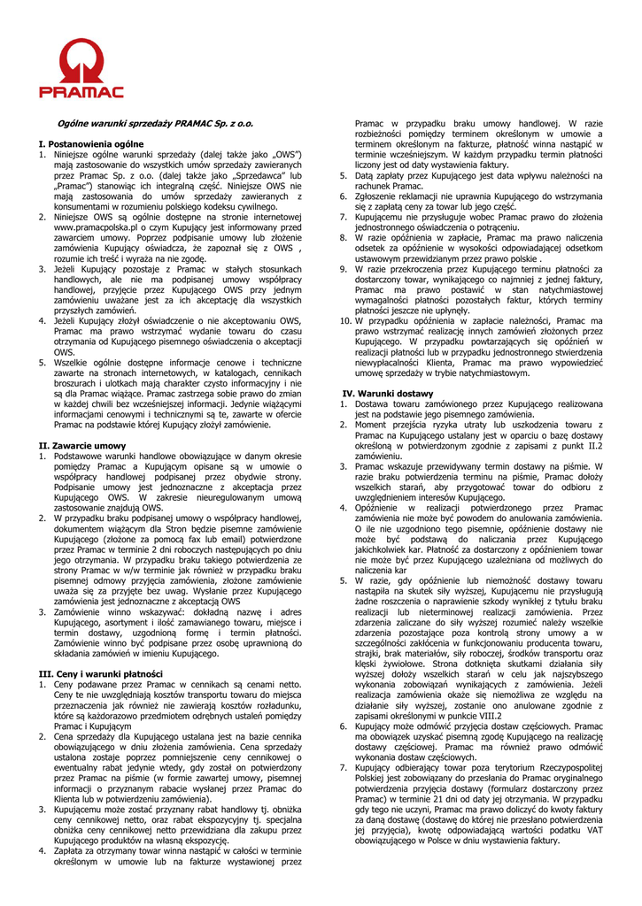 Ogólne warunki sprzedaży PRAMAC Sp. z o.o. I. Postanowienia ogólne 1. Niniejsze ogólne warunki sprzedaży (dalej także jako „OWS”) mają zastosowanie do wszystkich umów sprzedaży zawieranych przez Pramac Sp. z o.o. (dalej także jako „Sprzedawca” lub „Pramac”) stanowiąc ich integralną część. Niniejsze OWS nie mają zastosowania do umów sprzedaży zawieranych z konsumentami w rozumieniu polskiego kodeksu cywilnego. 2. Niniejsze OWS są ogólnie dostępne na stronie internetowej www.pramacpolska.pl o czym Kupujący jest informowany przed zawarciem umowy. Poprzez podpisanie umowy lub złożenie zamówienia Kupujący oświadcza, że zapoznał się z OWS , rozumie ich treść i wyraża na nie zgodę. 3. Jeżeli Kupujący pozostaje z Pramac w stałych stosunkach handlowych, ale nie ma podpisanej umowy współpracy handlowej, przyjęcie przez Kupującego OWS przy jednym zamówieniu uważane jest za ich akceptację dla wszystkich przyszłych zamówień. 4. Jeżeli Kupujący złożył oświadczenie o nie akceptowaniu OWS, Pramac ma prawo wstrzymać wydanie towaru do czasu otrzymania od Kupującego pisemnego oświadczenia o akceptacji OWS. 5. Wszelkie ogólnie dostępne informacje cenowe i techniczne zawarte na stronach internetowych, w katalogach, cennikach broszurach i ulotkach mają charakter czysto informacyjny i nie są dla Pramac wiążące. Pramac zastrzega sobie prawo do zmian w każdej chwili bez wcześniejszej informacji. Jedynie wiążącymi informacjami cenowymi i technicznymi są te, zawarte w ofercie Pramac na podstawie której Kupujący złożył zamówienie. II. Zawarcie umowy 1. Podstawowe warunki handlowe obowiązujące w danym okresie pomiędzy Pramac a Kupującym opisane są w umowie o współpracy handlowej podpisanej przez obydwie strony. Podpisanie umowy jest jednoznaczne z akceptacja przez Kupującego OWS. W zakresie nieuregulowanym umową zastosowanie znajdują OWS. 2. W przypadku braku podpisanej umowy o współpracy handlowej, dokumentem wiążącym dla Stron będzie pisemne zamówienie Kupującego (złożone za pomocą fax lub email) potwierdzone przez Pramac w terminie 2 dni roboczych następujących po dniu jego otrzymania. W przypadku braku takiego potwierdzenia ze strony Pramac w w/w terminie jak również w przypadku braku pisemnej odmowy przyjęcia zamówienia, złożone zamówienie uważa się za przyjęte bez uwag. Wysłanie przez Kupującego zamówienia jest jednoznaczne z akceptacją OWS 3. Zamówienie winno wskazywać: dokładną nazwę i adres Kupującego, asortyment i ilość zamawianego towaru, miejsce i termin dostawy, uzgodnioną formę i termin płatności. Zamówienie winno być podpisane przez osobę uprawnioną do składania zamówień w imieniu Kupującego. III. Ceny i warunki płatności 1. Ceny podawane przez Pramac w cennikach są cenami netto. Ceny te nie uwzględniają kosztów transportu towaru do miejsca przeznaczenia jak również nie zawierają kosztów rozładunku, które są każdorazowo przedmiotem odrębnych ustaleń pomiędzy Pramac i Kupującym 2. Cena sprzedaży dla Kupującego ustalana jest na bazie cennika obowiązującego w dniu złożenia zamówienia. Cena sprzedaży ustalona zostaje poprzez pomniejszenie ceny cennikowej o ewentualny rabat jedynie wtedy, gdy został on potwierdzony przez Pramac na piśmie (w formie zawartej umowy, pisemnej informacji o przyznanym rabacie wysłanej przez Pramac do Klienta lub w potwierdzeniu zamówienia). 3. Kupującemu może zostać przyznany rabat handlowy tj. obniżka ceny cennikowej netto, oraz rabat ekspozycyjny tj. specjalna obniżka ceny cennikowej netto przewidziana dla zakupu przez Kupującego produktów na własną ekspozycję. 4. Zapłata za otrzymany towar winna nastąpić w całości w terminie określonym w umowie lub na fakturze wystawionej przez 5. 6. 7. 8. 9. 10. Pramac w przypadku braku umowy handlowej. W razie rozbieżności pomiędzy terminem określonym w umowie a terminem określonym na fakturze, płatność winna nastąpić w terminie wcześniejszym. W każdym przypadku termin płatności liczony jest od daty wystawienia faktury. Datą zapłaty przez Kupującego jest data wpływu należności na rachunek Pramac. Zgłoszenie reklamacji nie uprawnia Kupującego do wstrzymania się z zapłatą ceny za towar lub jego część. Kupującemu nie przysługuje wobec Pramac prawo do złożenia jednostronnego oświadczenia o potrąceniu. W razie opóźnienia w zapłacie, Pramac ma prawo naliczenia odsetek za opóźnienie w wysokości odpowiadającej odsetkom ustawowym przewidzianym przez prawo polskie . W razie przekroczenia przez Kupującego terminu płatności za dostarczony towar, wynikającego co najmniej z jednej faktury, Pramac ma prawo postawić w stan natychmiastowej wymagalności płatności pozostałych faktur, których terminy płatności jeszcze nie upłynęły. W przypadku opóźnienia w zapłacie należności, Pramac ma prawo wstrzymać realizację innych zamówień złożonych przez Kupującego. W przypadku powtarzających się opóźnień w realizacji płatności lub w przypadku jednostronnego stwierdzenia niewypłacalności Klienta, Pramac ma prawo wypowiedzieć umowę sprzedaży w trybie natychmiastowym. IV. Warunki dostawy 1. Dostawa towaru zamówionego przez Kupującego realizowana jest na podstawie jego pisemnego zamówienia. 2. Moment przejścia ryzyka utraty lub uszkodzenia towaru z Pramac na Kupującego ustalany jest w oparciu o bazę dostawy określoną w potwierdzonym zgodnie z zapisami z punkt II.2 zamówieniu. 3. Pramac wskazuje przewidywany termin dostawy na piśmie. W razie braku potwierdzenia terminu na piśmie, Pramac dołoży wszelkich starań, aby przygotować towar do odbioru z uwzględnieniem interesów Kupującego. 4. Opóźnienie w realizacji potwierdzonego przez Pramac zamówienia nie może być powodem do anulowania zamówienia. O ile nie uzgodniono tego pisemnie, opóźnienie dostawy nie może być podstawą do naliczani