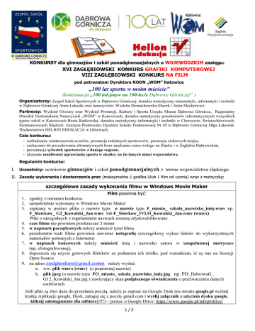 KONKURSY dla gimnazjów i szkół ponadgimnazjalnych o WOJEWÓDZKIM zasięgu: XVI ZAGŁĘBIOWSKI KONKURS GRAFIKI KOMPUTEROWEJ VIII ZAGŁĘBIOWSKI KONKURS NA FILM pod patronatem Dyrektora RODN „WOM” Katowice „100 lat sportu w moim mieście” (kontynuacja „100 inicjatyw na 100-lecie Dąbrowy Górniczej” ) Organizatorzy: Zespół Szkół Sportowych w Dąbrowie Górniczej: doradca metodyczny matematyki, informatyki i techniki w Dąbrowie Górniczej Anna Łukasik oraz nauczyciele: Wioletta Domachowska-Macek i Anna Mackiewicz. Partnerzy: Wydział Oświaty oraz Wydział Promocji, Kultury i Sportu Urzędu Miasta Dąbrowa Górnicza, Regionalny Ośrodek Doskonalenia Nauczycieli „WOM” w Katowicach, doradca metodyczny przedmiotów informatycznych wszystkich typów szkół w Katowicach Beata Rutkowska, doradca metodyczny informatyki i techniki w Chorzowie, Świętochłowicach, Siemianowicach Śląskich Grażyna Piotrowska Dyrektor Szkoły Podstawowej Nr 10 w Dąbrowie Górniczej Olga Łakomik, Wydawnictwo HELION EDUKACJA w Gliwicach. Cele konkursu: - rozbudzanie zainteresowań uczniów, promocja rodzimych sportowców, promocja ciekawych miejsc, - zachęcanie do poszukiwania alternatywnych form spędzania czasu wolego na Śląsku i w Zagłębiu Dąbrowskim, - prezentacja sylwetek sportowców z danego regionu, - ukazanie możliwości uprawiania sportu w okolicy na tle innych miast województwa. Regulamin konkursu: I. Uczestnicy: uczniowie gimnazjów i szkół ponadgimnazjalnych z terenu województwa śląskiego. II. Zasady wykonania i dostarczania prac (maksymalnie 1 grafika i/lub 1 film od ucznia) wraz z metryczką: szczegółowe zasady wykonania filmu w Windows Movie Maker Film powinna być: 1. zgodny z tematem konkursu 2. samodzielnie wykonany w Windows Movie Maker 3. zapisany w postaci pliku o nazwie typu o nazwie typu F_miasto_ szkoła_nazwisko_imię.wmv np. F_Slawkow_ G2_Kowalski_Jan.wmv lub F_Slawkow_IVLO_Kowalski_Jan.wmv (wmvx) Pliki o niezgodnych z regulaminem nazwach zostaną zdyskwalifikowane. 4. czas filmu nie powinien przekraczać 2 minut 5. w napisach początkowych należy umieścić tytuł filmu 6. przedostatni kadr filmu powinien zawierać netografię (szczegółowy wykaz linków do wykorzystanych materiałów pobranych z Internetu) 7. w napisach końcowych należy umieścić imię i nazwisko autora w uzupełnionej metryczce (np. sfotografowanej), 8. dopuszcza się użycie gotowych filmików za podaniem ich źródła, pod warunkiem, iż są one na licencji Open Source. 9. na adres [email protected] należy wysłać: a. ww. plik wmvx (wmv) (o poprawnej nazwie) b. plik jpeg (o nazwie typu FO_miasto_ szkoła_nazwisko_imię.jpg np. FO_DabrowaG_ G12_Kowalski_Jan.jpg ) zawierający skan podpisanego oświadczenia o przetwarzaniu danych osobowych Jeśli pliki są zbyt duże do przesłania pocztą, należy je zapisać na Google Dysk (na stronie google.pl wciśnij kratkę Aplikacje google, Dysk, zaloguj się z poczty gmail.com i wyślij załącznik z użyciem dysku google, kliknij udostępnienie dla odbiorcy!!!) – pomoc o Google Drive: https://www.google.pl/intl/pl/drive/ 1/3 szczegółowe zasady wykonania grafiki komputerowej w Gimp Prace graficzne powinny być: 1. zgodna z tematem konkursu 2. wykonane samodzielnie w edytorze grafiki komputerowej Gimp w rozdzielczości 1200x850 px (pikseli) 3. zapisane jako plik w Gimp z zachowanymi warstwami o rozszerzeniu xcf o nazwie typu G_miasto_ szkoła_nazwisko_imię.xcf np: G_Katowice_ G2_Kowalski_Jan.xcf lub G_Bedzin_IILO_Zych_Ala.xcf 4. dodatkowo wyeksportowane jako plik jpeg o nazwie typu G_ miasto_ szkoła_nazwisko_imię.jpg np.: G_Katowice_ G2_Kowalski_Jan.jpg lub G_Bedzin_IILO_Zych_Ala.jpg 5. nie mogą być podpisane bezpośrednio na obrazku 6. w wypadku fotomontażu należy dołączyć: a. oryginalne zdjęcia własnego autorstwa i oświadczenie o samodzielnym wykonaniu zdjęć b. link do zdjęcia z Internetu wykorzystanego do fotomontażu (w tabeli w metryczce) oraz oświadczenie, że fotomontaż został wykonany samodzielnie i uczeń nie narusza praw autorskich (zdjęcie jest na licencji np. Open Source; gdzie szukać darmowych zdjęć: http://eredaktor.pl/fotografia-i-grafika/gdzie-szukac-darmowych-zdjec/ ) c. użycie ww. zdjęcia jest możliwe pod warunkiem poddania go twórczej obróbce. 7. należy wysłać na adres: [email protected] a. ww. plik jpeg zawierający grafikę (o poprawnej nazwie) b. ww. plik xcf z zachowanymi warstwami c. użyte do fotomontażu zdjęcia jako pliki jpeg (maksymalnie 6 sztuk) d. jeden plik jpeg (o nazwie typu GMO_miasto_ szkoła_nazwisko_imię.jpg np. GMO_DabrowaG_ IIILO_Kowalski_Jan.jpg ) zawierający skan: podpisanego oświadczenia o przetwarzaniu danych osobowych i uzupełnionej metryczki z linkami do użytych stron internetowych, z której pochodzą wykorzystane w pracy materiały Jeśli pliki są zbyt duże do przesłania pocztą, należy je zapisać na Google Dysk (na stronie google.pl wciśnij kratkę Aplikacje google, Dysk, zaloguj się z poczty gmail.com i wyślij załącznik z użyciem dysku google, kliknij udostępnienie dla odbiorcy!!!) – pomoc o Google Drive: https://www.google.pl/intl/pl/drive/ METRYCZKA - należy uzupełnić oraz: - do grafiki: zeskanować łącznie z oświadczeniem o danych osobowych i wysłać jako plik jpeg zgodnie z regulaminem - do filmu: wstawić jako zdjęcie w ostatnim kadrze filmu (napisy końcowe) imię nazwisko klasa autora klasa (poziom), szkoła adres szkoły, nr telefonu imię nazwisko nauczyciela (opiekuna) telefon kontaktowy i adres e-mail opiekuna Koniecznie!!! wykorzystane linki nazwa pliku stanowiącego pracę zgodna z wytycznymi w regulaminie (w tym rozszerzenie) III. Wraz z pracami nauczyciel powinien przesłać w treści e-maila (nie jako załącznik): ZESTAWIENIE PRAC wysłanych przez szkołę na konkurs „Zagłębiowski Konkurs Grafiki Komputerowej” /„Zagłębiowski Konkurs na Film” (niepotrzebne skreślić) szkoła:..................