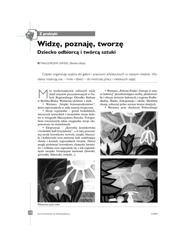 Z praktyki Widz´, poznaj´, tworz´ Dziecko odbiorcà i twórcà sztuki ■ MA¸GORZATA SAMSEL (Bielsko-Bia∏a) Cz´sto organizuj´ wyjÊcia do galerii i pracowni artystycznych w naszym mieÊcie. Wystawy inspirujà nas – mnie i dzieci – do twórczej pracy i ciekawych zaj´ç. M oi wychowankowie zobaczyli wiele dzie∏ artystów prezentowanych w Galerii Regionalnego OÊrodka Kultury w Bielsku-Bia∏ej. Wymieni´ niektóre z nich. • Wystawa „Szopki bo˝onarodzeniowe”, która wprowadza∏a w mi∏y nastrój Êwiàteczny. • Stroje regionalne – górali beskidzkich, mieszczek ˝ywieckich i cieszyƒskie stroje ludowe w fotografii Mieczys∏awa Peterka. Fotografiom towarzyszy∏y tak˝e oryginalne stroje eksponowane na manekinach. • Ekspozycja – „Koronka koniakowska i beskidzki haft krzy˝ykowy”, a w niej przecudnej urody koronkowe serwety, czepki, bluzeczki i ko∏nierzyki oraz misterny haft ozdabiajàcy chusty i koszule regionalnych strojów. Dzieci mog∏y podziwiaç koronkowe elementy kwiatowe i roÊlinne oraz zapozna∏y si´ z ich regionalnymi swojsko brzmiàcymi nazwami (kwiotki, gwiozdki, Êlimoczki, zwijoki...). • Wystawa „Patroni Polski i Europy w sztuce ludowej” przedstawiajàca rzeêby, p∏askorzeêby i obrazy twórców ludowych z regionu Podbeskidzia, Âlàska, Zakopanego i okolic. MieliÊmy okazj´ zobaczyç pe∏ne wyrazu twarze Êwi´tych. • Wystawa prac s∏uchaczy Policealnego Witra˝owe pory roku 218 WYCHOWANIE W PRZEDSZKOLU 4/2003 Z praktyki Studium Zawodowego Plastycznego „OPUS-ART” w Sosnowcu pt.: „Witra˝e”. Moje starszaki wiedzà, ˝e witra˝e mo˝na spotkaç w koÊcio∏ach, sklepach z lampami i w oknach zaprzyjaênionego Przedszkola nr 11. • Pejza˝e wyobraêni – wystawa grafiki komputerowej autorstwa Ma∏gorzaty ¸uszczak. Po jej obejrzeniu dzieci na goràco dzieli∏y si´ wra˝eniami: ... To kryszta∏ w jaskini Ênie˝nej, który czeka na odkrywc´. ... To wrak statku, pod wodà przele˝a∏ wiele lat. ... Obraz przypomina mi suche trawy, które targa wiatr. ... Ja widz´ Êlady dinozaurów pozostawione tu przed wiekami. ... A to pustynia, na której wiatr przewala piasek. Przedszkolaki przebywajàc w Galerii Regionalnego OÊrodka Kultury uczy∏y si´ obcowaç ze sztukà. Skupia∏y wzrok na eksponatach, s∏ucha∏y informacji komisarza oprowadzajàcego po wystawie. Zawsze otrzymywaliÊmy kolorowe foldery, które gromadziliÊmy w specjalnym segregatorze. Dzieci ch´tnie przeglàda∏y je i pokazywa∏y rodzicom. Niecodziennym prze˝yciem estetycznym by∏ dla dzieci pobyt i zabawa w Beskidzkim Centrum Zabawkarstwa Ludowego w Bielsku-Bia∏ej. Zaj´cia prowadzi∏a etnograf mgr Kazimiera Kojm, znawczyni dawnego ˝ycia górali beskidzkich. Pokaza∏a dzieciom drewniane koniki, ptaki-klepaki, wózki, ko∏yski, karuzele i kurki, gliniane okaryny ró˝nych kszta∏tów i kolorów, szmaciane lalki. DowiedzieliÊmy si´, ˝e zabawki wykonywali w∏asnor´cznie swoim dzieciom rodzice, dziadkowie, starsze rodzeƒstwo. Dzieci potrafi∏y si´ nimi bawiç ca∏ymi godzinami, wczuwajàc si´ w ró˝ne role i przedstawiajàc sceny z ˝ycia ludzi doros∏ych. Pani Kazia pozwoli∏a pobawiç si´ tymi niezwyk∏ymi zabawkami. Zabawa nimi sprawi∏a dzieciom prawdziwà radoÊç. Po powrocie do przedszkola rysowa∏y zabawk´, która najbardziej im si´ spodoba∏a. Wszystkie wystawy inspirowa∏y nas – mnie i dzieci – do twórczej pracy i ciekawych zaj´ç. Kol´dnicy – rzeêba Józefa Szypu∏y go, Apoloniusza K´dzierskiego, Jacka Malczewskiego, Wojciecha Weissa, Tadeusza Makowskiego, Witolda Wojtkiewicza i innych, które zebra∏a i opublikowa∏a Hanna Kubaszewska w publikacji pt.: Dziecko w malarstwie. Dzieci rozmawia∏y o obrazach, nazywa∏y kolory u˝yte przez malarza, okreÊla∏y emocje, jakie wyra˝ajà dzie∏a, szuka∏y podobieƒstw i ró˝nic. Starszaki z przygotowanych literek u∏o˝y∏y napis „gale- W galerii W pochmurny dzieƒ zaprosi∏am dzieci starsze do zorganizowanej przeze mnie galerii. Znalaz∏y si´ w niej reprodukcje obrazów znanych polskich malarzy: Olgi Boznaƒskiej, Stanis∏awa Wyspiaƒskiego, Piotra Micha∏owskie4/2003 Anio∏ – rzeêba Ma∏gorzaty Gabryel WYCHOWANIE W PRZEDSZKOLU 219 Z praktyki Starszaki lepià z gliny ceramicznej ria”. To by∏o bardzo ciekawe spotkanie z obrazami znakomitych polskich malarzy. Same przedszkolaki by∏y twórcami licznych wystaw swoich prac, wykonywanych ró˝nymi technikami plastycznymi, takimi jak: wydzieranka, wycinanka, stemplowanie, malowanie akwarelami, farbami plakatowymi i inne. Specjalna tablica w holu na pierwszym pi´trze by∏a przeznaczona na prace plastyczne moich wychowanków. Z tygodniowà regularnoÊcià zmienia∏a si´ jej tematyka, a z nià kolorystyka i nastrój. Na stoliku umieszczonym w holu prezentowaliÊmy prace przestrzenne, np.: z plasteliny i materia∏u przyrodniczego, z gliny ceramicznej. Cieszy∏y one nie tylko rodziców i osoby odwiedzajàce przedszkole, ale i samych autorów. Prosz´ pani, lubi´ te nasze sale... – wyzna∏ kiedyÊ Dominik. Dlaczego? – Bo sà mi∏e i kolorowe i takie nasze.... To prawda – dzieci czu∏y si´ gospodarzami. To poczucie do- dawa∏o im powagi i uczy∏o odpowiedzialnoÊci za estetyk´ sal. Ka˝de z nich stara∏o si´ wykonywaç swojà prac´ najlepiej, jak umia∏o, by po prostu by∏o ∏adnie, a co za tym idzie i mi∏o. Niektóre zaproponowane techniki plastyczne i sytuacje estetyczne zas∏ugujà na opisanie. Malowanie klejem witra˝owym by∏o zupe∏nà nowoÊcià nie tylko dla dzieci, dla mnie tak˝e. Po przeczytaniu instrukcji przystàpiliÊmy do pracy etapami. Najpierw czarnà konturówkà dzieci rysowa∏y na folii kontur po Êladzie, a odwa˝niejsze rysowa∏y kontur samodzielnie. Nazajutrz kolorowym klejem witra˝owym wype∏nialiÊmy przestrzenie mi´dzy konturami. Dopiero na trzeci dzieƒ, po wyschni´ciu, umieÊciliÊmy prace na szybach okien naszej sali. Tak pow