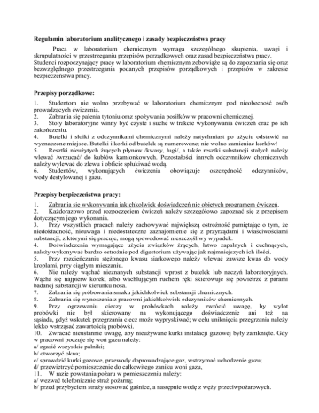 Regulamin laboratorium analitycznego i zasady bezpieczeństwa pracy Praca w laboratorium chemicznym wymaga szczególnego skupienia, uwagi i skrupulatności w przestrzeganiu przepisów porządkowych oraz zasad bezpieczeństwa pracy. Studenci rozpoczynający pracę w laboratorium chemicznym zobowiąże są do zapoznania się oraz bezwzględnego przestrzegania podanych przepisów porządkowych i przepisów w zakresie bezpieczeństwa pracy. Przepisy porządkowe: 1. Studentom nie wolno przebywać w laboratorium chemicznym pod nieobecność osób prowadzących ćwiczenia. 2. Zabrania się palenia tytoniu oraz spożywania posiłków w pracowni chemicznej. 3. Stoły laboratoryjne winny być czyste i suche w trakcie wykonywania ćwiczeń oraz po ich zakończeniu. 4. Butelki i słoiki z odczynnikami chemicznymi należy natychmiast po użyciu odstawić na wyznaczone miejsce. Butelki i korki od butelek są numerowane; nie wolno zamieniać korków! 5. Resztki nieużytych żrących płynów /kwasy, ługi/, a także resztki substancji stałych należy wlewać /wrzucać/ do kubłów kamionkowych. Pozostałości innych odczynników chemicznych należy wylewać do zlewu i obficie spłukiwać wodą. 6. Studentów, wykonujących ćwiczenia obowiązuje oszczędność odczynników, wody destylowanej i gazu. Przepisy bezpieczeństwa pracy: 1. Zabrania się wykonywania jakichkolwiek doświadczeń nie objętych programem ćwiczeń. 2. Każdorazowo przed rozpoczęciem ćwiczeń należy szczegółowo zapoznać się z przepisem dotyczącym jego wykonania. 3. Przy wszystkich pracach należy zachowywać największą ostrożność pamiętając o tym, że niedokładność, nieuwaga i niedostateczne zaznajomienie się z przyrządami i właściwościami substancji, z którymi się pracuje, mogą spowodować nieszczęśliwy wypadek. 4. Doświadczenia wymagające użycia związków żrących, łatwo zapalnych i cuchnących, należy wykonywać bardzo ostrożnie pod digestorium używając jak najmniejszych ich ilości. 5. Przy rozcieńczaniu stężonego kwasu siarkowego należy wlewać zawsze kwas do wody kroplami, przy ciągłym mieszaniu. 6. Nie należy wąchać nieznanych substancji wprost z butelek lub naczyń laboratoryjnych. Wącha się najpierw korek, albo wachlującym ruchem ręki skierowuje się powietrze z parami badanej substancji w kierunku nosa. 7. Zabrania się próbowania smaku jakichkolwiek substancji chemicznych. 8. Zabrania się wynoszenia z pracowni jakichkolwiek odczynników chemicznych. 9. Przy ogrzewaniu cieczy w probówkach należy zwrócić uwagę, by wylot probówki nie był skierowany na wykonującego doświadczenie ani też na sąsiada, gdyż wskutek przegrzania ciecz może wypryskiwać; w celu uniknięcia przegrzania należy lekko wstrząsać zawartością probówki. 10. Zwracać nieustannie uwagę, aby nieużywane kurki instalacji gazowej były zamknięte. Gdy w pracowni poczuje się woń gazu należy: a/ zgasić wszystkie palniki; b/ otworzyć okna; c/ sprawdzić kurki gazowe, przewody doprowadzające gaz, wstrzymać uchodzenie gazu; d/ przewietrzyć pomieszczenie do całkowitego zaniku woni gazu, 11. W razie powstania pożaru w pomieszczeniu należy: a/ wezwać telefonicznie straż pożarną; b/ przed przybyciem straży stosować gaśnice, a następnie wodę z węży przeciwpożarowych. c/ jeżeli zapalą się przewody elektryczne nie stosować wody i gaśnic płynowych przed wyłączeniem dopływu prądu. 12. Jeżeli zapali się odzież: a/ nie biec b/ gasić płomień przez owinięcie ciała kocem azbestowym lub innym. Pierwsza pomoc w nagłych wypadkach Rany cięte: Odkazić ranę wodą utlenioną, nałożyć na ranę gazę opatrunkową, watę i zabandażować. Oparzenia: Na miejsce oparzone nałożyć okład z alkoholu etylowego. Oparzenie skóry kwasem lub zasadą:. Miejsce oparzone obmyć dużą ilością wody, a następnie w przypadku oparzenia kwasami - roztworem NaHCO3; w przypadku oparzenia zasadami - 1 % roztworem kwasu octowego. Zatrucie kwasem lub zasadą: Pić mleko, wezwać lekarza. Zanieczyszczenia oczu płynem lub sproszkowaną substancją: Oczy przemyć dużą ilością wody i natychmiast udać się na Stację Pogotowia Ratunkowego. Zatrucia gazami: Zatrutemu udostępnić dopływ świeżego powietrza i pozostawić w spokoju. Wezwać lekarza. Omdlenia: Udostępnić dopływ świeżego powietrza, rozluźnić odzież i ewentualnie wezwać lekarza.
