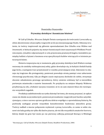 Creatio Fantastica PL ISSN: 2300-2514 R. XII, 2016, nr 3 (54) Dominika Staszenko Prywatny detektyw i kosmiczne bóstwa ∗ W Call of Cthulhu: Mroczne Zakątki Świata nawiązania do twórczości Lovecrafta są silnie akcentowane od początku rozgrywki aż do jej emocjonującego finału. Odnoszę wra- żenie, że twórcy inspirowali się głównie opowiadaniami Zew Cthulhu oraz Widmo nad Innsmouth, w których pojawia się motyw kosmicznych istot nazywanych Wielkimi Przed- wiecznymi, rytuałów odprawianych w celu przyzwania prastarych bogów, kontaktów po- między ludźmi a bytami z kosmosu oraz specyficznych kultów wierzących w istnienie po- twornych bóstw. Historia rozpoczyna się w momencie, gdy prywatny detektyw Jack Walters zostaje wezwany do siedziby niebezpiecznej sekty, gdzie dowiaduje się, że kultyści śledzili każdy jego krok, a następnie traci przytomność w wyniku przerażającej wizji. Zdarzenie to oka- zuje się tragiczne dla protagonisty, ponieważ powoduje utratę pamięci oraz zaburzenie równowagi psychicznej. Gdy po długim czasie mężczyzna dochodzi do siebie, otrzymuje zlecenie odnalezienia pewnego sprzedawcy, który ostatnio widziany był w niewielkim portowym miasteczku o nazwie Innsmouth. Po przybyciu na miejsce kłopoty Waltersa przybierają na sile, a bohater zaczyna rozumieć, że to on sam stanowi klucz do rozwiązania wszystkich zagadek. Produkcja zadebiutowała na rynku dziesięć lat temu, ale muszę przyznać, że upływ czasu nie działa na jej niekorzyść, ponieważ prowadzenie rozgrywki jest bardzo satysfak- cjonujące, a nieco surowa oprawa graficzna dobrze współgra z opowiedzianą historią. Na pochwałę zasługuje przede wszystkim konsekwentnie budowana atmosfera grozy. Twórcy zadbali o mocne połączenie wydarzeń z prozą Lovecrafta, co samo w sobie sta- nowi nie lada gratkę nie tylko dla fanów pisarza, ale też dla wszystkich amatorów horroru, którzy dzięki tej grze być może po raz pierwszy odkryją potencjał tkwiący w Mitologii ∗ Recenzja gry: Call of Cthulhu: Mroczne Zakątki Świata, Headfirst Productions, 2006 1 Cthulhu. Wszelkie notatki, zapiski w pamiętniku, wycinki z gazet czy przerywniki fabularne wyraźnie wskazują, że wokół protagonisty dzieją się osobliwe i trudne do wytłuma- czenia rzeczy, przez co niepokój i świadomość zagrożenia udzielają się także odbiorcy. Dodatkową atrakcję stanowi zwłaszcza dziennik detektywa, dzięki któremu gracz obser- wuje, jak z czasem mężczyzna traci poczucie bezpieczeństwa oraz poddaje w wątpliwość wiedzę na temat własnej tożsamości, stopniowo popadając w obłęd. Zdrowie psychicznie protagonisty jest ważniejsze niż mogłoby się wydawać, po- nieważ jeśli Jack Walters stanie się niepoczytalny, może targnąć się na własne życie. Bar- dzo podoba mi się sposób, w jaki twórcy akcentują momenty, w których szczególnie na2 leży uważać na kruchą psychikę detektywa, ponieważ wykorzystują do tego zabiegi me- tapercepcyjne. Niedyspozycja fizyczna i mentalna sterowanej postaci podkreślana jest przez wirujący obraz, ekran zalewający się czerwienią, a także przyspieszone bicie serca i głośny oddech. Wszystko to mocno zakłóca rozgrywkę, ponieważ znacznie trudniej sprawować kontrolę nad bohaterem, gdy ten jest wystraszony lub spanikowany. Oczywiście nie sposób uniknąć tych scen, ponieważ gra została zaprojektowana tak, by w kluczowych momentach detektyw musiał spojrzeć na coś, co wytrąci go z równowagi. Okaleczone ciała, pojawiające się w różnych miejscach ślady obecności potwora czy nawet koniecz- ność pokonania dużej wysokości, wprowadzają Waltersa w stan niepewności, tym samym zapewniając odbiorcy dawkę emocji i napięcia, wynikającą nie tylko z konieczności pokonania zagrożenia, ale także dostosowania się do ograniczeń postaci. 3 Jak na prawdziwy horror przystało, w Call of Cthulhu nie brakuje również przera- żających dźwięków oraz wrogiej przestrzeni do pokonania. Upiorne chichoty, odgłosy kroków w pustych pokojach czy inne niezidentyfikowane hałasy mają duży udział w bu- dowaniu nastroju grozy. Podobnie jak liczne ślady makabrycznych wydarzeń, znajdujące się niemal w każdej lokacji. Krew na ścianach i podłogach, zdewastowane meble oraz zaniedbane wnętrza dopełniają wrażenia, stając się zarówno przestrogą przed niebezpieczeństwem, jak i zwiastunem nadciągających kłopotów. Przestrzeń, po której gracz może się poruszać jest ograniczona, ale za to zaprojektowana tak, by również wzbudzać prze- rażenie. Na Waltersa czekają bowiem labirynty korytarzy w mrocznych posiadłościach oraz nieoświetlone ulice miasteczka Innsmouth, w którym na każdy rogu może czaić się wrogo nastawiony mieszkaniec. Warto także wspomnieć o kanałach czy opuszczonej rafinerii, gdzie rozgrywa się znaczna część akcji. Intrygującym elementem są także nieliczne ozdoby wnętrz w postaci obrazów przedstawiających bestie rodem z opowiadań Lovecrafta. Szczególne wrażenie wywarło na mnie wspomniane już miasto, do którego przy- bywa detektyw. Innsmouth wydaje się wyludnione, ponieważ próżno szukać w nim otwartych sklepów, przechodniów śpieszących do pracy czy zwykłych spacerowiczów. Zamiast tego na Waltersa czeka plątanina wąskich, ciemnych ulic wraz z nielicznymi mieszkańcami pełniącymi rolę strażników pilnie obserwujących każdy krok bohatera. w grze nie brakuje elementów walki, ale w kluczowych momentach przed zagrożeniem należy uciekać, ponieważ istota, która ściga protagonistę może przybierać różne kształty i formy, materializując się w najmniej spodziewanych momentach. Zgodnie z wyznaczni- kami gatunkowymi klasycznych survival horrorów, sceny gore zostały ograniczone do minimum. Twórcy nie epatują makabrycznymi obrazami, stawiając na znacznie bardziej subtelne sposoby straszenia. Osiągają przy tym naprawdę dobry efekt,