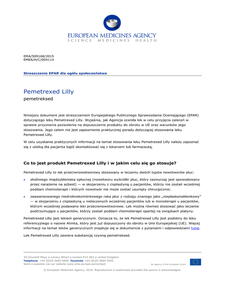 EMA/509168/2015 EMEA/H/C/004114 Streszczenie EPAR dla ogółu społeczeństwa Pemetrexed Lilly pemetreksed Niniejszy dokument jest streszczeniem Europejskiego Publicznego Sprawozdania Oceniającego (EPAR) dotyczącego leku Pemetrexed Lilly. Wyjaśnia, jak Agencja oceniła lek w celu przyjęcia zaleceń w sprawie przyznania pozwolenia na dopuszczenie produktu do obrotu w UE oraz warunków jego stosowania. Jego celem nie jest zapewnienie praktycznej porady dotyczącej stosowania leku Pemetrexed Lilly. W celu uzyskania praktycznych informacji na temat stosowania leku Pemetrexed Lilly należy zapoznać się z ulotką dla pacjenta bądź skontaktować się z lekarzem lub farmaceutą. Co to jest produkt Pemetrexed Lilly i w jakim celu się go stosuje? Pemetrexed Lilly to lek przeciwnowotworowy stosowany w leczeniu dwóch typów nowotworów płuc: • złośliwego międzybłoniaka opłucnej (nowotworu wyściółki płuc, który zazwyczaj jest spowodowany przez narażenie na azbest) — w skojarzeniu z cisplastyną u pacjentów, którzy nie zostali wcześniej poddani chemioterapii i których nowotwór nie może zostać usunięty chirurgicznie; • zaawansowanego niedrobnokomórkowego raka płuc z rodzaju znanego jako „niepłaskonabłonkowy” — w skojarzeniu z cisplastyną u nieleczonych wcześniej pacjentów lub w monoterapii u pacjentów, którym wcześniej podawano leki przeciwnowotworowe. Lek można również stosować jako leczenie podtrzymujące u pacjentów, którzy zostali poddani chemioterapii opartej na związkach platyny. Pemetrexed Lilly jest lekiem generycznym. Oznacza to, że lek Pemetrexed Lilly jest podobny do leku referencyjnego o nazwie Alimta, który jest już dopuszczony do obrotu w Unii Europejskiej (UE). Więcej informacji na temat leków generycznych znajduje się w dokumencie z pytaniami i odpowiedziami tutaj. Lek Pemetrexed Lilly zawiera substancję czynną pemetreksed. 30 Churchill Place ● Canary Wharf ● London E14 5EU ● United Kingdom Telephone +44 (0)20 3660 6000 Facsimile +44 (0)20 3660 5555 Send a question via our website www.ema.europa.eu/contact An agency of the European Union © European Medicines Agency, 2016. Reproduction is authorised provided the source is acknowledged. Jak stosować produkt Pemetrexed Lilly? Lek Pemetrexed Lilly jest dostępny w postaci proszku, z którego sporządza się roztwór do infuzji (podawany dożylnie za pomocą kroplówki). Lek wydaje się wyłącznie z przepisu lekarza i należy go podawać wyłącznie pod nadzorem lekarza z doświadczeniem w stosowaniu chemioterapii. Zalecana dawka wynosi 500 mg na metr kwadratowy powierzchni ciała (obliczonej na podstawie wzrostu i masy ciała pacjenta). Lek podaje się co trzy tygodnie w postaci infuzji trwającej 10 minut. W celu ograniczenia działań niepożądanych podczas leczenia produktem Pemetrexed Lilly pacjentom należy podawać kortykosteroid (rodzaj leku łagodzącego stan zapalny) i kwas foliowy (rodzaj witaminy), jak również wstrzykiwać witaminę B12. Gdy lek Pemetrexed Lilly jest podawany z cisplatyną, przed podaniem dawki cisplatyny lub po jej podaniu należy także zastosować lek przeciwwymiotny (w celu zapobiegania wymiotom) oraz płyny (w celu zapobiegania odwodnieniu). U pacjentów z nieprawidłową morfologią krwi lub innymi określonymi działaniami niepożądanymi należy opóźnić lub przerwać leczenie albo zmniejszyć dawkę. Więcej informacji znajduje się w charakterystyce produktu leczniczego (także część EPAR). Jak działa produkt Pemetrexed Lilly? Substancja czynna leku Pemetrexed Lilly, pemetreksed, to lek cytotoksyczny (lek zabijający komórki dzielące się, takie jak komórki nowotworowe) należący do grupy „antymetabolitów”. W organizmie pemetreksed zostaje przekształcony do postaci czynnej, która blokuje aktywność enzymów uczestniczących w wytwarzaniu „nukleotydów” (elementów budulcowych DNA i RNA — materiału genetycznego komórek). W wyniku tego postać czynna pemetreksedu spowalnia wytwarzanie DNA i RNA oraz zapobiega dzieleniu się i namnażaniu komórek. Przekształcanie pemetreksedu do postaci czynnej zachodzi szybciej w komórkach nowotworowych niż w zdrowych, co prowadzi do większego stężenia postaci czynnej leku i dłuższego czasu jej działania w komórkach nowotworowych. Prowadzi to do ograniczenia podziału komórek nowotworowych przy niewielkim wpływie na komórki zdrowe. Jak badano produkt Pemetrexed Lilly? Firma przedstawiła dane z opublikowanej literatury dotyczące pemetreksedu. Ponieważ lek Pemetrexed Lilly jest lekiem generycznym podawanym w postaci infuzji i zawiera tę samą substancję czynną co lek referencyjny Alimta, żadne dodatkowe badania nie były wymagane. Jakie korzyści i ryzyko wiążą się ze stosowaniem produktu Pemetrexed Lilly? Ponieważ lek Pemetrexed Lilly jest lekiem generycznym, uznaje się, że z jego stosowaniem wiążą się takie same korzyści i ryzyko, jak w przypadku leku referencyjnego. Na jakiej podstawie zatwierdza się produkt Pemetrexed Lilly? Komitet ds. Produktów Leczniczych Stosowanych u Ludzi (CHMP) Agencji uznał, że — zgodnie z wymogami UE — wykazano, że lek Pemetrexed Lilly jest porównywalny w stosunku do leku Alimta. Dlatego też CHMP wyraził opinię, że — podobnie jak w przypadku produktu Alimta — korzyści przewyższają rozpoznane ryzyko. Komitet zalecił przyznanie pozwolenia na dopuszczenie produktu Pemetrexed Lilly do stosowania w Unii Europejskiej. Pemetrexed Lilly EMA/509168/2015 Strona 2/3 Jakie środki są podejmowane w celu zapewnienia bezpiecznego i skutecznego stosowania produktu Pemetrexed Lilly? W celu zapewnienia możliwie najbezpieczniejszego stosowania produktu Pemetrexed Lilly opracowano plan zarządzania ryzykiem. W oparciu o ten plan w charakterystyce produktu leczniczego i ulotce dla pacjenta dotyczących produktu Pemetrexed Lilly zawarto informacje dotyczące bezpieczeństwa, w tym odpowiednie środki ostro