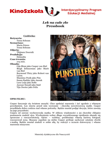 Lek na całe zło Pressbook Czołówka: Reżyseria: Tessa Schram Scenariusz: Maria Peters Tessa Schram Zdjęcia: Thijmen Doornik Produkcja: Holandia Czas trwania: 104 min. Obsada: Gijs Blom jako Casper van Riel Birgit Schuurman jako Marit van Riel Raymond Thiry jako Robert van Laren Massimo Pesik jako Pim Susan Radder jako Anouk Lara Leijs jako Sofie Anouar Ennali jako Said Tijn Docter jako Felix OPIS FILMU: Casper fascynuje się światem muzyki. Chce spełniać marzenia i żyć zgodnie z własnym powołaniem. Los stawia przed nim wyzwanie – chorobę nowotworową matki. Casper przedkłada dobro rodzica nad własne potrzeby. Będzie musiał podjąć decyzje, które zaważą na jego przyszłości. Caspra od zawsze wychowywała matka. W obliczu wiadomości o jej chorobie chłopiec postanawia znaleźć ojca. Wyobrażenia wobec długo wyczekiwanego spotkania okazały się sprzeczne z rzeczywistością. Ojciec – wybitny, pochłonięty własną karierą fotograf, rozczarował syna. Skazany zupełnie na siebie Casper próbuje zachować ostatnie chwile z matką. Będzie musiał znaleźć w sobie siłę, by walczyć o uczucie dziewczyny i własne marzenia muzyczne. Materiały dydaktyczne dla Nauczycieli OPINIA PSYCHOLOGA: Analiza psychologiczna dla nauczycieli i rodziców, którzy chcą porozmawiać z dziećmi o filmie. LEK NA CAŁE ZŁO Film z dużym wyczuciem i subtelnością opowiada o trudnych doświadczeniach zaledwie kilkunastoletniego, utalentowanego muzycznie Caspera. Chłopiec mierzy się ze śmiertelną chorobą matki oraz odkrywaną stopniowo prawdą o ojcu, który do tej pory był nieobecny w jego życiu. Wśród tych wszystkich wydarzeń znajduje się jeszcze miejsce na miłość, przyjaźń i pasję. Tematy do rozmowy: → Talent - Co to znaczy mieć talent? Czy talent wystarczy, żeby osiągnąć sukces? Jakie koszty ponosi się, żeby zrealizować swój talent, swoją pasję? Casper jest niewątpliwie utalentowany muzycznie, ma ogromny potencjał. Jednak okazuje się, że to nie wystarczy, aby stworzyć wartościową kompozycję. Dopiero, kiedy „będzie wystarczająco blisko” własnych odczuć, poczuje się spełniony. Z kolei sytuacja ojca pokazuje głównemu bohaterowi, ile trzeba poświęcić, aby realizować swoją pasję. Robert jest ciągle w drodze, nie ma życia rodzinnego. Pojawia się zatem pytanie, czy zawsze trzeba coś utracić, aby rozwijać swój talent? → Nasze korzenie — Do czego potrzebne są nam nasze korzenie? Po co ich szukać? Co łączy mnie z moimi rodzicami? Trudno jest budować swoją tożsamość i odpowiadać na fundamentalne dla wieku dojrzewania pytanie „Kim jestem?”, bez znajomości własnej przeszłości, historii rodzinnej. Dlatego też łatwo zrozumieć determinację Caspera w poszukiwaniu ojca, nawet mimo wyraźnego sprzeciwu matki. Spotkanie z nim ma być dla niego swoistym „lekiem na całe zło”, jednak początkowo rozczarowuje i zasmuca. W kontekście historii Caspera pojawia się także pytanie, czy da się zbudować relację z nieobecnym przez tyle lat rodzicem – ciekawe, jak losy chłopca i jego ojca potoczyłyby się dalej. → Utrata kogoś bliskiego — Jakie uczucia towarzyszą temu doświadczeniu? Jak można się pożegnać? Relacja z matką jest dla Caspera najważniejsza i chłopiec jest w stanie wiele dla niej poświęcić. Widmo jej utraty wiąże się niewątpliwie z doświadczaniem lęku, bezradności, smutku, wściekłości. Temat śmierci matki poruszony w filmie może być trudny dla młodego widza. Dlatego warto podczas dyskusji poświęcić czas na odczucia, jakie pojawiły się w związku z nim. Film pokazuje, że można towarzyszyć bliskiej osobie w jej chorobie i pożegnać się z nią. → Wielokulturowość — Jak się porozumieć w wielokulturowym społeczeństwie? Jak się nie bać siebie nawzajem? Temat współżycia ze sobą rożnych kultur jest ostatnio bardzo żywo dyskutowany. W filmie ojciec Sofie reprezentuje konserwatywną i lękową postawę wobec obcokrajowców. Wyraża się wobec nich z wyższością i pogardą. Nie wyobraża sobie, że jego córka mogłaby z kimś takim się spotykać. Los jednak płata mu figla, a osobisty kontakt z przedstawicielem społeczności marokańskiej – Saidem – szybko weryfikuje stereotypowe poglądy i przekonuje, że przyjaźń jest możliwa w każdych okolicznościach. Przygotowanie analizy: Joanna Klus Na podstawie materiałów: http://www.nhef.pl/edukacja/film.do?id=8366&ind=idCyklu%3D631 http://www.filmweb.pl/film/Painkillers-2014-723896 [dostęp: 17.08.2016 r.] Materiały dydaktyczne dla Nauczycieli