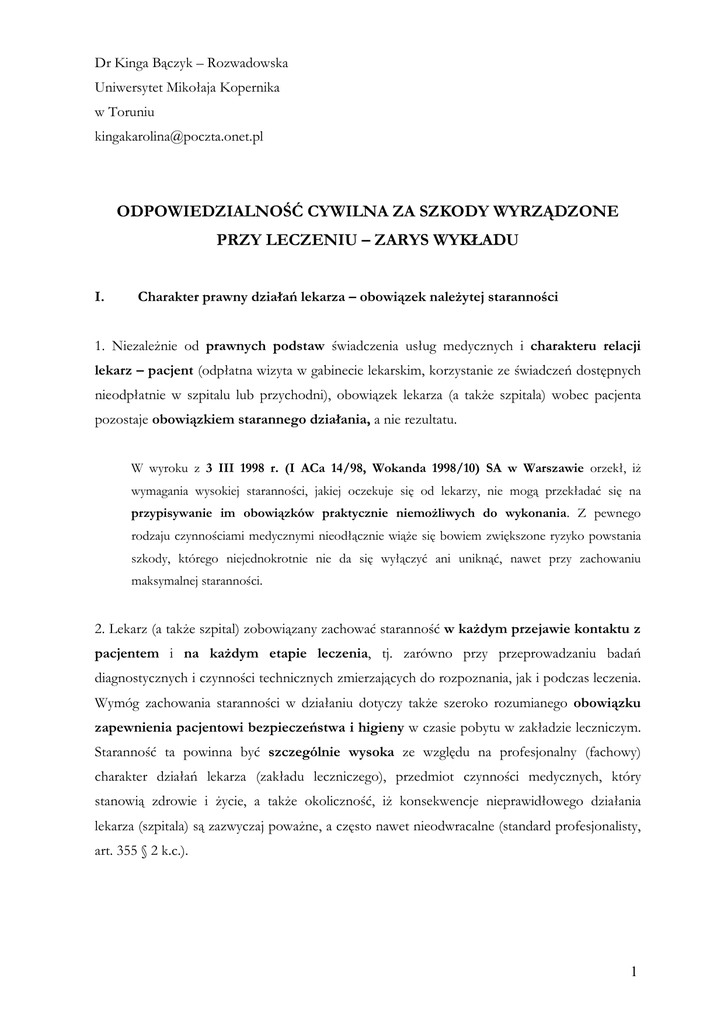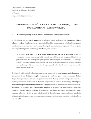 Dr Kinga Bączyk – Rozwadowska Uniwersytet Mikołaja Kopernika w Toruniu [email protected] ODPOWIEDZIALNOŚĆ CYWILNA ZA SZKODY WYRZĄDZONE PRZY LECZENIU – ZARYS WYKŁADU I. Charakter prawny działań lekarza – obowiązek należytej staranności 1. Niezależnie od prawnych podstaw świadczenia usług medycznych i charakteru relacji lekarz – pacjent (odpłatna wizyta w gabinecie lekarskim, korzystanie ze świadczeń dostępnych nieodpłatnie w szpitalu lub przychodni), obowiązek lekarza (a także szpitala) wobec pacjenta pozostaje obowiązkiem starannego działania, a nie rezultatu. W wyroku z 3 III 1998 r. (I ACa 14/98, Wokanda 1998/10) SA w Warszawie orzekł, iż wymagania wysokiej staranności, jakiej oczekuje się od lekarzy, nie mogą przekładać się na przypisywanie im obowiązków praktycznie niemożliwych do wykonania. Z pewnego rodzaju czynnościami medycznymi nieodłącznie wiąże się bowiem zwiększone ryzyko powstania szkody, którego niejednokrotnie nie da się wyłączyć ani uniknąć, nawet przy zachowaniu maksymalnej staranności. 2. Lekarz (a także szpital) zobowiązany zachować staranność w każdym przejawie kontaktu z pacjentem i na każdym etapie leczenia, tj. zarówno przy przeprowadzaniu badań diagnostycznych i czynności technicznych zmierzających do rozpoznania, jak i podczas leczenia. Wymóg zachowania staranności w działaniu dotyczy także szeroko rozumianego obowiązku zapewnienia pacjentowi bezpieczeństwa i higieny w czasie pobytu w zakładzie leczniczym. Staranność ta powinna być szczególnie wysoka ze względu na profesjonalny (fachowy) charakter działań lekarza (zakładu leczniczego), przedmiot czynności medycznych, który stanowią zdrowie i życie, a także okoliczność, iż konsekwencje nieprawidłowego działania lekarza (szpitala) są zazwyczaj poważne, a często nawet nieodwracalne (standard profesjonalisty, art. 355 § 2 k.c.). 1 W wyroku z 29 X 2003 r. (III CK34/02; OSP 2005/4, poz. 54) SN stwierdził, że lekarz powinien przeprowadzać zabiegi operacyjne zgodnie ze sztuką i nauką lekarską oraz najwyższą starannością wymaganą od profesjonalisty. 4. Mając na uwadze kryteria staranności podwyższonej (na potrzeby oceny subiektywnej winy lekarza i jego ewentualnej odpowiedzialności za wyrządzone szkody) literatura i orzecznictwo konstruują „wzorzec dobrego lekarza”. Wzorzec ten: • ma charakter obiektywny i zarazem abstrakcyjny, a więc całkowicie niezależny od indywidualnych cech i właściwości (skłonności) sprawcy (jego niedoświadczenia, nawyków czy skłonności, itp.) • jest jednocześnie zmienny (elastyczny) w zależności od tego, jakiej specjalizacji medycznej dotyczy (wzorzec dobrego chirurga, psychiatry, ortopedy). W przypadku, gdy lekarz podejmuje się czynności, do których kwalifikowany jest wyłącznie specjalista, jego zachowanie podlegać więc będzie ocenie według wzorca przyjętego dla specjalisty. W wyroku SN z 5 X 1945 r. (C I 204/45; ZbO 1946, poz. 18) sąd uznał odpowiedzialność ginekologa, który pełniąc dyżur w szpitalnej izbie przyjęć, po konsultacji z okulistą przeprowadził u zabieg wycięcia krwiaka na podudziu, doprowadzając do powstania zakażenia i w konsekwencji – do śmierci pacjentki. Zabieg, jak się później okazało, był całkowicie zbędny. W wyroku z 7 I 1966 r. (I CR 369/65; OSPiKA 1966, poz. 278) Sąd Najwyższy przyjął, że można, a nawet należy wymagać od lekarza nie będącego specjalistą, aby nie tylko skierował chorego do specjalisty, ale nawet uczulił pacjenta na konieczność leczenia specjalistycznego, jeżeli w rachubę wchodzi możliwość powstania kalectwa. Natomiast w wyroku SN z 11 III 1976 r. (IV CR 50/76; OSN 1977, poz. 11) zasądzono odszkodowanie na rzecz powódki, która na skutek niewłaściwego leczenia złamania doznała trwałego kalectwa polegającego na usztywnieniu nogi w stawie skokowym. SN stwierdził, że złożenia nogi dokonał lekarz o niewłaściwej specjalizacji (internista), a przy tym niedoświadczony (z zaledwie 4-mies. stażem pracy), który w dodatku rozpoznał złamanie tylko jednej kości przyśrodkowej stawu skokowego, podczas gdy złamane były obie kostki. • kształt wzorca uzależniony jest także od tego, czy model powinnego działania stanowi punkt odniesienia dla fachowca z nowoczesnej kliniki, dobrze wyposażonej w aparaturę i sprzęt medyczny, czy mniejszego szpitala o skromniejszym budżecie 2 W wyroku z 1 V 1969 r. (II CR 165/69; OSPiKA 1970/7-8, poz. 155) SN orzekł, że także od lekarza Pogotowia Ratunkowego, który nie jest specjalistą – chirurgiem można wymagać, aby w ramach doraźnie udzielanej pomocy zaordynował prześwietlenie, jeżeli w konkretnych okolicznościach, zgodnie z zasadami doświadczenia, zachodzić może podejrzenie złamania kości. • wzorzec pozostaje także zależny od stanu wiedzy – zmienia się wraz z rozwojem i postępem medycyny. Oznacza to, że na lekarzu spoczywa obowiązek stałego dokształcania się, podnoszenia swoich kwalifikacji zawodowych i zdobywania doświadczenia. W wyroku z 13 X 2005 r. (IV CK 161/05, OSP 2006/6, poz. 71), kończącym tzw. sprawę łomżyńską, Sąd Najwyższy stwierdził, że na lekarzu, jak na każdym profesjonaliście, spoczywa obowiązek kompetencji. Chodzi przy tym o kompetencje rzeczywiste, merytoryczne, nie zaś formalne (stwierdzone jedynie dyplomem lub odpowiednim certyfikatem). Obowiązek podnoszenia kwalifikacji zawodowych i bieżącego śledzenia postępów nauki i techniki medycznej wynika wprost z ustawy lekarskiej (art. 18) oraz KEL (art. 55). Ignorancja w tym zakresie stanowi winę lekarza. • na kształt wzorca (zakres wymaganej staranności w działaniu) nie ma natomiast wpływu okoliczność, czy świadczenia zdrowotne udzielane są nieodpłatnie, czy odpłatnie, na zasadach komercyjnych. 5. Odstępstwo od wymaganej w danych okolicznościach staranności w działaniu stanowić będzie winę