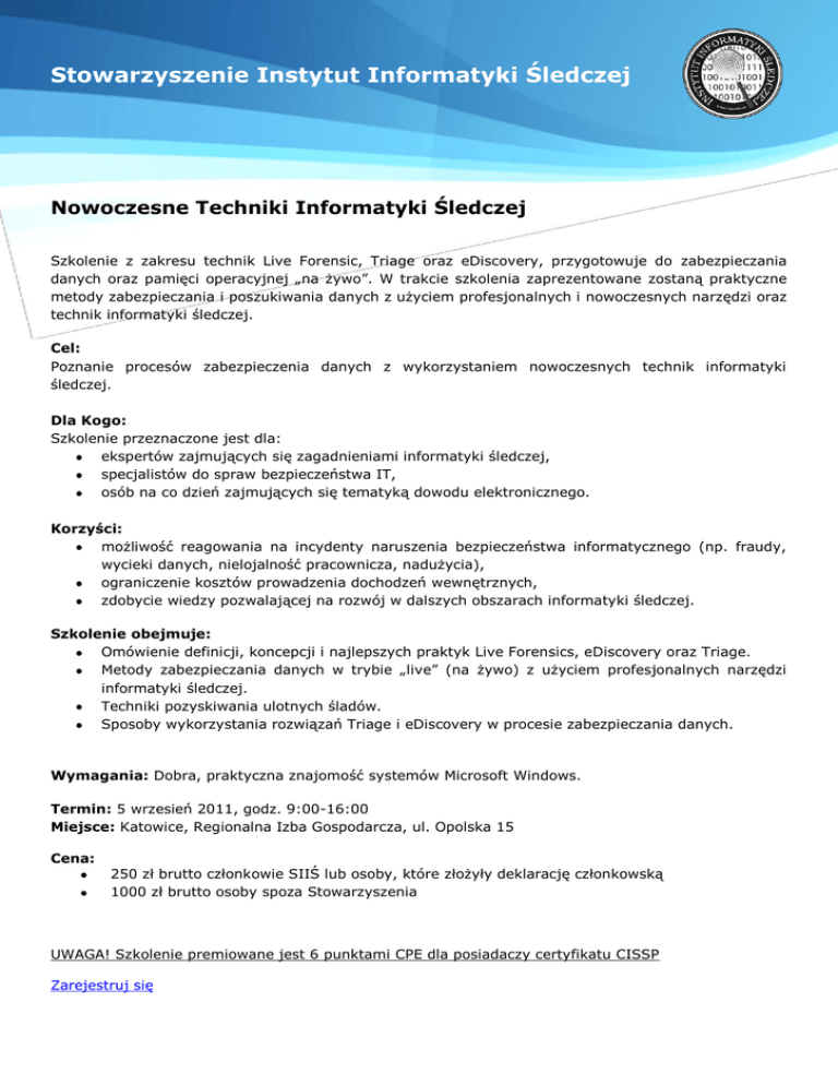 Stowarzyszenie Instytut Informatyki Śledczej Nowoczesne Techniki Informatyki Śledczej Szkolenie z zakresu technik Live Forensic, Triage oraz eDiscovery, przygotowuje do zabezpieczania danych oraz pamięci operacyjnej „na żywo”. W trakcie szkolenia zaprezentowane zostaną praktyczne metody zabezpieczania i poszukiwania danych z użyciem profesjonalnych i nowoczesnych narzędzi oraz technik informatyki śledczej. Cel: Poznanie procesów zabezpieczenia danych z wykorzystaniem nowoczesnych technik informatyki śledczej. Dla Kogo: Szkolenie przeznaczone jest dla: ekspertów zajmujących się zagadnieniami informatyki śledczej, specjalistów do spraw bezpieczeństwa IT, osób na co dzień zajmujących się tematyką dowodu elektronicznego. Korzyści: możliwość reagowania na incydenty naruszenia bezpieczeństwa informatycznego (np. fraudy, wycieki danych, nielojalność pracownicza, nadużycia), ograniczenie kosztów prowadzenia dochodzeń wewnętrznych, zdobycie wiedzy pozwalającej na rozwój w dalszych obszarach informatyki śledczej. Szkolenie obejmuje: Omówienie definicji, koncepcji i najlepszych praktyk Live Forensics, eDiscovery oraz Triage. Metody zabezpieczania danych w trybie „live” (na żywo) z użyciem profesjonalnych narzędzi informatyki śledczej. Techniki pozyskiwania ulotnych śladów. Sposoby wykorzystania rozwiązań Triage i eDiscovery w procesie zabezpieczania danych. Wymagania: Dobra, praktyczna znajomość systemów Microsoft Windows. Termin: 5 wrzesień 2011, godz. 9:00-16:00 Miejsce: Katowice, Regionalna Izba Gospodarcza, ul. Opolska 15 Cena: 250 zł brutto członkowie SIIŚ lub osoby, które złożyły deklarację członkowską 1000 zł brutto osoby spoza Stowarzyszenia UWAGA! Szkolenie premiowane jest 6 punktami CPE dla posiadaczy certyfikatu CISSP Zarejestruj się Stowarzyszenie Instytut Informatyki Śledczej Wykładowcy Paweł Babski Główne obowiązki w laboratorium informatyki śledczej skupiają się wokół analizy danych i wyszukiwania informacji. Uczestnik szkoleń i kursów organizowanych przez amerykańskie firmy specjalistyczne. Posiada m.in. Advanced Computer Forensic EnCase Certyficate, certyfikat auditora wewnętrznego Systemu Zarządzania Bezpieczeństwem Informacji ISO 27001. Wielokrotnie brał udział w zabezpieczaniu danych komputerowych podczas operacji przeprowadzanych przez służby odpowiedzialne za zachowanie bezpieczeństwa i porządku publicznego. Posiada poświadczenie bezpieczeństwa osobowego uprawniające do dostępu do informacji niejawnych oznaczonych klauzulą poufne. Osoba wdrażająca platformy reakcji na incydenty i bezpieczeństwa informacji w firmach i instytucjach. Beta tester EnCase. Marcin Kulawik Specjalista informatyki śledczej. Do jego głównych obowiązków służbowych należy analiza danych, licencjonowanie oprogramowania komputerowego w zakresie własności intelektualnej oraz sprawy związane z przestępstwami przeciwko obrotowi gospodarczemu. Autor prawie 350 ekspertyz sądowych. Uczestnik szkoleń i kursów organizowanych przez amerykańskie i niemieckie firmy specjalistyczne, m.in. X-Ways i Guidance Software (EnCase). Jest certyfikowanym auditorem wewnętrznym Systemu Zarządzania Bezpieczeństwem Informacji zgodnie z normą ISO 27001. Wielokrotnie brał udział w zabezpieczaniu danych komputerowych podczas operacji przeprowadzanych przez służby odpowiedzialne za zachowanie bezpieczeństwa i porządku publicznego. Posiada poświadczenie bezpieczeństwa osobowego uprawniające do dostępu do informacji niejawnych oznaczonych klauzulą poufne. Jest członkiem Stowarzyszenia Instytut Informatyki Śledczej. Artur Wojciechowski Funkcjonariusz Policji. Absolwent Wyższej Szkole Administracji i Zarządzania w Zawierciu na kierunku informatyka w ekonomii oraz Wyższej Szkole Policji w Szczytnie na kierunku Bezpieczeństwo Wewnętrzne, specjalizacja Bezpieczeństwo systemów informatycznych i informatyka śledcza. Obecnie studia podyplomowe w Wyższej Szkole Biznesu w Dąbrowie Górniczej na kierunku Administrator Bezpieczeństwa Informacji. Członek Instytutu Informatyki Śledczej. Zarejestruj się
