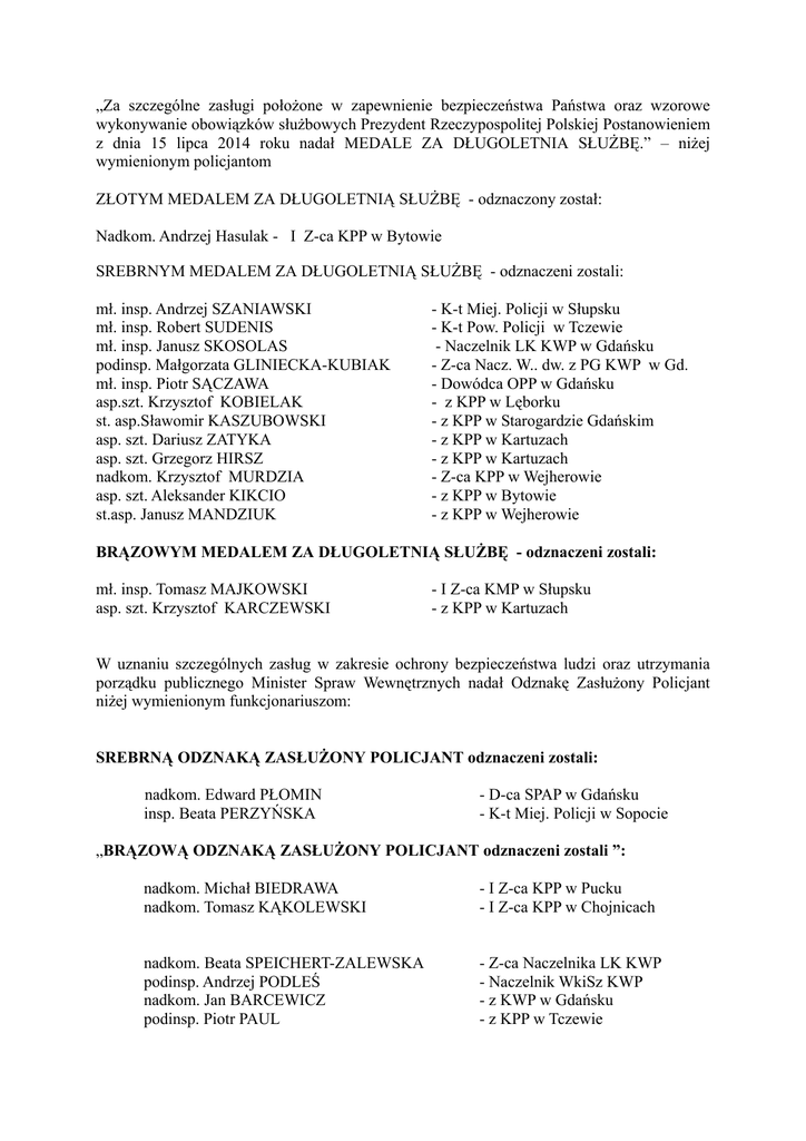 „Za szczególne zasługi położone w zapewnienie bezpieczeństwa Państwa oraz wzorowe wykonywanie obowiązków służbowych Prezydent Rzeczypospolitej Polskiej Postanowieniem z dnia 15 lipca 2014 roku nadał MEDALE ZA DŁUGOLETNIA SŁUŻBĘ.” – niżej wymienionym policjantom ZŁOTYM MEDALEM ZA DŁUGOLETNIĄ SŁUŻBĘ - odznaczony został: Nadkom. Andrzej Hasulak - I Z-ca KPP w Bytowie SREBRNYM MEDALEM ZA DŁUGOLETNIĄ SŁUŻBĘ - odznaczeni zostali: mł. insp. Andrzej SZANIAWSKI mł. insp. Robert SUDENIS mł. insp. Janusz SKOSOLAS podinsp. Małgorzata GLINIECKA-KUBIAK mł. insp. Piotr SĄCZAWA asp.szt. Krzysztof KOBIELAK st. asp.Sławomir KASZUBOWSKI asp. szt. Dariusz ZATYKA asp. szt. Grzegorz HIRSZ nadkom. Krzysztof MURDZIA asp. szt. Aleksander KIKCIO st.asp. Janusz MANDZIUK - K-t Miej. Policji w Słupsku - K-t Pow. Policji w Tczewie - Naczelnik LK KWP w Gdańsku - Z-ca Nacz. W.. dw. z PG KWP w Gd. - Dowódca OPP w Gdańsku - z KPP w Lęborku - z KPP w Starogardzie Gdańskim - z KPP w Kartuzach - z KPP w Kartuzach - Z-ca KPP w Wejherowie - z KPP w Bytowie - z KPP w Wejherowie BRĄZOWYM MEDALEM ZA DŁUGOLETNIĄ SŁUŻBĘ - odznaczeni zostali: mł. insp. Tomasz MAJKOWSKI asp. szt. Krzysztof KARCZEWSKI - I Z-ca KMP w Słupsku - z KPP w Kartuzach W uznaniu szczególnych zasług w zakresie ochrony bezpieczeństwa ludzi oraz utrzymania porządku publicznego Minister Spraw Wewnętrznych nadał Odznakę Zasłużony Policjant niżej wymienionym funkcjonariuszom: SREBRNĄ ODZNAKĄ ZASŁUŻONY POLICJANT odznaczeni zostali: nadkom. Edward PŁOMIN insp. Beata PERZYŃSKA - D-ca SPAP w Gdańsku - K-t Miej. Policji w Sopocie „BRĄZOWĄ ODZNAKĄ ZASŁUŻONY POLICJANT odznaczeni zostali ”: nadkom. Michał BIEDRAWA nadkom. Tomasz KĄKOLEWSKI - I Z-ca KPP w Pucku - I Z-ca KPP w Chojnicach nadkom. Beata SPEICHERT-ZALEWSKA podinsp. Andrzej PODLEŚ nadkom. Jan BARCEWICZ podinsp. Piotr PAUL - Z-ca Naczelnika LK KWP - Naczelnik WkiSz KWP - z KWP w Gdańsku - z KPP w Tczewie asp.szt. Paweł BURKOWSKI kom. Alicja TRZEBIATOWSKA mł.asp. Adam NASTAŁY sierż. szt. Tomasz RASZEJA - z KPP w Wejherowie - z KPP w Bytowie - z KMP w Sopocie - z KMP w Gdańsku „Komendant Główny Policji na wniosek Komendanta Wojewódzkiego Policji w Gdańsku w korpusie oficerów starszych – mianował”: NA STOPIEŃ INSPEKTORA POLICJI: mł. insp. Andrzej CZAJA mł.insp. Andrzej BORZYSZKOWSKI mł.insp. Piotr BOLIN mł.insp. Wacław ŁOKUCIEWSKI - K-t Pow. Policji w Kościerzynie - K-t Pow. Policji w Bytowie - K-t Pow. Policji w Pucku - K-t Pow. Policji w N.Dw. Gd NA STOPIEŃ MŁODSZEGO INSPEKTORA POLICJI: podinsp. Jarosław ŁAPACZ podinsp. Wojciech SIWEK podinsp. Waldemar SZULC podinsp. Wojciech TOMASZEWSKI podinsp. Tomasz ZACHARZEWSKI - I Z-ca KPP w Kwidzynie - Z-ca KMP w Gdyni - I Z-ca K-t KMP w Gdańsku - Naczelnik WKR KWP w Gdańsku - Komendant KP I w Słupsku NA STOPIEŃ PODINSPEKTORA POLICJI: nadkom. Artur MĘDRZYCKI nadkom. Zbigniew ZACHCIAŁ nadkom. Jarosław PIECHOWSKI - I Z-ca KPP w Malborku - z KPP w Człuchowie - z KPP w Chojnicach „Komendant Wojewódzki Policji w Gdańsku mianował na wyższe stopnie policyjne w korpusie oficerów młodszych i aspirantów i podoficerów– niżej wymienionych funkcjonariuszy”: NA STOPIEŃ NADKOMISARZA POLICJI: kom. Mariusz WOJTALEWICZ kom. Robert FIOREK kom. Remigiusz WIERZBA - Nacz. Wydz. dw. z Kor. KWP w Gd. - Z-ca Nacz. WDŚ KWP w Gdańsku - K-t KP IX w Gdańsku NA STOPIEŃ KOMISARZA POLICJI: podkom. Michał REDKO podkom. Przemysław BUJAK podkom. Tomasz KULA - z KWP w Gdańsku - z KPP w Pucku - z KPP w Kwidzynie NA STOPIEŃ ASPIRANTA SZTABOWEGO POLICJI: st. asp. Grzegorz STĘPCZYŃSKI st.asp. Maja SERKOWSKA st.asp. Leszek ZIELIŃSKI - z KMP w Gdyni - z KPP w Kartuzach - z KPP w Starogardzie Gd. st.asp. Zbigniew CZEKIRDA - z KPP w Lęborku NA STOPIEŃ STARSZEGO ASPIRANTA POLICJI: asp. Donata LICA asp. Piotr HIRSZ - z KPP w Kartuzach - z KPP w Kartuzach Komendant Wojewódzki Policji w Gdańsku w korpusie aspirantów i podoficerów Policji. Również Komendant Powiatowy Policji w Kartuzach Rozkazem Personalnym mianował na stopień starszego posterunkowego Policji – podległych sobie funkcjonariuszy. NA STOPIEŃ ASPIRANTA POLICJI: mł.asp. Kamil ZIEMNIEWICZ mł.asp. Krzysztof ŻEBROWSKI - z KMP w Gdyni - z KPP w Wejherowie NA STOPIEŃ MŁODSZEGO ASPIRANTA POLICJI: sierż. szt. Piotr GDANIEC sierż. szt. Przemysław BYCZKOWSKI - z KPP w Kartuzach - z KPP w Kartuzach NA STOPIEŃ SIERŻANTA SZTABOWEGO POLICJI: st. sierż. Artur FELSKOWSKI st. sierż. Marzena SOPOLIŃSKA - z KPP w Kościerzynie - z KMP w Słupsku NA STOPIEŃ STARSZEGO SIERŻANTA POLICJI: sierż. Weronika KRZYSZTOFIK sierż. Michał RYFA - z KPP w Sztumie - z KPP w N. Dw. Gd NA STOPIEŃ SIERŻANTA POLICJI: st. post. Aleksandra DRÓŻDŻ st. post. Marian KASPRZAK - z KPP w Malborku - z KPP w Pruszczu Gd. NA STOPIEŃ STARSZEGO POSTERUNKOWEGO POLICJI: post. Adrian ZABROCKI post. Marcin KOŁODZIEJ - z KPP w Kartuzach - z KPP w Kartuzach Za wybitne zasługi w dziedzinie realizacji ustawowych zadań Policji, Minister Spraw Wewnętrznych, nadał medale "Za zasługi dla Policji: ZŁOTYM MEDALEM ZA ZASŁUGI DLA POLICJI odznaczona została P. JANINA KWIECIEŃ (STAROSTA POWIATU KARTUSKIEGO) SREBRNYM MEDALEM ZA ZASŁUGI DLA POLICJI odznaczony został P. JANUSZ WRÓBEL (BURMISTRZ PRUSZCZA GDAŃSKIEGO) BRĄZOWYM MEDALEM ZA ZASŁUGI DLA POLICJI odznaczeni zostali P. TADEUSZ BUKONTT (DYREKTOR WYDZIAŁU BEZPIECZEŃSTWA I ZARZĄDANIA URZEDU MIEJSKIEGO W GDAŃSKU) P.WOJCIECH DETTLAFF (STAROSTA POWIATU PUCKIEGO) P.ELŻBIETA GOSTKOWSKA (NADLEŚNICZY NADLEŚNICTWA KARTUZY) P.ANDRZEJ KASPRZAK (PREZES ZARZĄDU SPÓLKI MIĘDZYNARODOWYCH TARGÓW GDAŃSKICH) P. MACIEJ LIGNOWSKI (PREZES ZARZĄDU SPÓŁKI PKP SKM W TRÓJMIEŚCIE) P.MACIEJ LISICKI ( URZĄD MIEJSKI W GDAŃSKU) P.DARIUSZ RÓŻYCKI ( PROKURATOR OKRĘGOWY W GDAŃSKU) P.MARIA TARASZKIEWICZ- GURZYŃSKA (BURMISTZ MIASTA I GMINY GNIEW) PODINSP. DARIUSZ WIŚNIEWSKI ( KOMENDANT S