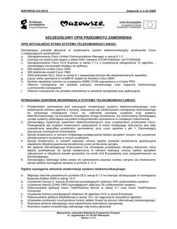 WZP/WO/D-332-29/15 Załącznik nr 2 do SIWZ SZCZEGÓŁOWY OPIS PRZEDMIOTU ZAMÓWIENIA OPIS AKTUALNEGO STANU SYSTEMU TELEKOMUNIKACYJNEGO: Zamawiający posiada aktualnie w użytkowaniu system telekomunikacyjny producenta Cisco o następujących parametrach: a. Oprogramowanie Cisco Unified Communications Manager w wersji 6.1.3 b. Licencja na system jest oparta o adres MAC serwera CUCM Publisher: e41f13254d2b c. Oprogramowanie Cisco CCX Express w wersji 7.1.2 z możliwością zalogowania 10 agentów – zamawiający nie posiada dostępu do aplikacji d. 500 telefonów model Cisco 7940 e. 300 telefonów model Cisco 7960 f. 3200 jednostek DLU, które w wersji 6.1 zapewniają licencje dla eksploatowanych aparatów g. Łącze od/do operatora to 2x30B+D wpięte do Routera Cisco 2800 h. System rejestracji rozmów na urządzeniu KSRC 5128 wyposażony w 2 karty PRA i. Obecne rozwiązanie nie posiada pokrycia serwisowego oraz wsparcia technicznego u producenta rozwiązania j. Obecne rozwiązanie nie posiada redundancji w warstwie sprzętowej oraz aplikacyjnej WYMAGANIA ODNOŚNIE MODERNIZACJI SYSTEMU TELEKOMUNIKACYJNEGO: 1. 2. 3. 4. 5. 6. Przedmiotem zamówienia jest wykonanie modernizacji systemu telekomunikacyjnego oraz świadczenie serwisu zgodnie z umową. Dopuszcza się zaoferowanie rozwiązania równoważnego do opisanego rozwiązania Cisco, np. całkowitą wymianę urządzeń oraz systemu teleinformatycznego na kompletne rozwiązanie innego producenta, Za równoważne Zamawiający uznaje systemy spełniające wszystkie funkcjonalności wymienione w niniejszym dokumencie. Zamawiający dysponuje systemem telekomunikacyjnym oraz urządzeniami producenta Cisco. Posługiwanie się znakami towarowymi wskazanymi w treści niniejszego dokumentu jest więc uzasadnione specyfiką przedmiotu zamówienia, przy czym zgodnie z pkt 1, Zamawiający dopuszcza rozwiązania równoważne. Sprzęt dostarczony w ramach niniejszego postępowania będzie sprzętem nowym, nie używanym (dostarczanym) wcześniej w innych projektach. Sprzęt dostarczony w ramach realizacji umowy będzie posiadał świadczenia gwarancyjne wspierane oficjalną gwarancją świadczoną przez producenta sprzętu. Na żądanie Zamawiającego Wykonawca ma obowiązek przedstawić oficjalny dokument, który będzie poświadczał, że sprzęt dostarczony w ramach realizacji umowy będzie sprzętem zakupionym w oficjalnym kanale sprzedaży na rynek Unii Europejskiej oraz zarejestrowanym na Zamawiającego. Zamawiający zastrzega sobie prawo do sprawdzenia poprzez numery seryjne czy dostarczony sprzęt spełnia wymagania opisane w punkcie 2, 3, 4. Ogólne wymagania odnośnie modernizacji systemu telekomunikacyjnego: a. b. c. d. e. f. g. h. i. Migracja obecnie posiadanych punktów DLU wersji 6.1.3 na licencje obowiązujące w rozwiązaniu Business Edition 6000 w wersji 10.5 Uzyskanie licencji w stopniu Enhanced pozwalających obsłużyć 525 użytkowników systemu Uzyskanie licencji CUWL PRO pozwalających obsłużyć 25 użytkowników systemu Wykorzystanie aplikacji Cisco TelePresence Server w wersji 4.1 oraz Cisco TelePresence Conductor Uzyskanie licencji pozwalających obsłużyć 25 agentów CCX w wersji Enhanced Wykorzystanie aplikacji MediaSense w wersji 10.x, do nagrywania wszystkich agentów Uzyskanie możliwości uruchomienia funkcji Jabber Guest na stronie internetowej zamawiającego. Wymiana serwera sterującego oraz zapewnienie redundancji sprzętowej Wymiana routera modularnego pełniącego rolę bramy głosowej Mazowiecka Jednostka Wdrażania Programów Unijnych ul. Jagiellońska 74, 03-301 Warszawa Strona 1 z 11 WZP/WO/D-332-29/15 j. k. l. m. n. o. p. Załącznik nr 2 do SIWZ Redundancja w warstwie aplikacyjnej aplikacji Cisco Call Manager 10.5 Uruchomienie najnowszej wersji aplikacji Cisco Unified Contact Center Express w wersji 10.x Uruchomienia aplikacji Expressway-C oraz Expressway-E z licencją na jedną sesję przychodzącą Rozszerzenie funkcjonalności systemu o funkcje opisane w poniższej specyfikacji funkcjonalnej Parametryzację nowego systemu 10.5 według wymagań zamawiającego w stopniu odpowiadającym obecnym ustawieniom systemu w wersji 6.1 Pozostawienie niezmienionej funkcjonalności systemu rejestracji rozmów Objęcie pokryciem serwisowym i wsparciem technicznym producenta całego systemu zgodnie z umową z możliwością przedłużenia. Podstawowe cele i charakterystyka systemu zunifikowanej komunikacji: 1. System musi realizować zadania zwiększające efektywność komunikacji: a. Połączenia głosowe wysokiej jakości z wykorzystaniem kodeków szerokopasmowych b. Obsługa konferencji głosowych, w tym połączeń wielostronnych c. Obsługa połączeń wideo, w tym połączeń wielostronnych z zastosowaniem mostków wideo d. Informowanie o aktualnym stanie dostępności innych użytkowników systemu (dostępny/niedostępny/proszę-nie-przeszkadzać) na terminalu sprzętowym oraz komunikatorze programowym e. Dostarczenie interfejsu użytkownika umożliwiającego łatwy dostęp do informacji o nieodebranych/odebranych/wykonanych połączeniach, do poczty głosowej, a także tworzenie własnych książek adresowych 2. Obniżenie kosztów zarządzania i utrzymania systemu telekomunikacyjnego poprzez a. Zdalne zarządzanie całym systemem b. Łatwe i szybkie dokonywanie zmian typu instalacja nowych terminali, zmiana ich parametrów, przenoszenie ich na nowe miejsca pracy 3. Zwiększenie efektywności pracy poprzez a. Większą mobilność i dostępność użytkowników przez umożliwienie im logowania się do systemu z dowolnego terminalu nim objętego b. Możliwość dostępu z poziomu terminalu do informacji pochodzących z różnorodnych aplikacji merytorycznych c. Możliwość zdefiniowania dla użytkownika pojedynczego numeru urzędowego, obejmującego osobisty terminal użytkownika w systemie oraz jego inne urządzenie komunikacyjne spoza niego (np. telefon komórkowy) d. Obsługa terminali bezprzewodowych 4. Bez