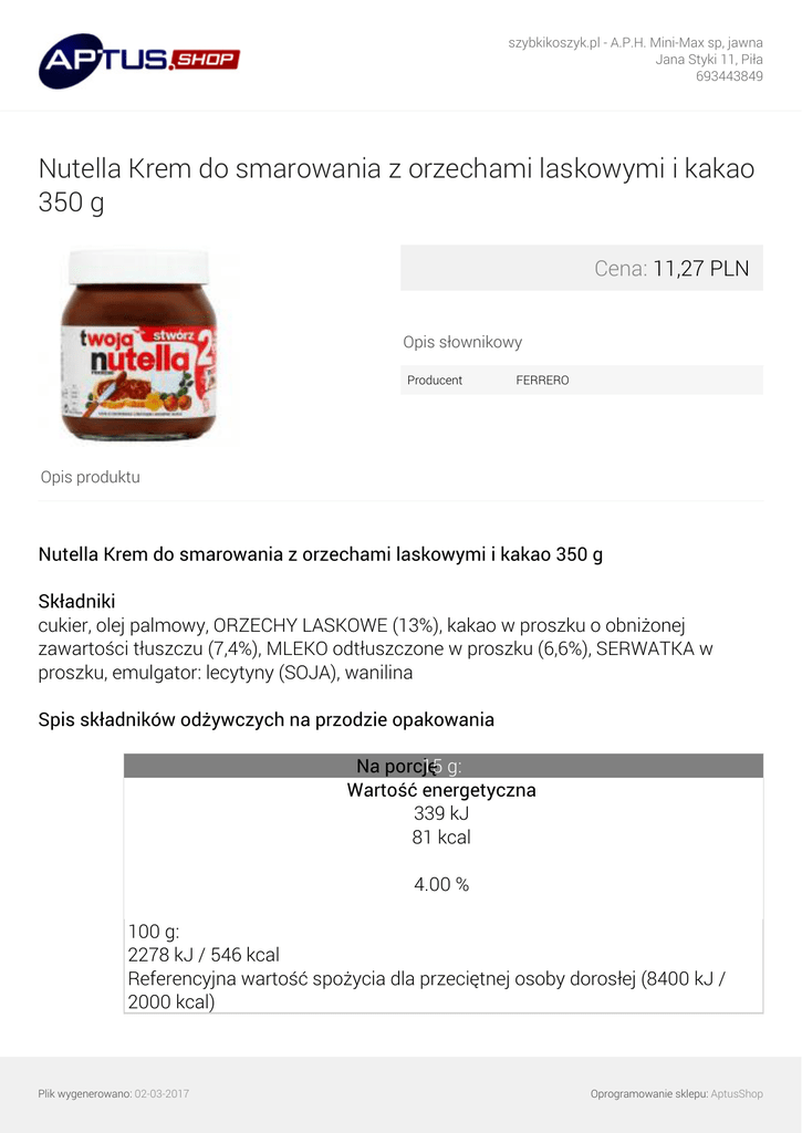 szybkikoszyk.pl - A.P.H. Mini-Max sp, jawna Jana Styki 11, Piła 693443849 Nutella Krem do smarowania z orzechami laskowymi i kakao 350 g Cena: 11,27 PLN Opis słownikowy Producent FERRERO Opis produktu Nutella Krem do smarowania z orzechami laskowymi i kakao 350 g Składniki cukier, olej palmowy, ORZECHY LASKOWE (13%), kakao w proszku o obniżonej zawartości tłuszczu (7,4%), MLEKO odtłuszczone w proszku (6,6%), SERWATKA w proszku, emulgator: lecytyny (SOJA), wanilina Spis składników odżywczych na przodzie opakowania Na porcję 15 g: Wartość energetyczna 339 kJ 81 kcal 4.00 % 100 g: 2278 kJ / 546 kcal Referencyjna wartość spożycia dla przeciętnej osoby dorosłej (8400 kJ / 2000 kcal) Plik wygenerowano: 02-03-2017 Oprogramowanie sklepu: AptusShop szybkikoszyk.pl - A.P.H. Mini-Max sp, jawna Jana Styki 11, Piła 693443849 Wartości odżywcze Średnia wartość 15 g odżywcza 100 g Wartość energetyczna (kJ/kcal) %* 15 g Tłuszcz (g) w tym kwasy tłuszczowe nasycone (g) Węglowodany (g) w tym cukry (g) Białko (g) Sól (g) *Referencyjna wartość spożycia dla przeciętnej osoby dorosłej (8400 kJ / 2000 kcal) Nazwa produktu uregulowana prawnie Krem do smarowania z orzechami laskowymi i kakao Marka Plik wygenerowano: 02-03-2017 Oprogramowanie sklepu: AptusShop szybkikoszyk.pl - A.P.H. Mini-Max sp, jawna Jana Styki 11, Piła 693443849 Nutella Cechy nie zawiera substancji konserwujących i barwników Marka producenta Marka: Ferrero Marka standaryzowana Marka: Nutella Adres firmy ul. Wiertnicza 126 02-952 Warszawa Pozostałe informacje 15 g: 339 kJ 81 kcal 4%* 100 g: 2278 kJ / 546 kcal *Referencyjna wartość spożycia dla przeciętnej osoby dorosłej (8400 kJ / 2000 kcal) Dodatkowe informacje twoja nutella stwórz 2 własne etykiety gratis 1. Kup promocyjny słoik Nutella 350 g lub 600 g 2. Odklej naklejkę umieszczoną na wieczku i odczytaj kod 3. Wejdź na nutella.pl i stwórz dwie własne etykiety 4. Etykiety otrzymasz pocztą gratis Szczegóły na: www.nutella.pl www.facebook.com W promocji biorą udział opakowania 350 g i 600 g. Company Name Ferrero Polska Commercial Sp. z o.o. Zalecenia dla alergików Mleko: Zawiera Orzechy laskowe: Zawiera Soja: Zawiera Dodatki Substancje konserwujące: Nie zawiera Barwniki: Nie zawiera Rodzaj przechowywania Typ: Przechowywać w temperaturze otoczenia Plik wygenerowano: 02-03-2017 Oprogramowanie sklepu: AptusShop szybkikoszyk.pl - A.P.H. Mini-Max sp, jawna Jana Styki 11, Piła 693443849 Warunki przechowywania Min. temp. °C: 18 Maks. temp. °C: 24 Rozmiar opakowania 350 Jednostka (tekst opisowy) g Pozostały tekst dotyczący ilości porcji/użyć 350 g ≈ 23 x 15 g Średnia miara Średnia miara (e) Informacje o recyklingu Opakowanie: Szkło - powszechnie recyklingowane Jednostka (specyficzna) Jednostka (specyficzna): Gramów Rodzaj opakowania Typ: Słoik Wymiar liczbowy Wymiar liczbowy: 350 Wymiar Wymagana wysokość na półce: 105 Wymagana szerokość na półce: 89 Wymagana głębokość na półce: 79 Waga Waga brutto: 563 Sprzedaż jednostkowa Plik wygenerowano: 02-03-2017 Oprogramowanie sklepu: AptusShop szybkikoszyk.pl - A.P.H. Mini-Max sp, jawna Jana Styki 11, Piła 693443849 Wysokość: 105 Szerokość: 89 Głębokość: 79 Adres producenta Ferrero Polska Commercial Sp. z o.o. ul. Wiertnicza 126 02-952 Warszawa Adres zwrotny Ferrero Polska Commercial Sp. z o.o. ul. Wiertnicza 126 02-952 Warszawa Infolinia Ferrero Polska: 801 550 550 Telefon/Fax kontaktowy 801550550 Języki na opakowaniu polski Język produktu Główny język opisu: polski Język danych: polski Podzielony opis produktu Nazwa funkcjonalna: Krem do smarowania z orzechami laskowymi i kakao Plik wygenerowano: 02-03-2017 Powered by TCPDF (www.tcpdf.org) Oprogramowanie sklepu: AptusShop
