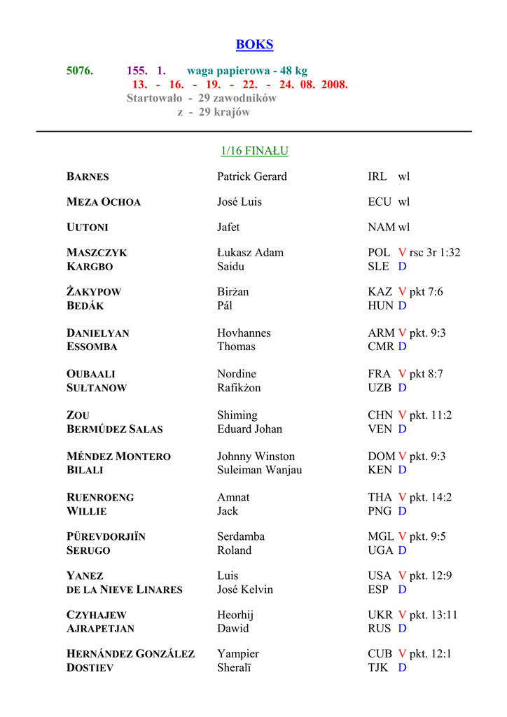 BOKS 5076. 155. 1. waga papierowa - 48 kg 13. - 16. - 19. - 22. - 24. 08. 2008. Startowało - 29 zawodników z - 29 krajów _________________________________________________________________________ 1/16 FINAŁU BARNES Patrick Gerard IRL wl MEZA OCHOA José Luis ECU wl UUTONI Jafet NAM wl MASZCZYK KARGBO Łukasz Adam Saidu POL V rsc 3r 1:32 SLE D śAKYPOW BEDÁK BirŜan Pál KAZ V pkt 7:6 HUN D DANIELYAN ESSOMBA Hovhannes Thomas ARM V pkt. 9:3 CMR D OUBAALI SUŁTANOW Nordine RafikŜon FRA V pkt 8:7 UZB D ZOU BERMÚDEZ SALAS Shiming Eduard Johan CHN V pkt. 11:2 VEN D MÉNDEZ MONTERO BILALI Johnny Winston Suleiman Wanjau DOM V pkt. 9:3 KEN D RUENROENG WILLIE Amnat Jack THA V pkt. 14:2 PNG D PÜREVDORJIÏN SERUGO Serdamba Roland MGL V pkt. 9:5 UGA D YANEZ DE LA NIEVE LINARES Luis José Kelvin USA V pkt. 12:9 ESP D CZYHAJEW AJRAPETJAN Heorhij Dawid UKR V pkt. 13:11 RUS D HERNÁNDEZ GONZÁLEZ DOSTIEV Yampier Sheralī CUB V pkt. 12:1 TJK D PLANGE TAÑAMOR Manyo Harry Sorsone GHA V pkt. 6:3 PHI D SANTOS CARVALHO Paulo BRA V pkt. 13:7 BOUCHTOUK Redouane MAR D _________________________________________________________________________ 1/8 FINAŁU BARNES MEZA OCHOA Patrick Gerard José Luis IRL V pkt. 14:8 ECU D MASZCZYK UUTONI Łukasz Adam Jafet POL V pkt. +5:5 NAM D śAKYPOW DANIELYAN BirŜan Hovhannes KAZ V pkt 13:7 ARM D ZOU OUBAALI Shiming Nordine CHN V pkt. +3:3 FRA D RUENROENG MÉNDEZ MONTERO Amnat Johnny Winston THA V pkt. 7:3 DOM D PÜREVDORJIÏN YANEZ Serdamba Luis MGL V pkt. 8:7 USA D HERNÁNDEZ GONZÁLEZ CZYHAJEW Yampier Heorhij CUB V pkt. 21:3 UKR D SANTOS CARVALHO Paulo BRA V pkt. 21:12 PLANGE Manyo GHA D _________________________________________________________________________ ĆWIERĆFINAŁY BARNES MASZCZYK Patrick Gerard Łukasz Adam IRL V pkt. 11:5 POL D ZOU śAKYPOW Shiming BirŜan CHN V pkt. 9:4 KAZ D PÜREVDORJIÏN RUENROENG Serdamba Amnat MGL V pkt. 5:2 THA D HERNÁNDEZ GONZÁLEZ Yampier CUB V pkt. 21:6 SANTOS CARVALHO Paulo BRA D _________________________________________________________________________ PÓŁFINAŁY ZOU BARNES Shiming Patrick Gerard CHN V pkt. 15:0 IRL D PÜREVDORJIÏN Serdamba MGL V pkt. +8:8 Yampier CUB D HERNÁNDEZ GONZÁLEZ _________________________________________________________________________ FINAŁ ZOU Shiming CHN V podd. 2r 0:19 Serdamba MGL D PÜREVDORJIÏN _________________________________________________________________________ 1.ZOU Shiming CHN 2.PÜREVDORJIÏN Serdamba MGL 3.BARNES Patrick Gerard IRL 3.HERNÁNDEZ GONZÁLEZ Yampier CUB 5.MASZCZYK Łukasz Adam POL 5.śAKYPOW BirŜan KAZ 5.RUENROENG Amnat THA 5.SANTOS CARVALHO Paulo BRA _________________________________________________________________________ 5077. 156. 2. waga musza - 51 kg 12. - 16. - 20. - 22. - 23. 08. 2008. Startowało - 27 zawodników z - 27 krajów _________________________________________________________________________ 1/16 FINAŁU ARROYO ACEVEDO McWilliams PUR wl KALUCZA Norbert HUN wl LAFFITA HERNÁNDEZ Andris CUB wl YAFAI Khalid Saeed GBR wl BAŁAKSZIN Georgij RUS wl SARSEMBAJEW KACZOR Mirat Rafał KAZ V pkt. 14:5 POL D DONIJAROW IRUNGU Tolaszboj Bernard Ngumba UZB V pkt. 10:1 KEN D KUMAR MEMIŞ Jitender Furkan Ulaş IND V podd 3r 1:21 TUR D PAYANO PICHARDO THOMAS Juan Carlos Jérôme Cédric DOM V pkt. 10:6 FRA D PICARDI CHIYANIKA Vincenzo Cassius ITA V pkt. 10:3 ZAM D CHÉRIF SUTHERLAND Walid Stephen TUN V pkt. 14:2 AUS D LEE WARREN Ok-Seong Rau’Shee KOR V pkt. 9:8 USA D MƏMMƏDOV NHAILA Samir Abdelillah AZE V pkt. 19:4 MAR D JONGJOHOR VALENZUELA BARILLAS Somjit Eddie THA V pkt. 6:1 GUA D VIEIRA DE JESUS RATNAYAKE Robenilson Anuruddha Bandara BRA V pkt. 13:3 SRI D YUNUSOV Anvar TJK V pkt.9:1 CHAUKE Jackson van Tonder SAF D _________________________________________________________________________ 1/8 FINAŁU ARROYO ACEVEDO KALUCZA McWilliams Norbert PUR V pkt. 14:6 HUN D LAFFITA HERNÁNDEZ YAFAI Andris Khalid Saeed CUB V pkt. 9:3 GBR D BAŁAKSZIN SARSEMBAJEW Georgij Mirat RUS V pkt. 12:4 KAZ D KUMAR DONIJAROW Jitender Tolaszboj IND V pkt. 13:6 UZB D PICARDI PAYANO PICHARDO Vincenzo Juan Carlos ITA V pkt. 8:4 DOM D CHÉRIF LEE Walid Ok-Seong TUN V pkt. 11:5 KOR D JONGJOHOR MƏMMƏDOV Somjit Samir THA V pkt. 10:2 AZE D YUNUSOV Anvar TJK V pkt. 12:6 VIEIRA DE JESUS Robenilson BRA D _________________________________________________________________________ ĆWIERĆFINAŁY LAFFITA HERNÁNDEZ ARROYO ACEVEDO Andris McWilliams CUB V pkt. 11:2 PUR D BAŁAKSZIN KUMAR Georgij Jitender RUS V pkt. 15:11 IND D PICARDI CHÉRIF Vincenzo Walid ITA V pkt. 7:5 TUN D JONGJOHOR Somjit THA V pkt. 8:1 YUNUSOV Anvar TJK D _________________________________________________________________________ PÓŁFINAŁY LAFFITA HERNÁNDEZ BAŁAKSZIN Andris Georgij CUB V pkt. 9:8 RUS D JONGJOHOR Somjit THA V pkt. 7:1 PICARDI Vincenzo ITA D _________________________________________________________________________ FINAŁ JONGJOHOR Somjit THA V pkt. 8:2 LAFFITA HERNÁNDEZ Andris CUB D _________________________________________________________________________ 1.JONGJOHOR Somjit THA 2.LAFFITA HERNÁNDEZ Andris CUB 3.BAŁAKSZIN Georgij RUS 3.PICARDI Vincenzo ITA 5.ARROYO ACEVEDO McWilliams PUR 5.KUMAR Jitender IND 5.CHÉRIF Walid TUN 5.YUNUSOV Anvar TJK _________________________________________________________________________ 5078. 157. 3. waga kogucia - 54 kg 12. - 15. - 18. - 22. - 24. 08. 2008. Startowało - 27 zawodników z - 27 krajów _________________________________________________________________________ 1/16 FINAŁU PETCHKOOM Worapoj THA wl PARRINELLO Jahyn Vittorio ITA wl LEÓN ALARCÓN Yankiel CUB wl ABUTALIPOW Kanat KAZ wl HAN Sun-Cheol KOR wl MANZANILLA RANGEL SAMIR Héctor Issah VEN V pkt. 13:10 GHA D JULIE NKETU Louis Richard Bruno Emanuel Thabiso MRI V pkt. 17:8 LES D TODśIBOJEW RAHIMOV Churszid Rustamhodza UZB V pkt. 11:2 GER D GU MURRAY Yu Joseph CHN V pkt. 17:7 GBR D GOJAN CHACIGOW Veaceslav ChawaŜi MOL V pkt. +1:1 BLR D WODOPJANOW ARROYO ACEVEDO Siergiej McJoe RUS V pkt. 10:5 PUR D KUMAR HA