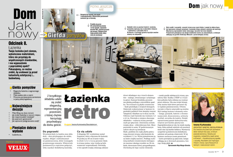 Dom jak nowy fot. DECOLATORIUM fotki jeszcze nie Składzik był wysoki, ale wąski i niefunkcjonalny. Właściciele postanowili zamienić go w łazienkę Przebito się przez 50-centymetrową ścianę i w ten sposób, częściowo kosztem WC, powstał prysznic (po prawej). Szklane drzwi mają uchylny lufcik, który służy do wentylacji Dodatki retro w postaci baterii, lusterka, grzejnika wpisują się w charakter miejsca – kamienicy z początku XX w. W blacie z czarnego granitu wycięto owalne otwory na umywalki. Biel szafki i ceramiki, szarość ścian oraz czerń blatu i ramek to dobra baza do tworzenia różnych aranżacji. Łazienkę łatwo zmienić zależnie od nastroju. Wystarczy wprowadzić kolor wieszając ręczniki lub inne dodatki. Przestrzeń powiększa się dzięki wielkiemu lustru na umywalkami, w którym odbijają się grafiki Andrzeja Mleczki z przeciwległej ściany Odcinek 8. Łazienka Mały lifting czy duży remont Jak zrobić łazienkę w nowym miejscu Jak rozporowadzić instalacje? Jak poprawić ogrzewanie? Jak usprawnić podgrzewanie wody? Do poprawki • Łazienka za... Partner odcinka 2 murator 10 2013 Łazienka retro Projekt Iwona Kurkowska/Decolatorium Wcześniej były tu toaleta oraz składzik – dwa przylegające do siebie, wąskie, długie i niefunkcjonalne pomieszczenia, które wymagały gruntownego remontu. Właściciele postanowili je częściowo połączyć, żeby uzyskać dodatkową łazienkę. Co się udało Z długiego WC wydzielony został fragment, który włączono do łazienki. W grubej na 50 cm ścianie wykuto otwór 1,2 x 1,1 m na prysznic (była to ściana nośna, więc trzeba ją było wzmocnić wspornikami). Powstałą w ten sposób wnękę osłaniają szklane drzwi składające się z trzech elementów – stałego, otwieranego i uchylnego (u góry). Zamiast brodzika prysznic ma płaską podłogę o niewielkim spadku. Na ścianach są płytki ceramiczne – białe prostokąty o ściętych brzegach. Materiały wykorzystane w łazience to produkty polskich firm (między innymi Tubądzin). Kładłam na to duży nacisk. Główna część łazienki ma wymiary 1,4 x 4,5 m. Powstała w miejscu dawnego składziku – wykucie ściany powiększyło go optycznie. Zmieniona została wnęka okna – zlikwidowano łuk. Okno pozostało to samo. W podwieszanym suficie ukryte są instalacje. Białe, podobne do cegły płytki pokrywają również ścianę całej łazienki do wysokości 1,1 m. Wyżej pomalowano ją na kolor ciepłej szarości. Podłogę wyłożoną kaflami ceramicznymi imitującymi marmur okalają wysokie na 18 cm, białe, drewniane listwy przypodłogowe. Dochodzą do tego czarne elementy – ramki grafik zdobiących ściany, granitowy blat. Szafka z MDF-u o wysokim połysku była robiona na wymiar przez stolarza. Ma ona ścięte brzegi, żeby można było łatwo poruszać się w wąskim pomieszczeniu. Otwory wycięte w blacie umywalki są owalne. Styl nadają łazience elementy retro – lampy, grzejnik, baterie z chromowanej stali, deszczownica, uchwyty szuflad, szczotka do toalety. Dzięki ograniczonej gamie kolorystycznej wnętrze jest bardzo plastyczne. Zaprojektowałam je tak, by miało męską bazę, która jednak zależnie od aranżacji może stać się bardzo kobieca. Wystarczy uzupełnić ją kolorowymi dodatkami, zależnie od nastroju właścicieli. W tej łazience zachwyca mnie przestrzeń – lustro powiększa ją optycznie, lampy odbijają się w drzwiach prysznica, tworząc iluzję głębi. r Opracowanie Maja Mozga-Górecka fot. z prywatnego archiwum • • • • • Z brzydkiego składziku udało się zrobić elegancką, reprezentacyjną przestrzeń, z której chętnie korzystają przychodzący do domu goście. fot. DECOLATORIUM • • Elegancka łazienka z zagraconego składziku Mała toaleta cała w czerni Mroczne pomieszczenie zamienione w jasny pokój kąpielowy fot. DECOLATORIUM • fot. DECOLATORIUM Twoja łazienka jest ciemna, wykończona materiałami, które nie przystają do współczesnych standardów, i ma wyposażenie z poprzedniej epoki? Pokazujemy, co można zrobić, by uratować ją przed katastrofą estetyczną i... budowlaną. Iwona Kurkowska architekt wnętrz, Decolatorium Dla inwestora kluczowe było zachowanie detali istotnych dla czasu, w którym powstała kamienica. Stolarka jest oryginalna, zostawiliśmy nawet zamek w drzwiach – charakterystyczną zapadkę z zasuwką. Rezultatem jest inspirujące miejsce z duszą. Łączy klasycyzm ze świeżym i nowoczesnym stylem. murator 10 2013 3