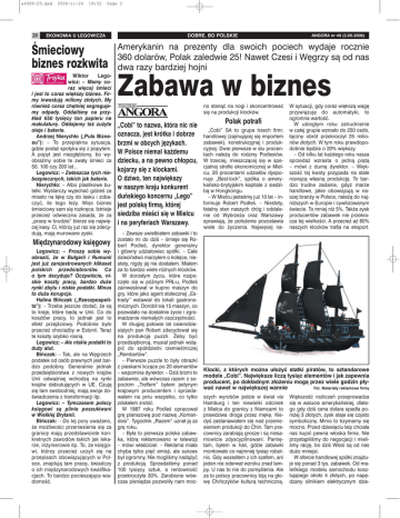 a4928-29.qxd 28 2006-11-24 18:52 Page 2 EKONOMIA U LEGOWICZA DOBRE, BO POLSKIE ANGORA nr 49 (3.XII.2006) Śmieciowy biznes rozkwita Amerykanin na prezenty dla swoich pociech wydaje rocznie 360 dolarów, Polak zaledwie 25! Nawet Czesi i Węgrzy są od nas dwa razy bardziej hojni Wiktor Legowicz: – Mamy coraz więcej śmieci i jest to coraz większy biznes. Firmy inwestują miliony złotych. My również coraz chętniej segregujemy odpady. Oddaliśmy na przykład 650 tysięcy ton papieru na makulaturę. Oddajemy też zużyte oleje i baterie. Andrzej Nierychło („Puls Biznesu”): – To przepiękna sytuacja, gdzie podaż spotyka się z popytem. A popyt jest niezgłębiony, bo wyobraźmy sobie te zwały śmieci za 50, 100 czy 200 lat... Legowicz: – Zwłaszcza tych niebezpiecznych, takich jak baterie. Nierychło: – Albo plastikowe butelki. Wystarczy wyjechać gdzieś za miasto na łąkę czy do lasku i zobaczyć, ile tego leży. Więc biznes śmieciowy sam się rozkręca. Istnieje przecież odwieczna zasada, że za „pracę w brudzie” bierze się najwięcej kasy. Ci, którzy już raz się zdecydują, mają murowane zyski. Zabawa w biznes Międzynarodowy księgowy Legowicz: – Proszę sobie wyobrazić, że w Bułgarii i Rumunii jest już zarejestrowanych kilkaset polskich przedsiębiorstw. Co o tym decyduje? Oczywiście, niskie koszty pracy, bardzo duże rynki zbytu i niskie podatki. Minus to duża korupcja. Halina Bińczak („Rzeczpospolita”): – Trzeba jeszcze dodać, że są to kraje, które będą w Unii. Co do kosztów pracy, to jednak jest to efekt przejściowy. Podobnie było przecież chociażby w Estonii. Teraz te koszty szybko rosną. Legowicz: – Ale niskie podatki to duży atut. Bińczak: – Tak, ale na Węgrzech podatek od osób prawnych jest bardzo podobny. Generalnie jednak przedsiębiorstwa z nowych krajów Unii odważniej wchodzą na rynki krajów debiutujących w UE. Czują się tam swobodniej, mają swoje doświadczenia z transformacji itp. Legowicz: – Tymczasem polscy księgowi są pilnie poszukiwani w Wielkiej Brytanii. Bińczak: – Do tej pory uważano, że możliwości przeniesienia się za granicę mają przedstawiciele konkretnych zawodów takich jak lekarze, inżynierowie itp. To, że księgowi, którzy przecież uczyli się na przepisach obowiązujących w Polsce, znajdują tam pracę, świadczy o ich międzynarodowych kwalifikacjach. To bardzo pocieszająca wiadomość. no stanąć na nogi i skoncentrować się na produkcji klocków. „Cobi” to nazwa, która nic nie oznacza, jest krótka i dobrze brzmi w obcych językach. W Polsce niemal każdemu dziecku, a na pewno chłopcu, kojarzy się z klockami. O dziwo, ten największy w naszym kraju konkurent duńskiego koncernu „Lego” jest polską firmą, której siedziba mieści się w Mielcu i na peryferiach Warszawy. – Zawsze uwielbiałem zabawki i to zostało mi do dziś – śmieje się Robert Podleś, dyrektor generalny i główny udziałowiec spółki. – Całe dzieciństwo marzyłem o kolejce, niestety, nigdy jej nie dostałem. Miałem za to bardzo wiele różnych klocków. W dorosłym życiu, które rozpoczęło się w późnym PRL-u, Podleś zainwestował w kupno maszyn do gry, które jako agent stołecznej „Estrady” wstawiał do lokali gastronomicznych. Dorobił się 15 maszyn, co pozwalało na dostatnie życie i zgromadzenie niemałych oszczędności. W drugiej połowie lat osiemdziesiątych pan Robert zdecydował się na produkcję puzzli. Żeby być przedsiębiorcą, musiał jednak wstąpić do spółdzielni rzemieślniczej „Rembertów”. – Pierwsze puzzle to były obrazki z pieskami liczące po 20 elementów – wspomina dyrektor. – Dziś brzmi to zabawnie, ale wówczas razem z sopockim „Treflem” byłem jedynym krajowym producentem i sprzedawałem na pniu wszystko, co tylko zdołałem zrobić. W 1987 roku Podleś opracował grę planszową pod nazwą „Komandosi”. Tygodnik „Razem” uznał ją za grę roku. – Była to pierwsza polska zabawka, którą reklamowano w telewizji – mówi właściciel. – Reklama miała chyba tylko pięć emisji, ale sukces był ogromny. Nie mogliśmy nadążyć z produkcją. Sprzedaliśmy ponad 100 tysięcy sztuk, a rentowność przekroczyła 30%. Zarobione wówczas pieniądze pozwoliły nam moc- Polak potrafi „Cobi” SA to grupa trzech firm: handlowej (zajmującej się importem zabawek), konstrukcyjnej i produkcyjnej. Dwie pierwsze w stu procentach należą do rodziny Podlesiów. W trzeciej, mieszczącej się w specjalnej strefie ekonomicznej w Mielcu, 20 procentami udziałów dysponuje „Best-lock”, spółka o amerykańsko-brytyjskim kapitale z siedzibą w Hongkongu. – W Mielcu jesteśmy już 10 lat – informuje Robert Podleś. – Niestety, fatalny stan naszych dróg i oddalenie od Wybrzeża oraz Warszawy sprawiają, że położenie pozostawia wiele do życzenia. Najwięcej na- W sytuacji, gdy coraz większą wagę przywiązuję do automatyki, to ogromna wartość. W ubiegłym roku zatrudnienie w całej grupie wzrosło do 250 osób, łączny obrót przekroczył 25 milionów złotych. W tym roku prawdopodobnie będzie o 20% większy. – Od kilku lat każdego roku nasza sprzedaż wzrasta o jedną piątą – mówi z dumą dyrektor. – Większość tej kwoty przypada na stale rosnącą własną produkcję. To bardzo trudne zadanie, gdyż marże handlowe, jakie obowiązują w naszej branży w Polsce, należą do najniższych w Europie i cywilizowanym świecie. To mniej niż 5%. Także zysk producentów zabawek nie przekracza tej wielkości. A przecież aż 60% naszych klocków trafia na eksport. Klocki, z których można ułożyć statki piratów, to sztandarowe modele „Cobi”. Największe liczą tysiąc elementów i jak zapewnia producent, po dokładnym złożeniu mogą przez wiele godzin pływać nawet w największej wannie Fot. Materiały reklamowe firmy szych wyrobów jedzie w świat via Hamburg i ten niewielk