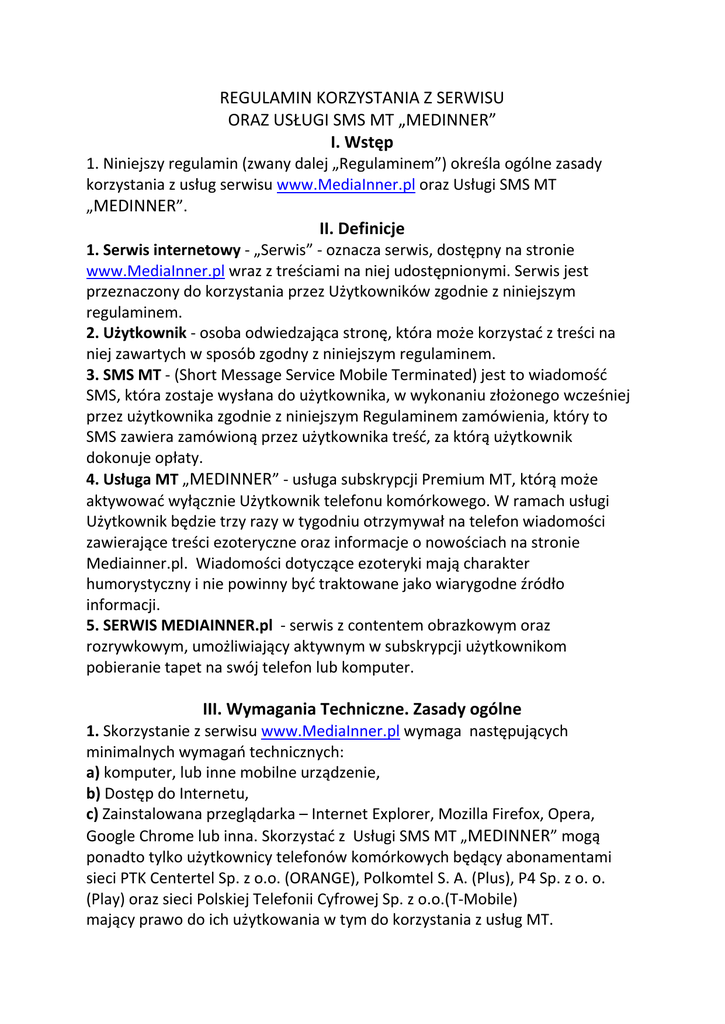 REGULAMIN KORZYSTANIA Z SERWISU ORAZ USŁUGI SMS MT „MEDINNER” I. Wstęp 1. Niniejszy regulamin (zwany dalej „Regulaminem”) określa ogólne zasady korzystania z usług serwisu www.MediaInner.pl oraz Usługi SMS MT „MEDINNER”. II. Definicje 1. Serwis internetowy - „Serwis” - oznacza serwis, dostępny na stronie www.MediaInner.pl wraz z treściami na niej udostępnionymi. Serwis jest przeznaczony do korzystania przez Użytkowników zgodnie z niniejszym regulaminem. 2. Użytkownik - osoba odwiedzająca stronę, która może korzystad z treści na niej zawartych w sposób zgodny z niniejszym regulaminem. 3. SMS MT - (Short Message Service Mobile Terminated) jest to wiadomośd SMS, która zostaje wysłana do użytkownika, w wykonaniu złożonego wcześniej przez użytkownika zgodnie z niniejszym Regulaminem zamówienia, który to SMS zawiera zamówioną przez użytkownika treśd, za którą użytkownik dokonuje opłaty. 4. Usługa MT „MEDINNER” - usługa subskrypcji Premium MT, którą może aktywowad wyłącznie Użytkownik telefonu komórkowego. W ramach usługi Użytkownik będzie trzy razy w tygodniu otrzymywał na telefon wiadomości zawierające treści ezoteryczne oraz informacje o nowościach na stronie Mediainner.pl. Wiadomości dotyczące ezoteryki mają charakter humorystyczny i nie powinny byd traktowane jako wiarygodne źródło informacji. 5. SERWIS MEDIAINNER.pl - serwis z contentem obrazkowym oraz rozrywkowym, umożliwiający aktywnym w subskrypcji użytkownikom pobieranie tapet na swój telefon lub komputer. III. Wymagania Techniczne. Zasady ogólne 1. Skorzystanie z serwisu www.MediaInner.pl wymaga następujących minimalnych wymagao technicznych: a) komputer, lub inne mobilne urządzenie, b) Dostęp do Internetu, c) Zainstalowana przeglądarka – Internet Explorer, Mozilla Firefox, Opera, Google Chrome lub inna. Skorzystad z Usługi SMS MT „MEDINNER” mogą ponadto tylko użytkownicy telefonów komórkowych będący abonamentami sieci PTK Centertel Sp. z o.o. (ORANGE), Polkomtel S. A. (Plus), P4 Sp. z o. o. (Play) oraz sieci Polskiej Telefonii Cyfrowej Sp. z o.o.(T-Mobile) mający prawo do ich użytkowania w tym do korzystania z usług MT. 2. Użytkownicy zobowiązani są do korzystania z Serwisu w granicach obowiązującego w Polsce prawa, zgodnie z postanowieniami niniejszego Regulaminu oraz dobrymi obyczajami, w szczególności dotyczącymi korzystania z sieci internet. 3. Użytkownik w szczególności nie może: a) naruszad praw bądź zakłócad możliwości korzystania z Serwisu przez innych użytkowników; b) naruszad praw własności intelektualnej osób trzecich; c) korzystad z Serwisu w sposób, który może doprowadzid do naruszenia prawidłowego działania oferowanych w nim usług; 4. Poprzez zarejestrowanie się w serwisie www.MediaInner.pl użytkownik akceptuje postanowienia niniejszego regulaminu oraz wyraża zgodę na otrzymywanie informacji o serwisie drogą elektroniczną na podany mail i numer telefonu oraz użytkownik wyraża zgodę na otrzymywanie informacji o nowościach a także treści reklamowych na maila i numer telefonu podanego podczas rozwiązywania testu. Użytkownik ma prawo w każdym czasie odwoład zgodę na otrzymywanie powyższych informacji poprzez zgłoszenie tego faktu administratorowi na adres mail [email protected]. IV. Uzyskanie dostępu do płatnych zasobów Serwisu 1. W celu skorzystania z płatnych zasobów serwisu Użytkownik powinien rozwiązad test, a następnie uruchomid usługę subskrypcji MT „MEDINNER”. 2. Aby uruchomid usługę subskrypcji MT „MEDINNER” Użytkownik powinien po rozwiązaniu testu, o którym mowa w ust.1 podad swój numer telefonu, dzięki czemu Użytkownik otrzyma specjalny kod PIN. Kod ten następnie Użytkownik powinien wprowadzid w formularzu, który pojawi się po ukooczeniu testu dzięki temu wprowadzeniu Użytkownik otrzyma również dostęp do strefy zawierającej wynik testu. Ponadto użytkownik może uruchomid usługę poprzez podanie swojego numeru telefonu, a następnie wysłanie wiadomości SMS o treści START MEDINNER na numer 60555. 3. Użytkownik w treści darmowej wiadomości SMS wysyłanej po rejestracji do usługi subskrypcji MT otrzyma bezpośredni link do pobrania regulaminu zamówionej usługi w aktualnej wersji wraz z informacją o potwierdzeniu zamówienia. 4.Użytkownik aktywujący subskrypcję usługi MT „MEDINNER” wyraża zgodę na otrzymywanie wiadomości z zamówioną treścią w częstotliwościach i o porach wskazanych w niniejszym Regulaminie na podany przez siebie numer telefonu. 5.Po aktywacji użytkownik otrzymuję wiadomośd powitalną. Koszt wiadomości powitalnej to 6,15 zł brutto. 6.Wiadomości będą wysyłane w poniedziałek, środę oraz piątek o godzinie 18:00. 7. Koszt usługi to 6,15 zł brutto za każdy SMS otrzymany w ramach subskrypcji. W ramach usługi Użytkownik otrzymuje maksymalnie trzy SMS na tydzieo oraz dodatkowy SMS po aktywacji subskrypcji. Łączny koszt usługi w okresie miesiąca to: 79,95zł brutto. Pobranie wybranych elementów multimedialnych może ponadto wiązad się z opłatami za transfer danych, zgodnie z cennikami operatora. 8. Usługa jest aktywowana na czas nieokreślony. 9. Użytkownik może w każdej chwili zrezygnowad z usługi. Aby dokonad rezygnacji należy wysład SMS o treści STOP MEDINNER na numer 60555. Koszt wysłania wiadomości jest zgodny z cennikiem operatora. 10. Usługa będzie dostępna od 20.10.2016 do odwołania. V. Prawo do odstąpienia od umowy Usługa MT „MEDINNER” jest aktywowana automatycznie po potwierdzenia wpłaty od Operatora SMS. Rozpoczęcie korzystania z usługi MT „MEDINNER”, oznacza żądanie świadczenia usługi przed upływem terminu odstąpienia od umowy tj. przed upływem 14 dni. Jest to równoznaczne z utratą przez Użytkownika prawa odstąpienia od umowy na usługę MT „MEDINNER” zgodnie z art. 38 pkt. 13 ustawy z dnia 30 maja 2014 r. o prawach ko