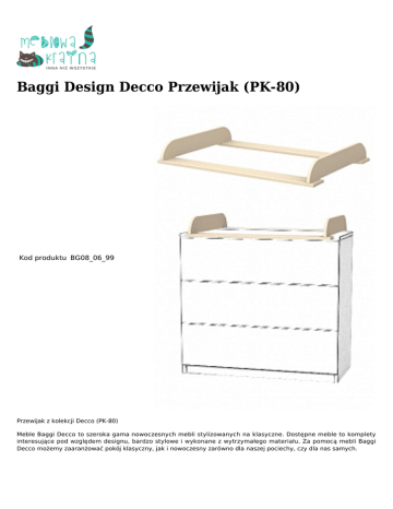 Baggi Design Decco Przewijak (PK-80) Kod produktu BG08_06_99 Przewijak z kolekcji Decco (PK-80) Meble Baggi Decco to szeroka gama nowoczesnych mebli stylizowanych na klasyczne. Dostępne meble to komplety interesujące pod względem designu, bardzo stylowe i wykonane z wytrzymałego materiału. Za pomocą mebli Baggi Decco możemy zaaranżować pokój klasyczny, jak i nowoczesny zarówno dla naszej pociechy, czy dla nas samych. Uniwersalny, lakierowany przewijak przeznaczony do montażu na komody: K3-80 /aby zastosować przewijak nie należy montować wieńca komody/ i K3-90 oraz szafki SN-90. Czas oczekiwania: 4-6 tygodni. Wymiary: 18 cm x 80 cm x 65 cm (wysokość x szerokość x głębokość) Konstrukcja: płyta meblowa. Kolorystyka: beżowy (Cream), biały (White), grafitowy (Graphite). Gwarancja: 24 miesiące. Mebel do samodzielnego montażu.