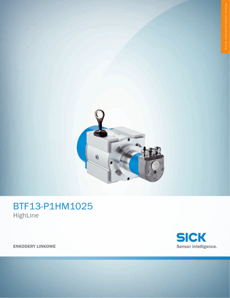 Karta charakterystyki online BTF13-P1HM1025 HighLine ENKODERY LINKOWE BTF13-P1HM1025 | HighLine ENKODERY LINKOWE A B C D E F H I J K L M N O P Q R S T Informacje do zamówienia Typ Nr artykułu BTF13-P1HM1025 więcej wersji urządzeń i akcesoriów 1034307 www.sick.com/HighLine Opis produktu Rysunek może się różnić Przy długości linki od 2 m do 50 m enkodery linkowe serii HighLine zapewniają dużą rozpiętość zakresu pomiaru. Dzięki krążkom prowadzącym, które pozwalają na prowadzenie linki z omijaniem przeszkód, rodzina produktów HighLine nadaje się do zastosowania przy nieprostych odcinkach pomiarowych. Ponadto, dzięki wytrzymałemu korpusowi i zgarniającym brud szczotkom, enkodery te charakteryzują się wysoką odpornością na pył, brud, udary i drgania, a zatem wysoką trwałością użytkową. W skrócie • Długości pomiarowe: 2 m ... 50 m • Modułowy system pomiarowy z dużym wyborem interfejsów/długości pomiarowych • Bardzo wytrzymały system (zgarniacze brudu, wbudowane szczotki) • Wysokiej klasy mechanizm zwijania i prowadzenia linki • Wysoki stopień ochrony • Wysoka odporność na udary i drgania • Możliwa bardzo wysoka rozdzielczość • Możliwość rozbudowy za pomocą zewnętrznych akcesoriów Korzyści dla użytkownika • Niezawodne rozwiązanie do zastosowań w ciężkich warunkach otoczenia • Wysoka trwałość użytkowa dzięki wytrzymałemu korpusowi przemysłowemu • Szybka i prosta instalacja bez konieczności precyzyjnego prowadzenia liniowego • Niskie koszty integracji i konserwacji • Możliwość indywidualizacji zmniejsza koszty utrzymania zapasów • Szybkie uruchomienie i możliwość zastosowania taniej karty interfejsowej dzięki analogowemu interfejsowi 2 ENKODERY I CZUJNIKI NACHYLENIA | SICK Karta charakterystyki online | 2017-02-23 11:18:08 Informacje mogą ulec zmianie bez powiadomienia BTF13-P1HM1025 | HighLine ENKODERY LINKOWE Zakresy stosowania • Pozycjonowanie w systemach obsługi regałów • Pozycjonowanie chwytaka/wózka suwnicowego • Systemy transportu samojezdnego • Windy • Platformy podnośnikowe • Prasy Szczegółowe dane techniczne Wydajność Zakres pomiarowy 0 m ... 10 m Powtarzalność ≤ 1,5 mm 1) Liniowość ≤ ± 2 mm 2) Histereza ≤ 3 mm 1) Rozdzielczość (mechanizm linkowy + enkoder) 0,04 mm 3) 4) 1) 2) 3) 4) Wartość odnosi się do mechanizmu linkowego. Wartość zachowuje ważność przy podaniu dokładnej długości linki pomiarowej na jeden obrót (podana na etykiecie mechanizmu linkowego). Przedstawione wartości są zaokrąglone. Przykładowa kalkulacja na przykładzie BTF08 z interfejsem PROFINET: 200 mm (długość linki wyciąganej na jeden obrót — patrz Dane mechaniczne): 262 144 (liczba kroków na jeden obrót) = 0,001 mm (rozdzielczość kombinacji mechanizmu linkowego z enkoderem). Interfejsy Enkoder Enkoder absolutny Typ przyłącza Adapter magistrali z dławikami kablowymi lub konektorami, promieniowe 1) Ustawienie adresu 0 ... 127, Przełącznik DIP Protokół PROFIBUS DP V0 (A3M60), Profil dla enkoderów (07hex) – Class 2 (ATM60 PROFIBUS) Zakończenie magistrali Za pomocą przełączników DIP Ustawianie (regulacja elektroniczna) Za pomocą przycisku PRESET lub protokołu Profil enkodera Wersja profilu enkodera 1.1 Class 1 i Class2 (A3M60), Profil dla enkoderów (07hex) – Class 2 (ATM60 PROFIBUS) 1) Adapter przyłącza należy zamówić osobno. Dane elektryczne Czas inicjalizacji A3M60, ATM60 PROFIBUS 1) 1) Napięcie zasilające 10 V ... 32 V Pobór mocy 1,5 W, A3M60 2 W, ATM60 PROFIBUS MTTFd: czas do niebezpiecznej awarii 60 lat(a) (A3M60) 2) 3) 150 lat(a) (ATM60 PROFIBUS) 2) 3) 1) 2) Po upływie tego czasu można zmierzyć prawidłowe pozycje. W przypadku tego produktu chodzi o produkt standardowy, a nie o część zabezpieczającą w rozumieniu dyrektywy maszynowej. Obliczenie na podstawie nominalnego obciążenia części, średniej temperatury otoczenia 40 °C, częstości stosowania 8760 h/rok. Wszystkie awarie elektroniczne są uważane za awarie niebezpieczne. Szczegółowe informacje — patrz dokument nr 8015532. 3) Wartość odnosi się tylko do zamontowanego enkodera. 2017-02-23 11:18:08 | Karta charakterystyki online Informacje mogą ulec zmianie bez powiadomienia ENKODERY I CZUJNIKI NACHYLENIA | SICK 3 BTF13-P1HM1025 | HighLine ENKODERY LINKOWE A B C D E F H I J K L M N O P Q R S T Dane mechaniczne Masa (z enkoderem) 3,78 kg (A3M60) 4,09 kg (ATM60 PROFIBUS) Masa (mechanika) 3,5 kg Materiał, linka pomiarowa Wysoce elastyczna pleciona linka stalowa ze stali nierdzewnej 1.4401 V4A Masa (linka pomiarowa) 7,1 g/m Materiał, obudowa mechanizmu linkowego Aluminium (anodowane), tworzywo sztuczne Długość linki wyciąganej na obrót 334,1 mm 1) Siła sprężyny 10 N ... 20 N 2) Trwałość użytkowa mechanizmu linkowego Typ. 1 mln cykli 3) Faktyczna długość wyciąganej linki 10,2 m Średnica linki pomiarowej 1,35 mm Przyspieszenie linki 40 m/s² Prędkość zmiany położenia 8 m/s Zamontowany enkoder ATM60 SSI Liczba kroków na obrót 8.192 Numer kat. enkodera 1030014 Zamontowana mechanika MRA-F130-110D2 Numer kat. mechaniki 6028627 1) 2) 3) Przedstawione wartości są uśrednione. Dokładna długość jest podana na etykiecie mechanizmu linkowego. Wartości te są mierzone w temperaturze otoczenia 25°C. W innych temperaturach wartości mogą się różnić. Jeden cykl obejmuje wyciągnięcie i wciągnięcie linki. Dane dotyczące otoczenia EMC Wg EN 61000-6-2 i EN 61000-6-3 Stopień ochrony enkodera IP67 Stopień ochrony mechaniki IP 64 Odporność na wstrząsy 100 g, 6 ms (wg EN 60068-2-27) Zakres częstotliwości odporności na drgania 30 g, 10 Hz ... 2.000 Hz (wg EN 60068-2-6) Zakres temperatur roboczych (enkoder) –10 °C ... +70 °C, A3M60 –20 °C ... +70 °C, ATM60 PROFIBUS Zakres temperatur roboczych (mechanika) –30 °C ... +70 °C Zakres temperatur roboczych (kombinacja) Jest określany przez wyższą minimalną i ni