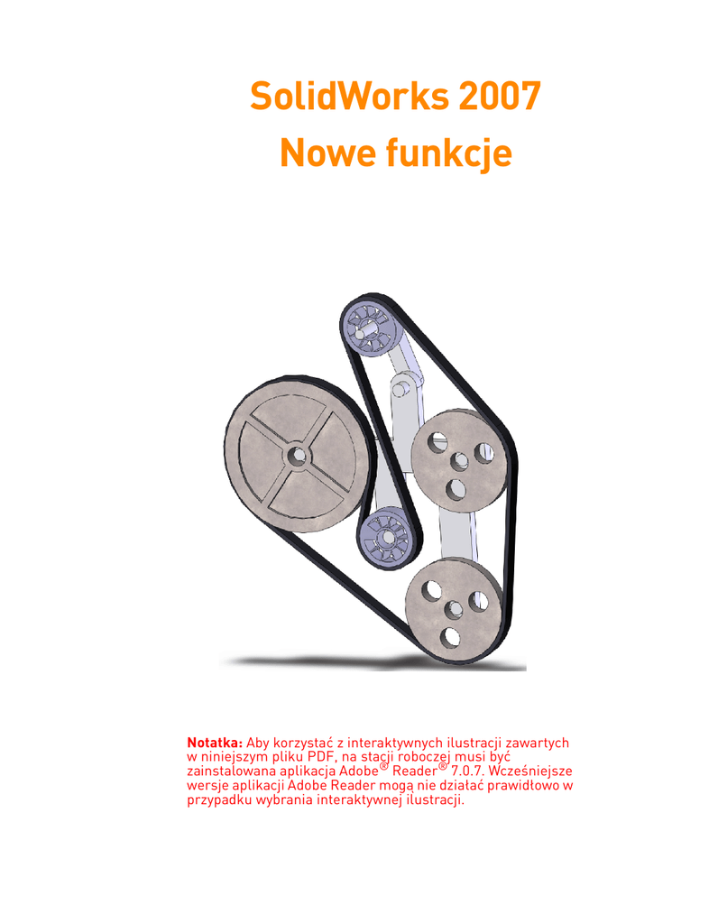SolidWorks 2007 Nowe funkcje Notatka: Aby korzystać z interaktywnych ilustracji zawartych w niniejszym pliku PDF, na stacji roboczej musi być zainstalowana aplikacja Adobe® Reader® 7.0.7. Wcześniejsze wersje aplikacji Adobe Reader mogą nie działać prawidłowo w przypadku wybrania interaktywnej ilustracji. © 1995-2006, Dassault Systemes SolidWorks Corporation jest firmą należącą do Dassault Systemes S.A. (Nasdaq:DASTY). 300 Baker Avenue Concord, Massachusetts 01742 USA Wszelkie prawa zastrzeżone Patenty USA 5,815,154; 6,219,049; 6,219,055; 6,603,486; 6,611,725; 6,844,877; 6,898,560; 6,906,712 oraz pewne inne zagraniczne patenty, w tym EP 1,116,190 i JP 3,517,643. Zgłoszono wnioski o ochronę patentową w USA i za granicą. Informacje i oprogramowanie omawiane w niniejszym dokumencie mogą ulec zmianie bez powiadomienia i nie powinny być uznawane za zobowiązania ze strony SolidWorks Corporation. Żadne materiały nie mogą być powielane lub przekazywane w jakiejkolwiek formie lub jakąkolwiek metodą, elektroniczną, czy mechaniczną, w żadnym celu, bez wyraźnej pisemnej zgody SolidWorks Corporation. Oprogramowanie, o którym mowa w niniejszym dokumencie, jest dostarczane na podstawie licencji i może być używane i kopiowane tylko zgodnie z postanowieniami tejże licencji. Wszelkie gwarancje udzielane przez SolidWorks Corporation dotyczące oprogramowania i dokumentacji zostały zawarte w Umowie licencyjnej oraz na usługę subskrypcji SolidWorks Corporation. Żadne wyrażone ani dorozumiane stwierdzenia w niniejszym dokumencie lub jego treści nie będą uznawane ani interpretowane jako modyfikacje lub zmiany wspomnianych gwarancji. SolidWorks, PDMWorks, 3D PartStream.NET, 3D ContentCentral, eDrawings, a także logo eDrawings są zastrzeżonymi znakami towarowymi firmy SolidWorks Corporation, natomiast FeatureManager jest zastrzeżonym znakiem towarowym, którego współwłaścicielem jest SolidWorks Corporation. SolidWorks 2007 jest nazwą produktu SolidWorks Corporation. COSMOSXpress, DWGeditor, DWGgateway, Feature Palette, PhotoWorks oraz XchangeWorks są znakami towarowymi SolidWorks Corporation. COSMOS i COSMOSWorks są zastrzeżonymi znakami towarowymi, natomiast COSMOSMotion i COSMOSFloWorks są znakami towarowymi Structural Research & Analysis Corporation. FeatureWorks jest zastrzeżonym znakiem towarowym Geometric Software Solutions Co. Limited. ACIS jest zastrzeżonym znakiem towarowym Spatial Corporation. GLOBEtrotter oraz FLEXlm są zastrzeżonymi znakami towarowymi Globetrotter Software, Inc. Pozostałe marki i nazwy produktów są znakami towarowymi lub zastrzeżonymi znakami towarowymi ich odpowiednich właścicieli. Numer dokumentu: PMX0215-PLK KOMERCYJNE OPROGRAMOWANIE KOMPUTEROWE - ZASTRZEŻONE Ograniczone prawa Rządu Stanów Zjednoczonych. Użycie, powielanie lub ujawnianie oprogramowania przez Rząd Stanów Zjednoczonych podlega odpowiednim ograniczeniom, zawartym w FAR 52.227-19 (Commercial Computer Software - Restricted Rights), DFARS 227.7202 (Commercial Computer Software and Commercial Computer Software Documentation) oraz w umowie licencyjnej. Dostawca/Producent: SolidWorks Corporation, 300 Baker Avenue, Concord, Massachusetts 01742 USA Części tego oprogramowania - © 1999, 2002-2006 ComponentOne Części tego oprogramowania - © 1990-2006 D-Cubed Limited. Części tego oprogramowania są rozprowadzane na podstawie licencji udzielonej przez DC Micro Development, Copyright © 1994-2006 DC Micro Development, Inc. Wszelkie prawa zastrzeżone. Części tego oprogramowania - © 1998-2006 Geometric Software Solutions Co. Limited. Części tego oprogramowania - © 1997-2002 Macromedia, Inc. Części tego oprogramowania - © 1986-2006 mental images GmbH & Co. KG Części tego oprogramowania - © 1996-2006 Microsoft Corporation. Wszelkie prawa zastrzeżone. MoldflowXpress - © 2005 Moldflow Corporation. MoldflowXpress jest chronione patentem USA nr 6,096,088 i patentem australijskim nr 721978. Części tego oprogramowania PCGLSS 4.0 - © 1992-2006, Computational Applications and System Integration, Inc. Części tego oprogramowania - © 2006 Priware Limited Części tego oprogramowania - © 2001, SIMULOG. Części tego oprogramowania - © 1995-2004 Spatial Corporation. Części tego oprogramowania - © 1997-2006 Structural Research & Analysis Corp. Części tego oprogramowania - © 1997-2006 Tech Soft America. Części tego oprogramowania są opatrzone prawami autorskimi i są własnością firmy UGS Corp. © 2006. Części tego oprogramowania - © 1999-2004 Viewpoint Corporation. Części tego oprogramowania - © 1994-2006, Visual Kinematics, Inc. Copyright 1984-2005 - Adobe Systems Incorporated i jej licencjodawcy. Wszelkie prawa zastrzeżone. Ochrona patentami USA nr 5,929,866; 5,943,063; 6,289,364; 6,563,502; 6,639,593; 6,754,382. Patenty zgłoszone. Adobe, logo Adobe, Acrobat, logo Adobe PDF, Distiller oraz Reader są zastrzeżonymi znakami towarowymi lub znakami towarowym firmy Adobe Systems Incorporated w Stanach Zjednoczonych i/lub innych krajach. Dodatkowe informacje dotyczące dóbr intelektualnych Adobe PDF Library znajdują się w menu Pomoc, Informacje. Oprogramowanie jest częściowo oparte na pracy grupy Independent JPEG. Inne części SolidWorks 2007 są licencjonowane przez licencjodawców firmy SolidWorks. Wszelkie prawa zastrzeżone Oprogramowanie PDMWorks Enterprise © 1998-2006 SolidWorks Nordic AB. Wszelkie prawa zastrzeżone. Outside In® Viewer Technology © 1992-2006 Stellent Chicago, Inc. Spis treści Wprowadzenie Informacje o niniejszym podręczniku . . . . . . . . . . . . . . . . . . . . . . . . . . . . . . . . . xi Przejście do SolidWorks 2007 . . . . . . . . . . . . . . . . . . . . . . . . . . . . . . . . . . . . . . .xiii Rozdział 1 Podstawy SolidWorks Dodaj do biblioteki . . . . . . . . . . . . . . . . . . . . . . . . . . . . . . . . . . . . . . . . . . . . . . . 1-2 Autoodzyskiwanie, Kopia zapasowa oraz Notyfikacj