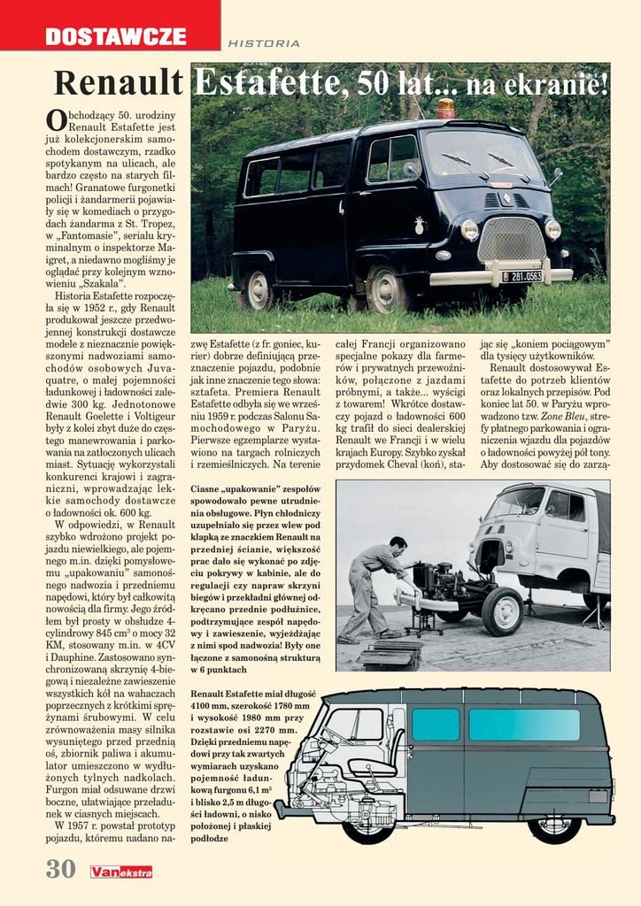 DOST AWCZE DOSTA HISTORIA Renault Estafette, 50 lat... na ekranie! O bchodzący 50. urodziny Renault Estafette jest już kolekcjonerskim samochodem dostawczym, rzadko spotykanym na ulicach, ale bardzo często na starych filmach! Granatowe furgonetki policji i żandarmerii pojawiały się w komediach o przygodach żandarma z St. Tropez, w „Fantomasie”, serialu kryminalnym o inspektorze Maigret, a niedawno mogliśmy je oglądać przy kolejnym wznowieniu „Szakala”. Historia Estafette rozpoczęła się w 1952 r., gdy Renault produkował jeszcze przedwojennej konstrukcji dostawcze modele z nieznacznie powiększonymi nadwoziami samochodów osobowych Juvaquatre, o małej pojemności ładunkowej i ładowności zaledwie 300 kg. Jednotonowe Renault Goelette i Voltigeur były z kolei zbyt duże do częstego manewrowania i parkowania na zatłoczonych ulicach miast. Sytuację wykorzystali konkurenci krajowi i zagraniczni, wprowadzając lekkie samochody dostawcze o ładowności ok. 600 kg. W odpowiedzi, w Renault szybko wdrożono projekt pojazdu niewielkiego, ale pojemnego m.in. dzięki pomysłowemu „upakowaniu” samonośnego nadwozia i przedniemu napędowi, który był całkowitą nowością dla firmy. Jego źródłem był prosty w obsłudze 4cylindrowy 845 cm3 o mocy 32 KM, stosowany m.in. w 4CV i Dauphine. Zastosowano synchronizowaną skrzynię 4-biegową i niezależne zawieszenie wszystkich kół na wahaczach poprzecznych z krótkimi sprężynami śrubowymi. W celu zrównoważenia masy silnika wysuniętego przed przednią oś, zbiornik paliwa i akumulator umieszczono w wydłużonych tylnych nadkolach. Furgon miał odsuwane drzwi boczne, ułatwiające przeładunek w ciasnych miejscach. W 1957 r. powstał prototyp pojazdu, któremu nadano na- 30 zwę Estafette (z fr. goniec, kurier) dobrze definiującą przeznaczenie pojazdu, podobnie jak inne znaczenie tego słowa: sztafeta. Premiera Renault Estafette odbyła się we wrześniu 1959 r. podczas Salonu Samochodowego w Paryżu. Pierwsze egzemplarze wystawiono na targach rolniczych i rzemieślniczych. Na terenie Ciasne „upakowanie” zespołów spowodowało pewne utrudnienia obsługowe. Płyn chłodniczy uzupełniało się przez wlew pod klapką ze znaczkiem Renault na przedniej ścianie, większość prac dało się wykonać po zdjęciu pokrywy w kabinie, ale do regulacji czy napraw skrzyni biegów i przekładni głównej odkręcano przednie podłużnice, podtrzymujące zespół napędowy i zawieszenie, wyjeżdżając z nimi spod nadwozia! Były one łączone z samonośną strukturą w 6 punktach Renault Estafette miał długość 4100 mm, szerokość 1780 mm i wysokość 1980 mm przy rozstawie osi 2270 mm. Dzięki przedniemu napędowi przy tak zwartych wymiarach uzyskano pojemność ładunkową furgonu 6,1 m3 i blisko 2,5 m długości ładowni, o nisko położonej i płaskiej podłodze całej Francji organizowano specjalne pokazy dla farmerów i prywatnych przewoźników, połączone z jazdami próbnymi, a także... wyścigi z towarem! Wkrótce dostawczy pojazd o ładowności 600 kg trafił do sieci dealerskiej Renault we Francji i w wielu krajach Europy. Szybko zyskał przydomek Cheval (koń), sta- jąc się „koniem pociągowym” dla tysięcy użytkowników. Renault dostosowywał Estafette do potrzeb klientów oraz lokalnych przepisów. Pod koniec lat 50. w Paryżu wprowadzono tzw. Zone Bleu, strefy płatnego parkowania i ograniczenia wjazdu dla pojazdów o ładowności powyżej pół tony. Aby dostosować się do zarzą- HISTORIA Wprowadzona w 1965 r. wersja o wydłużonym rozstawie osi 2650 mm z wysokim dachem ze zbrojonego tworzywa poliestrowego, klejonego do rynienek. W tamtych czasach tak duży element tworzywy wykonywano w częściach (trzech przy dłuższym nadwoziu), nitowanych ze sobą przed montażem w samochodzie DOST AWCZE DOSTA Drzwi kierowcy mogły być odsuwane lub otwierane za zawiasach (pasażera tylko zawiasowe). Duża przednia szyba i boczne odsuwane w drzwiach zapewniały dobrą widoczność W czerwcu 1980 r. z taśmy montażowej zjechał ostatni z 533 209 egzemplarzy Renault Estafette. Jego następcą był Trafic Renault Estafette jest jednym z mniej znanych samochodów dostawczych w Polsce, ale we Francji i okolicznych krajach europejskich cieszy się popularnością m.in. ze względu na „zasługi” w upowszechnianiu karawaningu. Dlatego jubileusz tego modelu spotkał się z dużym odzewem i jest upamiętniany licznymi zlotami miłośników Charakterystyczny dla francuskich samochodów dostawczych podział tylnych drzwi ładowni na 3 części wiązano z przywyczajeniami wiejskich klientów dzeń władz miasta, przygotowano specjalną wersję o ładowności 500 kg. Poza podstawowym furgonem, oferowano także 9-osobowy mikrobus Alouette, furgon lub mikrobus z podwyższonym dachem, samochód ze skrzynią ładunkową oraz wersję pod zabudowę specjalistyczną. Renault Estafette używano w policji, żandarmerii, armii francuskiej, straży pożarnej, a także w służbach medycznych jako ambulans (ze wzmocnionym zawieszeniem). Estafette znakomicie sprawdzał się w roli samochodu dostawczego zarówno w miastach, jak i na wsi. Wraz z modą na samochodową turystykę liczne egzemplarze przebudowano na pojazdy kempingowe. W 1962 r. wprowadzono zmodernizowaną Estafette z silnikiem 1108 cm3 o mocy 45 KM, znanym z R8. Ładowność wzrosła do 800 kg. Trzy lata później pojawiła się wersja z przedłużonym o 380 mm rozstawem osi i ładowności 1000 kg. W 1968 r. wprowadzono trzecią serię Estafette z silnikiem 1289 cm3 o mocy 54 KM. Prędkość maksymalna wzrosła do 98 km/h. Cały czas mowa o silnikach benzynowych. W kolejnych latach modyfikowano nadwozie, wprowadzając masywne zderzaki z odbojami, zmieniono kształt osłony wlotu powietrza, kierunkowskazy i tablicę rozdzielczą. Wzrastało bezpieczeństwo kierowcy i pasażerów, które poddano testom zderzeniowym w ośrodku badawczym Renault. Było to związane z 