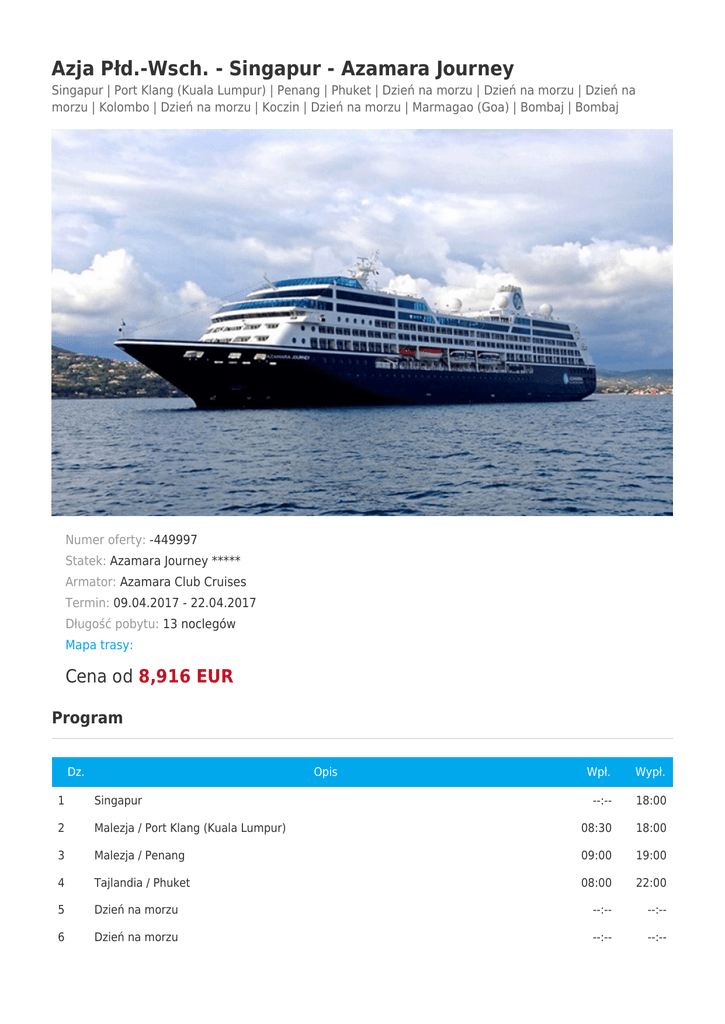 Azja Płd.-Wsch. - Singapur - Azamara Journey Singapur | Port Klang (Kuala Lumpur) | Penang | Phuket | Dzień na morzu | Dzień na morzu | Dzień na morzu | Kolombo | Dzień na morzu | Koczin | Dzień na morzu | Marmagao (Goa) | Bombaj | Bombaj Numer oferty: -449997 Statek: Azamara Journey ***** Armator: Azamara Club Cruises Termin: 09.04.2017 - 22.04.2017 Długość pobytu: 13 noclegów Mapa trasy: Cena od 8,916 EUR Program Dz. Opis Wpł. Wypł. --:-- 18:00 1 Singapur 2 Malezja / Port Klang (Kuala Lumpur) 08:30 18:00 3 Malezja / Penang 09:00 19:00 4 Tajlandia / Phuket 08:00 22:00 5 Dzień na morzu --:-- --:-- 6 Dzień na morzu --:-- --:-- 7 Dzień na morzu --:-- --:-- 8 Sri Lanka / Kolombo 06:00 23:00 9 Dzień na morzu --:-- --:-- 10 Indie / Koczin 08:00 22:00 11 Dzień na morzu --:-- --:-- 12 Indie / Marmagao (Goa) 07:30 22:00 13 Indie / Bombaj 17:00 --:-- 14 Indie / Bombaj --:-- --:-- Cennik Nazwa bilet lotniczy Opis Cena katalogowa Cena promocyjna 8,916 ÷ 8,916 EUR --; --; --; SPRAWDŹ CENĘ Zobacz pozostałe terminy Nie ma innych terminów. Informacje dodatkowe Cena obejmuje: ● rejs statkiem; ● zakwaterowanie w kabinie wybranej kategorii; ● serwis bagażowy i kabinowy; ● pełne wyżywienie; ● opcję all inclusive: napoje alkoholowe (wódka, piwo i wina) i bezalkoholowe (butelkowana woda, kawa i herbata); ● bezpłatny wstęp na AzAmazing EveningsSM (z wyjątkiem rejsów transatlantyckich, mini rejsów i rejsów czarterowych); ● napiwki; ● całodobowa opieka lokaja dla kabin typu suite; ● pralnia samoobsługowa; ● transfery z i do portu; ● 24h room services; ● pełne zakwaterowanie; ● rozrywka na pokładzie; ● zajęcia rekreacyjne i sportowe (za niektóre zajęcia sportowe może być pobierana dodatkowa opłata np. indywidualne zajęcia z instruktorem); ● siłownia na pokładzie, sauna i sauna parowa. Cena nie obejmuje: ● opłat portowych i rządowych; ● ewentualnych noclegów w hotelu przed/po rejsie; ● wycieczek fakultatywnych; ● korzystania z punktów usługowych (fotograf, salon piękności i odnowy biologicznej, internet); ● ubezpieczenia KL i NW.