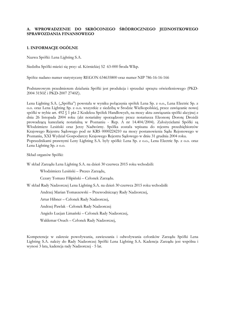 A. WPROWADZENIE DO SKRÓCONEGO ŚRÓDROCZNEGO JEDNOSTKOWEGO SPRAWOZDANIA FINANSOWEGO 1. INFORMACJE OGÓLNE Nazwa Spółki: Lena Lighting S.A. Siedziba Spółki mieści się przy: ul. Kórnickiej 52 63-000 Środa Wlkp. Spółce nadano numer statystyczny REGON 634635800 oraz numer NIP 786-16-16-166 Podstawowym przedmiotem działania Spółki jest produkcja i sprzedaż sprzętu oświetleniowego (PKD2004 3150Z i PKD-2007 2740Z). Lena Lighting S.A. („Spółka”) powstała w wyniku połączenia spółek Lena Sp. z o.o., Lena Electric Sp. z o.o. oraz Lena Lighting Sp. z o.o. wszystkie z siedzibą w Środzie Wielkopolskiej, przez zawiązanie nowej spółki w trybie art. 492 § 1 pkt 2 Kodeksu Spółek Handlowych, na mocy aktu zawiązania spółki akcyjnej z dnia 26 listopada 2004 roku (akt notarialny sporządzony przez notariusza Eleonorę Dorotę Drożdż prowadzącą kancelarię notarialną w Poznaniu - Rep. A nr 14.404/2004). Założycielami Spółki są Włodzimierz Lesiński oraz Jerzy Nadwórny. Spółka została wpisana do rejestru przedsiębiorców Krajowego Rejestru Sądowego pod nr KRS 0000224210 na mocy postanowienia Sądu Rejonowego w Poznaniu, XXI Wydział Gospodarczy Krajowego Rejestru Sądowego w dniu 31 grudnia 2004 roku. Poprzednikami prawnymi Leny Lighting S.A. były spółki: Lena Sp. z o.o., Lena Electric Sp. z o.o. oraz Lena Lighting Sp. z o.o. Skład organów Spółki: W skład Zarządu Lena Lighting S.A. na dzień 30 czerwca 2015 roku wchodzili: Włodzimierz Lesiński – Prezes Zarządu, Cezary Tomasz Filipiński – Członek Zarządu. W skład Rady Nadzorczej Lena Lighting S.A. na dzień 30 czerwca 2015 roku wchodzili: Andrzej Marian Tomaszewski – Przewodniczący Rady Nadzorczej, Artur Hibner – Członek Rady Nadzorczej, Andrzej Pawlak - Członek Rady Nadzorczej Angielo Lucjan Limański – Członek Rady Nadzorczej, Waldemar Osuch – Członek Rady Nadzorczej, Kompetencje w zakresie powoływania, zawieszania i odwoływania członków Zarządu Spółki Lena Lighting S.A. należy do Rady Nadzorczej Spółki Lena Lighting S.A. Kadencja Zarządu jest wspólna i wynosi 3 lata, kadencja rady Nadzorczej - 5 lat. Informacja dodatkowa za I półrocze 2015r. Lena Lighting S.A. 2. INFORMACJE O PODSTAWIE SPORZĄDZENIA JEDNOSTKOWEGO SPRAWOZDANIA FINANSOWEGO. SKRÓCONEGO ŚRÓDROCZNEGO Skrócone śródroczne jednostkowe sprawozdanie finansowe Spółki Lena Lighting S.A. zostało sporządzone zgodnie z Międzynarodowymi Standardami Sprawozdawczości Finansowej. Skrócone śródroczne jednostkowe sprawozdanie finansowe nie obejmuje wszystkich informacji oraz ujawnień wymaganych w rocznym sprawozdaniu finansowym, dlatego należy je czytać łącznie z ostatnim rocznym sprawozdaniem finansowym za 2014r Walutą sprawozdawczą niniejszego skróconego śródrocznego sprawozdania finansowego jest złoty polski, a wszystkie kwoty wyrażone są w złotych polskich. Przy prezentacji kwot w sprawozdaniu zastosowano zaokrąglenia do tysiąca złotych. Sprawozdanie zostało sporządzone przy założeniu kontynuacji działalności oraz braku okoliczności wskazujących na zagrożenie kontynuacji działalności. Zarząd Spółki nie stwierdza na dzień podpisania śródrocznego skróconego jednostkowego sprawozdania finansowego istnienia faktów i okoliczności, które wskazywałyby na zagrożenia dla możliwości kontynuacji działalności przez Spółkę w okresie 12 miesięcy po dniu bilansowym na skutek zamierzonego lub przymusowego zaniechania bądź istotnego ograniczenia przez nią dotychczasowej działalności. Czas trwania Spółki jest nieograniczony. Struktura Grupy Kapitałowej Lena Lighting S.A. Grupa Kapitałowa Lena Lighting składa się z podmiotu dominującego Lena Lighting S.A. z podmiotu zależnego Luxmat Investment Sp. z o.o. oraz z podmiotu zależnego Lena Lighting GmbH. W dniu 27 marca 2015r. zostały sprzedane wszystkie udziały w podmiocie Luxmat Sp. z o. o. Dane jednostek powiązanych kapitałowo z Emitentem: Nazwa jednostki Siedziba Przedmiot działalności Organ rejestrowy Luxmat Investment Sp. z o.o. Ul. Kórnicka 52, 63-000 Środa Wlkp. Sprzedaż opraw oświetleniowych Sąd Rejonowy w Poznaniu Wydział Gospodarczy Krajowego Rejestru Sądowego w Rejestrze Przedsiębiorców pod numerem KRS 553903 Charakter dominacji Zależna Metoda konsolidacji ze wzgl. na istotność nie podlegała konsolidacji. (na podstawie art. 58 ustawy z dnia 29 września 1994 r. o rachunkowości) Procent posiadanego kapitału zakładowego 100,00% Procentowy udział w ogólnej liczbie głosów na walnym zgromadzeniu 100,00% Nazwa jednostki Siedziba Lena Lighting GmbH Zeppelinstr. 1, 12529 Schönefeld Niemcy Przedmiot działalności Sprzedaż opraw oświetleniowych oraz usługi w zakresie projektowania oświetlenia Organ rejestrowy Sąd w Cottbus, nr w rejestrze HRB 11889 CB Charakter dominacji Zależna Metoda konsolidacji Brak konsolidacji ze względu na nieistotność danych spółki zależnej Procent posiadanego kapitału zakładowego 100,00% Procentowy udział w ogólnej liczbie głosów na walnym zgromadzeniu 100,00% Spółka. kierując się nadrzędną zasadą Międzynarodowych Standardów Rachunkowości tj. istotności, nie sporządzała skonsolidowanego sprawozdania finansowego Grupy jako jednostka dominująca. 2 Informacja dodatkowa za I półrocze 2015r. Lena Lighting S.A. 3. OKRES OBJĘTY ŚRÓDROCZNYM SKRÓCONYM JEDNOSTKOWYM SPRAWOZDANIEM FINANSOWYM Zarząd zaprezentował w skróconym śródrocznym jednostkowym sprawozdaniu finansowym dane finansowe w sposób następujący: Skrócone śródroczne jednostkowe sprawozdanie z sytuacji finansowej na dzień 30 czerwca 2015 roku, skrócone śródroczne jednostkowe sprawozdanie z całkowitych dochodów, skrócone śródroczne jednostkowe sprawozdanie z przepływów pieniężnych, skrócone śródroczne sprawozdanie ze zmian w kapitale własnym za okres 6 miesięcy zakończony 30 czerwca 2015 roku, dane porównawcze za rok 2014 stanowiące: 
