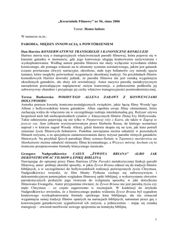 „Kwartalnik Filmowy” nr 56, zima 2006 Temat: Homo ludens W numerze m.in.: PARODIA. MIĘDZY INNOWACJĄ A POWTÓRZENIEM Dan Harries KONSERWATYWNE TRANSGRESJE I KANONICZNE KONKLUZJE Harries stawia tezę o transgresyjnych właściwościach parodii filmowej, która pojawia się w kanonie gatunku w momencie, gdy jego konwencje ulegają krańcowemu usztywnieniu i wyeksploatowaniu. Według autora parodia filmowa nie służy wyłącznie wywołaniu efektu komicznego, ale pomaga wskazać na te elementy systemu normatywnego, jakim jest gatunek (często powtarzane chwyty narracyjne; określone, stałe typy bohaterów czy metody ujęcia tematu), które mogłyby potwierdzać wygaśnięcie określonej tradycji. Na przykładach filmów komediowych Harries dowodzi jednak, że parodia filmowa nie jest oznaką wygaśnięcia określonych gatunków, ale służy ich rewitalizacji. Autor nazywa parodię metakrytycznym narzędziem pozwalającym napiętnować zużyte konwencje, a jednocześnie podkreśla jej subwersywny charakter i przypisuje jej cechy właściwe transgresyjności postmodernistycznej. Teresa Rutkowska WOODY’EGO ALLENA ZABAWY Z KONWENCJAMI HOLLYWOODU Autorka porusza kwestię ironiczno-nostalgicznych związków, jakie łączą filmy Woody’ego Allena z hollywoodzkim kinem gatunków. Allen zapełnia swoje filmy elementami, które zachęcają widza do włączenia się w szczególnego rodzaju intertekstualną grę. Reżyser używa bezpośred nich lub niebezpośrednich cytatów z klasycznych filmów Złotej Ery Hollywoodu. Takie odniesienia pojawiają się nie tylko w Purpurowej róży z Kairu, ale także w Zagraj to jeszcze raz, Sam (obrazie wyreżyserowanym przez Herberta Rossa, do którego scenariusz napisał i w którym zagrał Woody Allen), gdzie historia skupia się na tym, jak kino potrafi zmieniać życie filmowych bohaterów. Podobne nawiązania można odnaleźć w pozostałych filmach reżysera, a ze specjalnym zainteresowaniem darzy reżyser parodie różnych gatunków filmowych. Na przykład Śpioch parodiuje filmy science-fiction; w Tajemnicy morderstwa na Manhattanie można odnaleźć elementy filmu kryminalnego, a Wszyscy mówią: kocham cię to ironiczne przepracowanie formuły klasycznego musicalu. Grzegorz Nadgrodkiewicz CASUS „ŻYWOTA BRIANA” ALBO JAK DEKONSTRUOWAĆ FILMOWĄ EPIKĘ BIBLIJNĄ Nawiązując do opisanej przez Dana Harriesa (Film Parody) metakrytycznej funkcji parodii filmowej, autor próbuje określić sposoby, w jakie Żywot Briana odnosi się do tradycji filmów biblijnych, a w szczególności do hollywoodzkich realizacji poświęconych życiu Chrystusa. Nadgrodkiewicz twierdzi, że film Monty Pythona cechuje się subwersywnym i dekonstrukcyjnym potencjałem względem filmowej epiki biblijnej, a wykorzystanie chwytów parodystycznych posłużyło jego twórcom do wykpienia sposobu, w jaki dotychczas filmowano Ewangelie. Autor przypomina również, że Żywot Briana nie jest parodią życia czy męki Chrystusa – co często sugerowano w recenzjach. W konkluzji do artykułu Nadgrodkiewicz stwierdza, że z historycznego punktu widzenia Żywot Briana był sygnałem krańcowego wyeksploatowania formuły epickiego kina biblijnego, ale nie oznaczał wygaśnięcia samej tradycji filmów opartych na narracjach biblijnych, natomiast przez grę z konwencjami gatunkowymi sygnalizował ich zużycie, a jednocześnie – stając się oznaką transgresji – otwierał możliwość nowego spojrzenia na tematykę biblijną. 1 Beata Kosińska-Krippner PARODYSTYCZNA NATURA PRZYWŁASZCZEŃ KODÓW FAKTUALNYCH I KONWENCJI W MOCK-DOKUMENTACH Kosińska-Krippner, wykorzystując teorię mock-documentary Roscoe i Highta, analizuje kilka wybranych fikcjonalnych tekstów filmowych (mock-documentary) pod kątem zapożyczenia przez nie w celach parodystycznych faktualnych kodów i konwencji. Autorka tropi zawarte w filmach sygnały reżyserskie, wskazujące na prawdziwy status tych tekstów oraz wydobywa elementy gry prowadzonej przez ich twórców z widzami. Analizie poddane zostały filmy: Operation Lune/Dark Side of the Moon Williama Karela, Perviye na Lune/First on the Moon Aleksieja Fedorczenki, Rok diabła Petra Zelenki oraz Cesky sen Vita Klusaka i Filipa Remundy. Autorka wspomina też dwa przykłady wykorzystania technik mockdokumentalnych w polskich produkcjach. STRATEGIE ROZŚMIESZANIA. WSPÓŁCZYNNIK CZASU I PRZESTRZENI Marek Hendrykowski FARMAZON. STUDIUM Z GENOLOGII POLSKIEGO KINA POPULARNEGO Hendrykowski odsłania przed nami nierozpoznany, choć silnie obecny zarówno w polskiej, jak i w światowej tradycji filmowej, gatunek – farmazon (zaznaczając przy tym, że termin farmazon odnosić się może również do charakterystycznej postaci ekranowej). Jego robocza definicja zakłada, że jest to gatunek filmu sensacyjno-przygodowego przez sposób opowiadania eksponujący za pośrednictwem wartkiej akcji niecodzienne sytuacje i barwne zdarzenia z życia bohaterów. Świat przedstawiony farmazonu łączy w sobie element fabularnego zmyślenia z powszechnie znanymi i odczuwanymi jako swojskie, realiami danego miejsca i czasu, które mają służyć jego uwiarygodnieniu. W repertuarze charakterystycznych wyróżników gatunkowych farmazonu bardzo istotną rolę odgrywa również tonacja buffo, a wraz nią przymrużenie oka, ściśle związane z umownością nieprawdopodobnych zdarzeń i udziałem konwencji komediowej. Hendrykowski zarysowuje historię farmazonu skupiając się przede wszystkim na jego polskich przykładach. Wyczerpująco opisuje też farmazona-postać, bohatera tak mocno zakorzenionego w rodzimej tradycji filmowej. Agnieszka Taborska „WYBORNY TRUP” I INNE ZABAWY Spośród wszystkich ruchów awangardowych surrealizm najradykalniej krytykował racjonalizm. Akademickie metody badania świata zastępując grami i prowokacją, wierzył w skuteczność czystej zabawy, wywołującej zaskoczenie i wzywającej do zrzucenia masek. Zapożyczając techniki dziecięcych 