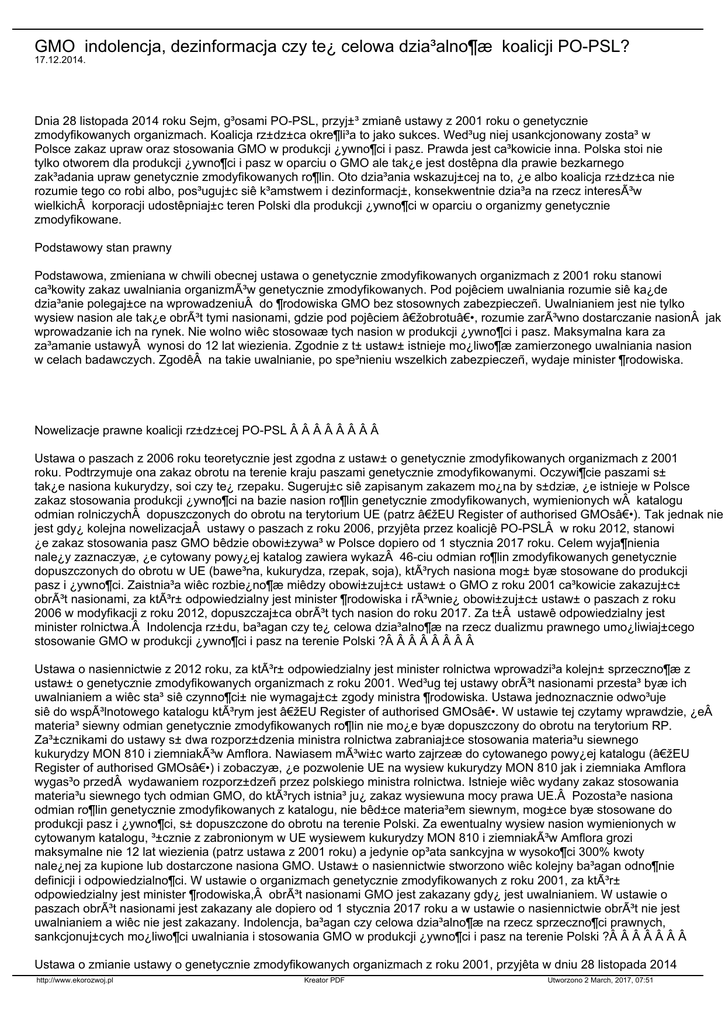 GMO indolencja, dezinformacja czy te¿ celowa dzia³alno¶æ koalicji PO-PSL? 17.12.2014. Dnia 28 listopada 2014 roku Sejm, g³osami PO-PSL, przyj±³ zmianê ustawy z 2001 roku o genetycznie zmodyfikowanych organizmach. Koalicja rz±dz±ca okre¶li³a to jako sukces. Wed³ug niej usankcjonowany zosta³ w Polsce zakaz upraw oraz stosowania GMO w produkcji ¿ywno¶ci i pasz. Prawda jest ca³kowicie inna. Polska stoi nie tylko otworem dla produkcji ¿ywno¶ci i pasz w oparciu o GMO ale tak¿e jest dostêpna dla prawie bezkarnego zak³adania upraw genetycznie zmodyfikowanych ro¶lin. Oto dzia³ania wskazuj±cej na to, ¿e albo koalicja rz±dz±ca nie rozumie tego co robi albo, pos³uguj±c siê k³amstwem i dezinformacj±, konsekwentnie dzia³a na rzecz interesów wielkich korporacji udostêpniaj±c teren Polski dla produkcji ¿ywno¶ci w oparciu o organizmy genetycznie zmodyfikowane. Podstawowy stan prawny Podstawowa, zmieniana w chwili obecnej ustawa o genetycznie zmodyfikowanych organizmach z 2001 roku stanowi ca³kowity zakaz uwalniania organizmów genetycznie zmodyfikowanych. Pod pojêciem uwalniania rozumie siê ka¿de dzia³anie polegaj±ce na wprowadzeniu do ¶rodowiska GMO bez stosownych zabezpieczeñ. Uwalnianiem jest nie tylko wysiew nasion ale tak¿e obrót tymi nasionami, gdzie pod pojêciem „obrotu―, rozumie zarówno dostarczanie nasion jak wprowadzanie ich na rynek. Nie wolno wiêc stosowaæ tych nasion w produkcji ¿ywno¶ci i pasz. Maksymalna kara za za³amanie ustawy wynosi do 12 lat wiezienia. Zgodnie z t± ustaw± istnieje mo¿liwo¶æ zamierzonego uwalniania nasion w celach badawczych. Zgodê na takie uwalnianie, po spe³nieniu wszelkich zabezpieczeñ, wydaje minister ¶rodowiska. Nowelizacje prawne koalicji rz±dz±cej PO-PSL         Ustawa o paszach z 2006 roku teoretycznie jest zgodna z ustaw± o genetycznie zmodyfikowanych organizmach z 2001 roku. Podtrzymuje ona zakaz obrotu na terenie kraju paszami genetycznie zmodyfikowanymi. Oczywi¶cie paszami s± tak¿e nasiona kukurydzy, soi czy te¿ rzepaku. Sugeruj±c siê zapisanym zakazem mo¿na by s±dziæ, ¿e istnieje w Polsce zakaz stosowania produkcji ¿ywno¶ci na bazie nasion ro¶lin genetycznie zmodyfikowanych, wymienionych w katalogu odmian rolniczych dopuszczonych do obrotu na terytorium UE (patrz „EU Register of authorised GMOs―). Tak jednak nie jest gdy¿ kolejna nowelizacja ustawy o paszach z roku 2006, przyjêta przez koalicjê PO-PSL w roku 2012, stanowi ¿e zakaz stosowania pasz GMO bêdzie obowi±zywa³ w Polsce dopiero od 1 stycznia 2017 roku. Celem wyja¶nienia nale¿y zaznaczyæ, ¿e cytowany powy¿ej katalog zawiera wykaz 46-ciu odmian ro¶lin zmodyfikowanych genetycznie dopuszczonych do obrotu w UE (bawe³na, kukurydza, rzepak, soja), których nasiona mog± byæ stosowane do produkcji pasz i ¿ywno¶ci. Zaistnia³a wiêc rozbie¿no¶æ miêdzy obowi±zuj±c± ustaw± o GMO z roku 2001 ca³kowicie zakazuj±c± obrót nasionami, za któr± odpowiedzialny jest minister ¶rodowiska i równie¿ obowi±zuj±c± ustaw± o paszach z roku 2006 w modyfikacji z roku 2012, dopuszczaj±ca obrót tych nasion do roku 2017. Za t±Â ustawê odpowiedzialny jest minister rolnictwa. Indolencja rz±du, ba³agan czy te¿ celowa dzia³alno¶æ na rzecz dualizmu prawnego umo¿liwiaj±cego stosowanie GMO w produkcji ¿ywno¶ci i pasz na terenie Polski ?        Ustawa o nasiennictwie z 2012 roku, za któr± odpowiedzialny jest minister rolnictwa wprowadzi³a kolejn± sprzeczno¶æ z ustaw± o genetycznie zmodyfikowanych organizmach z roku 2001. Wed³ug tej ustawy obrót nasionami przesta³ byæ ich uwalnianiem a wiêc sta³ siê czynno¶ci± nie wymagaj±c± zgody ministra ¶rodowiska. Ustawa jednoznacznie odwo³uje siê do wspólnotowego katalogu którym jest „EU Register of authorised GMOs―. W ustawie tej czytamy wprawdzie, ¿e materia³ siewny odmian genetycznie zmodyfikowanych ro¶lin nie mo¿e byæ dopuszczony do obrotu na terytorium RP. Za³±cznikami do ustawy s± dwa rozporz±dzenia ministra rolnictwa zabraniaj±ce stosowania materia³u siewnego kukurydzy MON 810 i ziemniaków Amflora. Nawiasem mówi±c warto zajrzeæ do cytowanego powy¿ej katalogu („EU Register of authorised GMOs―) i zobaczyæ, ¿e pozwolenie UE na wysiew kukurydzy MON 810 jak i ziemniaka Amflora wygas³o przed wydawaniem rozporz±dzeñ przez polskiego ministra rolnictwa. Istnieje wiêc wydany zakaz stosowania materia³u siewnego tych odmian GMO, do których istnia³ ju¿ zakaz wysiewuna mocy prawa UE. Pozosta³e nasiona odmian ro¶lin genetycznie zmodyfikowanych z katalogu, nie bêd±ce materia³em siewnym, mog±ce byæ stosowane do produkcji pasz i ¿ywno¶ci, s± dopuszczone do obrotu na terenie Polski. Za ewentualny wysiew nasion wymienionych w cytowanym katalogu, ³±cznie z zabronionym w UE wysiewem kukurydzy MON 810 i ziemniaków Amflora grozi maksymalne nie 12 lat wiezienia (patrz ustawa z 2001 roku) a jedynie op³ata sankcyjna w wysoko¶ci 300% kwoty nale¿nej za kupione lub dostarczone nasiona GMO. Ustaw± o nasiennictwie stworzono wiêc kolejny ba³agan odno¶nie definicji i odpowiedzialno¶ci. W ustawie o organizmach genetycznie zmodyfikowanych z roku 2001, za któr± odpowiedzialny jest minister ¶rodowiska, obrót nasionami GMO jest zakazany gdy¿ jest uwalnianiem. W ustawie o paszach obrót nasionami jest zakazany ale dopiero od 1 stycznia 2017 roku a w ustawie o nasiennictwie obrót nie jest uwalnianiem a wiêc nie jest zakazany. Indolencja, ba³agan czy celowa dzia³alno¶æ na rzecz sprzeczno¶ci prawnych, sankcjonuj±cych mo¿liwo¶ci uwalniania i stosowania GMO w produkcji ¿ywno¶ci i pasz na terenie Polski ?       Ustawa o zmianie ustawy o genetycznie zmodyfikowanych organizmach z roku 2001, przyjêta w dniu 28 listopada 2014 http://www.ekorozwoj.pl Kreator PDF Utworzono 2 March, 2017, 07:51 roku przez Sejm g³osami PO-PSL to konsekwencja poprzedniej dzia³alno¶ci rz±du. 
