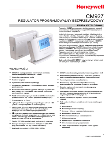 CM927 REGULATOR PROGRAMOWALNY BEZPRZEWODOWY KARTA KATALOGOWA Regulator CM927 przeznaczony jest do czasowej regulacji temperatury w systemach grzewczych i klimatyzacyjnych w domach i małych budynkach. Może być stosowany jako część instalacji składającej się z kotłów Kombi, palników olejowych, kotłów gazowych, pomp cyrkulacyjnych, siłowników termicznych, zaworów strefowych i elektrycznych instalacji grzewczych (<10A). Razem z innym regulatorem CM927 i modułem przekaźnikowym HC60NG może obsługiwać instalacje wielostrefowe (do 4 stref). Regulator bezprzewodowy CM927 składa się z termostatu pomieszczeniowego CMT927A i modułu przekaźnikowego R6660D (HC60NG). Moduł przekaźnikowy połączony jest kablem z elementem sterującym (np. palnikiem kotła). Regulator powinien być zamontowany w miejscu odpowiednim zarówno dla pomiaru temperatury jak i pozbawionym zakłóceń radiowych. Sygnał radiowy regulatora nadawany jest w pasmie 868MHz. Duży wyświetlacz LCD CM927 z dynamicznym tekstem jest taki sam jak w przewodowym CM907. WŁAŚCIWOŚCI • • • • • • • • • • • • • • CM927 nie wymaga połączeń elektrycznych pomiędzy termostatem pomieszczeniowym a kotłem. Atrakcyjny, nowoczesny wyglą. • • Dynamiczny tekst ułatwiający obsługę • • Podświetlany wyświetlacz LCD ułatwiający odczyt w jasnym pomieszczeniu. • Niezawodna komunikacja sygnałem radiowym w pasmie 868 MHz trwająca 1 % całkowitego cyklu pracy w celu ograniczenia zakłóceń sygnału . • Każdy termostat pokojowy może sterować kilkoma modułami przekaźnikowymi (np. kilkoma grzejnikami elektrycznym)i. • Programowanie “w fotelu”. • 7-dniowy program. Przycisk okresowej zmiany temperatury (w zakresie 1-23 godzin) – następnie powrót do normalnej pracy. Przycisk Off – dnia świątecznego kopiujący program niedzieli na dni następne (do 99 dni) lub resztę dnia bieżącego bez konieczności przeprogramowania. Przycisk programu wakacyjnego umożliwia oszczędność energii przez obniżenie temperatury na 1 – 99 dni np. na czas urlopu – umożliwiając powrót do normalnego działania w trybie AUTO lub RĘCZNY w dniu powrotu. Pamięć EEPROM umożliwia stałe podtrzymanie programu. Zabezpieczenie przeciwmrozowe działające w trybie WYŁ przy poziomie min. 5°C (wg nastawy instalatora). Mozliwość komunikacji z HR80, HM80 i HCE80. CM927 może sterować systemami wielostrefowymi do 4 stref Maksymalna wydajność instalacji i wydłużona żywotność kotła z powodu unikalnego systemu synchronizacji stref. Automatyczna zmiana czasu lato / zima. Standardowy regulator i moduł przekaźnikowy są wykorzystywane w algorytmie sterowania strefowego. Dowolne usytuowanie termostatu pokojowego przy zastosowaniu stojaka Sterowanie z domowymi urządzeniami zasilanymi napięciem 24...230V oraz ze stykami przekaźnika SPDT z obciążeniem rezystancyjnym 10A i indukcyjnym 3A. Montaż naścienny lub w puszce modułu przekaźnika HC60NG Tryb nastaw Instalatora umożliwia ustawienie dodatkowych funkcji: • • • • • • • • • Optymalizacji Kontrolnego załączenia pompy Górnego / dolnego ograniczenia temperatury Przesunięcia temperatury Określenie minimalnego czasu załączenia Wyboru cyklu pracy Wyboru trybu: Ogrzewanie / Chłodzenie Określenia zakresu proporcjonalności Trybu bezpieczeństwa w przypadku zaniku sygnału radiowego 1 CM927-k-pl01rMW0507 REGULATOR CM927 PANEL REGULATORA Rozkład przycisków: 1. 2. 3. 4. 5. 6. 7. 8. 9. 10. 11. 12. 13. 14. 15. 16. 17. 18. 19. Dzień & Data Czas Dynamiczny wyświetlacz tekstu (DTD) Wskaźnik ZAŁ. kotła Wskaźnik WYŁ. baterii Wyświetlacz temperatury Przycisk zmiany temperatury Przycisk informacji Przełącznik trybu pracy Przycisk Zielony OK Przyciski programowania Pokrywa baterii Przedział baterii Przycisk “Wakacje” Przycisk “Przyjęcie” Przycisk WYŁ Przycisk “Kopia Dnia” Przycisk “Wybór Dnia” Przyciski zmiany czasu DANE TECHNICZNE ELEKTRYCZNE Zasilanie termostatu Żywotność Wymiana baterii Zasilanie modułu Typ zestyku Wartości znamionowe Przewody zasilające (tylko dla modułu) Podłączenie przewodu : 2 x 1.5 V IEC LR6 (AA) baterie alkaliczne : : : : : Minimum 2 lata Program pamiętany w EEPROM 230V AC +10% - 15%, 50Hz SPDT bezpotencjałowy 24-230 V AC, 10 A rezystancyjne, 3 A indukcyjne 0.6 p.f. 2 : Przewody o przekroju maks. 2.5 mm : Od tyłu (montaż w puszce), z prawej lub dolnej strony SYGNAŁ RF Zakres RF Zasięg RF Technologia nadawania sygnału RF Odporność na blokowanie Metoda przydziału sygnału RF : ISM (868.0-868.6) MHz, 1% cyklu pracy : 30 m w budynku : Transmisja krótkotrwała, dobrej jakości sygnał odporny na zakłócenia : 2 klasa odbioru (ETSI EN300 220-1 wersja 1.3.1) : Fabryczna nastawa sygnału umożliwia sterowanie modułami w 4 strefach. PRZECHOWYWANIE I WYKONANIE Temperatura pracy : : : Temperatura składowania i transportu Wilgotność : Klasa IP : MeetingWykonanie : 0 do 40oC przy obciążeniu < 8 A o 0 do 30 C przy obciążeniu > 8 A -20 do 55oC 10 do 90% rh 30 EN60730-1(2000), EN55014-1(1997), EN55014-2(2000), ETSI EN300 220-3 (2000), ETSI EN301 489-3(2000) 2 EN0H 8556 UK07 R1 10/06 REGULACJA TEMPERATURY Typ czujnika : 100K (@ 25 oC ) NTC termistor Typ regulacji : Algorytm Fuzzy Logic Minimalny czas 10% cyklu pracy (min 1 minuta), ZAŁ nastawialny do 2 do 5 min Cykl pracy/godz. : Zależny od aplikacji (Tryb Nastaw Instalatora) + o Dokładność : 0.5 K (nominalnie) @ 20 C, przy 50% obciążeniu 3K ∆/hour temperatury Tryb pracy przy : WYŁ lub cykliczny wybierany w Nastawie zaniku sygnału CM927 PROGRAMOWANIE Odczyt czasu Dokładność zegara Program Rozdzielczość czasu Zakres nastaw temperatury Zakres odczytu temperatury pomieszczenia : 24 lub 12 godzinny : do 10 minut / rok : 7-dniowy - 6 zmian / dobę : Czas bieżący - 1 minuta Program – co 10 minut o o : Program : 5 do 35 C co 0.5 C o Przeciwmrozowe: 5 C lub wybrana dolna nastawa (5 oC 