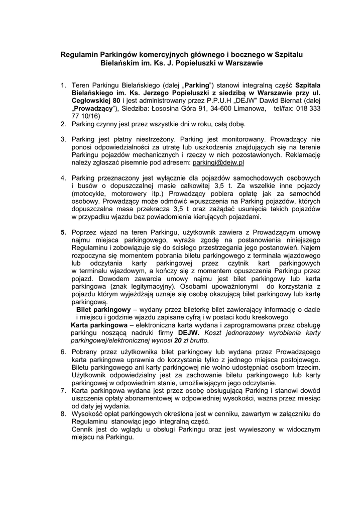 Regulamin Parkingów komercyjnych głównego i bocznego w Szpitalu Bielańskim im. Ks. J. Popiełuszki w Warszawie 1. Teren Parkingu Bielańskiego (dalej „Parking”) stanowi integralną część Szpitala Bielańskiego im. Ks. Jerzego Popiełuszki z siedzibą w Warszawie przy ul. Cegłowskiej 80 i jest administrowany przez P.P.U.H „DEJW” Dawid Biernat (dalej „Prowadzący”), Siedziba: Łososina Góra 91, 34-600 Limanowa, tel/fax: 018 333 77 10/16) 2. Parking czynny jest przez wszystkie dni w roku, całą dobę. 3. Parking jest płatny niestrzeżony. Parking jest monitorowany. Prowadzący nie ponosi odpowiedzialności za utratę lub uszkodzenia znajdujących się na terenie Parkingu pojazdów mechanicznych i rzeczy w nich pozostawionych. Reklamację należy zgłaszać pisemnie pod adresem: [email protected] 4. Parking przeznaczony jest wyłącznie dla pojazdów samochodowych osobowych i busów o dopuszczalnej masie całkowitej 3,5 t. Za wszelkie inne pojazdy (motocykle, motorowery itp.) Prowadzący pobiera opłatę jak za samochód osobowy. Prowadzący może odmówić wpuszczenia na Parking pojazdów, których dopuszczalna masa przekracza 3,5 t oraz zażądać usunięcia takich pojazdów w przypadku wjazdu bez powiadomienia kierujących pojazdami. 5. Poprzez wjazd na teren Parkingu, użytkownik zawiera z Prowadzącym umowę najmu miejsca parkingowego, wyraża zgodę na postanowienia niniejszego Regulaminu i zobowiązuje się do ścisłego przestrzegania jego postanowień. Najem rozpoczyna się momentem pobrania biletu parkingowego z terminala wjazdowego lub odczytania karty parkingowej przez czytnik kart parkingowych w terminalu wjazdowym, a kończy się z momentem opuszczenia Parkingu przez pojazd. Dowodem zawarcia umowy najmu jest bilet parkingowy lub karta parkingowa (znak legitymacyjny). Osobami upoważnionymi do korzystania z pojazdu którym wyjeżdżają uznaje się osobę okazującą bilet parkingowy lub kartę parkingową. Bilet parkingowy – wydany przez bileterkę bilet zawierający informację o dacie i miejscu i godzinie wjazdu zapisane cyfrą i w postaci kodu kreskowego Karta parkingowa – elektroniczna karta wydana i zaprogramowana przez obsługę parkingu noszącą nadruki firmy DEJW. Koszt jednorazowy wyrobienia karty parkingowej/elektronicznej wynosi 20 zł brutto. 6. Pobrany przez użytkownika bilet parkingowy lub wydana przez Prowadzącego karta parkingowa uprawnia do korzystania tylko z jednego miejsca postojowego. Biletu parkingowego ani karty parkingowej nie wolno udostępniać osobom trzecim. Użytkownik odpowiedzialny jest za zachowanie biletu parkingowego lub karty parkingowej w odpowiednim stanie, umożliwiającym jego odczytanie. 7. Karta parkingowa wydana jest przez osobę obsługującą Parking i stanowi dowód uiszczenia opłaty abonamentowej w odpowiedniej wysokości, ważna przez miesiąc od daty jej wydania. 8. Wysokość opłat parkingowych określona jest w cenniku, zawartym w załączniku do Regulaminu stanowiąc jego integralną część. Cennik jest do wglądu u obsługi Parkingu oraz jest wywieszony w widocznym miejscu na Parkingu. 9. Użytkownik pojazdu, który przekroczył czas parkowania, do jakiego uprawnia go rodzaj wykupionego abonamentu zobowiązany jest wnieść dodatkową opłatę według cennika opłat abonamentowych. 10. W przypadku zgubienia lub zniszczenia biletu postojowego lub karty parkingowej albo ich uszkodzenia w takim zakresie, że nie jest możliwe ich odczytanie, pojazd może wyjechać z Parkingu tylko po okazaniu przez kierującego obsłudze Parkingu dowodu rejestracyjnego pojazdu i dowodu tożsamości potwierdzających, że kierujący jest osobą uprawnioną oraz po dokonaniu opłaty parkingowej zgodnie z cennikiem opłat parkingowych. W przypadku odmowy wylegitymowania się przez osobę odbierającą pojazd bez biletu parkingowego lub karty parkingowej, obsługa Parkingu ma obowiązek zawiadomić ochronę parkingu oraz Policję. 11. Terminal wyjazdowy drukuje bilet parkingowy na podstawie, którego można wjechać na Parking. Jeżeli wyjazd z parkingu następuje danego dnia przed godziną 6,00 rano i brak jest obsługi parkingu wystarczy, aby kierujący uiścił opłatę w automatycznej kasie parkingowej, podjechał pod szlaban wyjazdowy, włożył bilet do terminalu wyjazdowego w oznaczone miejsce (jeżeli bilet jest opłacony to szlaban zostanie podniesiony). 12. W czasie parkowania kierujący pojazdem zobowiązany jest uważać na pojazdy sąsiednie i ustawiać pojazd w wyznaczonych miejscach. 13. Na terenie Parkingu obowiązują zasady ruchu drogowego przewidziane w ustawie – Prawo o ruchu drogowym. Kierujący pojazdem korzystający z Parkingu zobowiązany jest w szczególności do przestrzegania: a. Znaków drogowych pionowych i poziomych b. Poleceń obsługi Parkingu oraz innych osób posiadających uprawnienie w tym zakresie, w tym Policji i Straży Miejskiej. 14. Zakazane jest parkowanie pojazdu: a. Na przejściach dla pieszych („zebrach”) b. Na drogach dojazdowych i p.poż c. Innych drogach odpowiednio oznakowanych znakiem zakazu d. Na miejscach wydzielonych i oznakowanych, za wyjątkiem pojazdów do tego upoważnionych 15. Obowiązuje bezwzględny zakaz wjazdu na teren Parkingu pojazdów przewożących materiały łatwopalne, żrące, wybuchowe i inne materiały zaklasyfikowane jako niebezpiecznie, o ile nie są zabezpieczone zgodnie z obowiązującymi przepisami. 16. Na terenie Parkingu wolno jechać z prędkością do 10 km/h. 17. Na terenie Parkingu zakazane jest: a. Palenie oraz używanie otwartego ognia b. Magazynowanie paliw, substancji łatwopalnych i pustych pojemników po paliwie c. Tankowanie, w tym z kanistrów d. Pozostawienie pojazdu z pracującym silnikiem bez koniecznej i potrzeby e. Parkowanie pojazdów z nieszczelnym wlewem lub zbiornikiem paliwa f. Naprawianie, mycie, odkurzanie pojazdów, wymiana płynu chłodzącego lub olejów. 18. Wjeżdżając na parking należy obowiązkowo: 