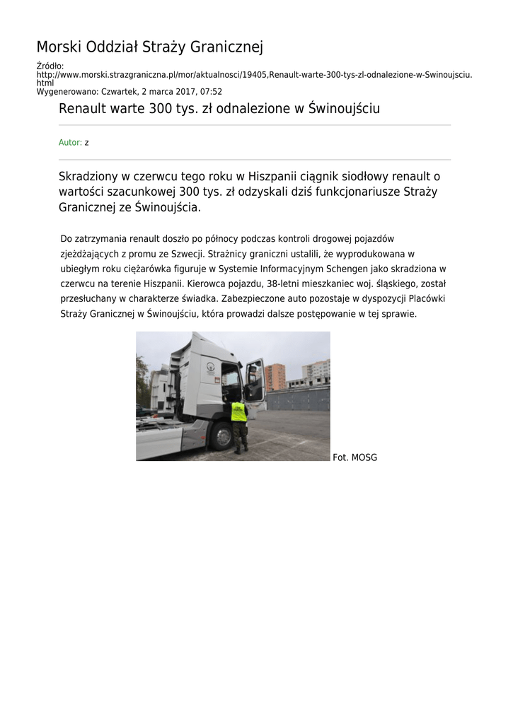 Morski Oddział Straży Granicznej Źródło: http://www.morski.strazgraniczna.pl/mor/aktualnosci/19405,Renault-warte-300-tys-zl-odnalezione-w-Swinoujsciu. html Wygenerowano: Czwartek, 2 marca 2017, 07:52 Renault warte 300 tys. zł odnalezione w Świnoujściu Autor: z Skradziony w czerwcu tego roku w Hiszpanii ciągnik siodłowy renault o wartości szacunkowej 300 tys. zł odzyskali dziś funkcjonariusze Straży Granicznej ze Świnoujścia. Do zatrzymania renault doszło po północy podczas kontroli drogowej pojazdów zjeżdżających z promu ze Szwecji. Strażnicy graniczni ustalili, że wyprodukowana w ubiegłym roku ciężarówka figuruje w Systemie Informacyjnym Schengen jako skradziona w czerwcu na terenie Hiszpanii. Kierowca pojazdu, 38-letni mieszkaniec woj. śląskiego, został przesłuchany w charakterze świadka. Zabezpieczone auto pozostaje w dyspozycji Placówki Straży Granicznej w Świnoujściu, która prowadzi dalsze postępowanie w tej sprawie. Fot. MOSG