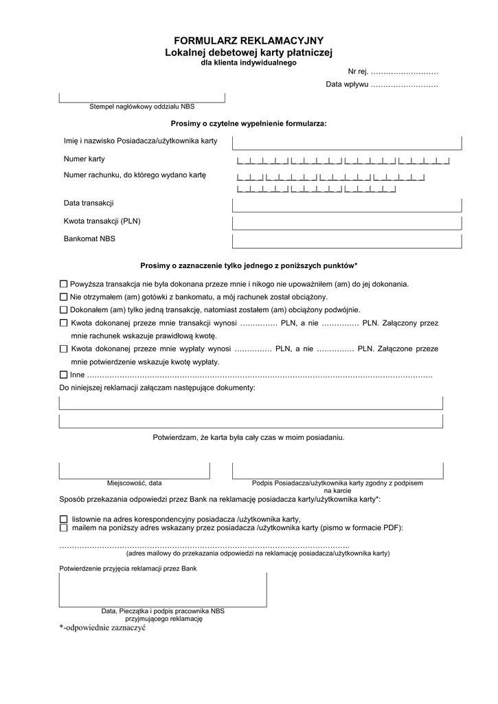 FORMULARZ REKLAMACYJNY Lokalnej debetowej karty płatniczej dla klienta indywidualnego Nr rej. ……………………… Data wpływu ……………………… Stempel nagłówkowy oddziału NBS Prosimy o czytelne wypełnienie formularza: Imię i nazwisko Posiadacza/użytkownika karty Numer karty |_ _|_ _|_ _|_ _| |_ _|_ _|_ _|_ _| |_ _|_ _|_ _|_ _| |_ _|_ _|_ _|_ _| Numer rachunku, do którego wydano kartę |_ _|_ _| |_ _|_ _|_ _|_ _| |_ _|_ _|_ _|_ _| |_ _|_ _|_ _|_ _| |_ _|_ _|_ _|_ _| |_ _|_ _|_ _|_ _| |_ _|_ _|_ _|_ _| Data transakcji Kwota transakcji (PLN) Bankomat NBS Prosimy o zaznaczenie tylko jednego z poniższych punktów* Powyższa transakcja nie była dokonana przeze mnie i nikogo nie upoważniłem (am) do jej dokonania. Nie otrzymałem (am) gotówki z bankomatu, a mój rachunek został obciążony. Dokonałem (am) tylko jedną transakcję, natomiast zostałem (am) obciążony podwójnie. Kwota dokonanej przeze mnie transakcji wynosi …………… PLN, a nie …………… PLN. Załączony przez mnie rachunek wskazuje prawidłową kwotę. Kwota dokonanej przeze mnie wypłaty wynosi …………… PLN, a nie …………… PLN. Załączone przeze mnie potwierdzenie wskazuje kwotę wypłaty. Inne ………………………………………………………………………………………………………………………… Do niniejszej reklamacji załączam następujące dokumenty: Potwierdzam, że karta była cały czas w moim posiadaniu. Miejscowość, data Podpis Posiadacza/użytkownika karty zgodny z podpisem na karcie Sposób przekazania odpowiedzi przez Bank na reklamację posiadacza karty/użytkownika karty*: listownie na adres korespondencyjny posiadacza /użytkownika karty, mailem na poniższy adres wskazany przez posiadacza /użytkownika karty (pismo w formacie PDF): …………………………………………………………………………………………………….. (adres mailowy do przekazania odpowiedzi na reklamację posiadacza/użytkownika karty) Potwierdzenie przyjęcia reklamacji przez Bank Data, Pieczątka i podpis pracownika NBS przyjmującego reklamację *-odpowiednie zaznaczyć