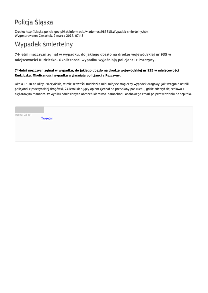 Policja Śląska Źródło: http://slaska.policja.gov.pl/kat/informacje/wiadomosci/85815,Wypadek-smiertelny.html Wygenerowano: Czwartek, 2 marca 2017, 07:43 Wypadek śmiertelny 74-letni mężczyzn zginął w wypadku, do jakiego doszło na drodze wojewódzkiej nr 935 w miejscowości Rudziczka. Okoliczności wypadku wyjaśniają policjanci z Pszczyny. 74-letni mężczyzn zginął w wypadku, do jakiego doszło na drodze wojewódzkiej nr 935 w miejscowości Rudziczka. Okoliczności wypadku wyjaśniają policjanci z Pszczyny. Około 15.30 na ulicy Pszczyńskiej w miejscowości Rudziczka miał miejsce tragiczny wypadek drogowy. Jak wstępnie ustalili policjanci z pszczyńskiej drogówki, 74-letni kierujący oplem zjechał na przeciwny pas ruchu, gdzie zderzył się czołowo z ciężarowym mannem. W wyniku odniesionych obrażeń kierowca samochodu osobowego zmarł po przewiezieniu do szpitala. Ocena: 0/5 (0) Tweetnij