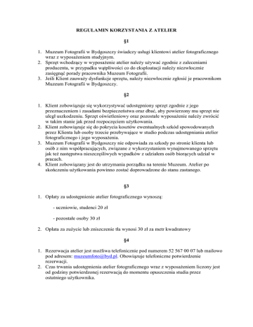REGULAMIN KORZYSTANIA Z ATELIER §1 1. Muzeum Fotografii w Bydgoszczy świadczy usługi klientowi atelier fotograficznego wraz z wyposażeniem studyjnym. 2. Sprzęt wchodzący w wyposażenie atelier należy używać zgodnie z zaleceniami producenta, w przypadku wątpliwości co do eksploatacji należy niezwłocznie zasięgnąć porady pracownika Muzeum Fotografii. 3. Jeśli Klient zauważy dysfunkcje sprzętu, należy niezwłocznie zgłosić je pracownikom Muzeum Fotografii w Bydgoszczy. §2 1. Klient zobowiązuje się wykorzystywać udostępniony sprzęt zgodnie z jego przeznaczeniem i zasadami bezpieczeństwa oraz dbać, aby powierzony mu sprzęt nie uległ uszkodzeniu. Sprzęt oświetleniowy oraz pozostałe wyposażenie należy zwrócić w takim stanie jak przed rozpoczęciem użytkowania. 2. Klient zobowiązuje się do pokrycia kosztów ewentualnych szkód spowodowanych przez Klienta lub osoby trzecie przebywające w studio podczas udostępniania atelier fotograficznego i jego wyposażenia. 3. Muzeum Fotografii w Bydgoszczy nie odpowiada za szkody po stronie klienta lub osób z nim współpracujących, związane z wykorzystaniem wynajmowanego sprzętu jak też następstwa nieszczęśliwych wypadków z udziałem osób biorących udział w pracach. 4. Klient zobowiązany jest do utrzymania porządku na terenie Muzeum. Atelier po skończeniu użytkowania powinno zostać doprowadzone do stanu zastanego. §3 1. Opłaty za udostępnienie atelier fotograficznego wynoszą: - uczniowie, studenci 20 zł - pozostałe osoby 30 zł 2. Opłata za zużycie lub zniszczenie tła wynosi 30 zł za metr kwadratowy §4 1. Rezerwacja atelier jest możliwa telefonicznie pod numerem 52 567 00 07 lub mailowo pod adresem: [email protected]. Obowiązuje telefoniczne potwierdzenie rezerwacji. 2. Czas trwania udostępnienia atelier fotograficznego wraz z wyposażeniem liczony jest od godziny potwierdzonej rezerwacją do momentu opuszczenia studia przez ostatniego użytkownika. §5 1. Klient jest zobowiązany do poinformowania pracowników Muzeum Fotografii o charakterze zdjęć jakie planuje wykonać podczas korzystania z atelier fotograficznego (zwłaszcza gdy chodzi o akty lub nagość zakrytą). Podczas korzystania z atelier Muzeum jest otwarte dla zwiedzających. 2. Wykorzystanie atelier do celów niezgodnych z prawem jest zabronione. 3. Muzeum Fotografii w Bydgoszczy zastrzega sobie możliwość przerwania udostępnienia atelier w przypadku, gdy prowadzone z jego wykorzystaniem działania związane byłyby z treściami uznanymi za zakazane w obliczu polskiego prawa. 4. Wszystkie osoby przebywające w studiu w ramach jego udostępniania powinny być pełnoletnie lub posiadać stosowną zgodę opiekuna prawnego. 5. W studiu obowiązuje bezwzględny zakaz palenia oraz spożywania alkoholu. §7 1. Muzeum Fotografii w Bydgoszczy zastrzega sobie możliwość zmiany niniejszego regulaminu.
