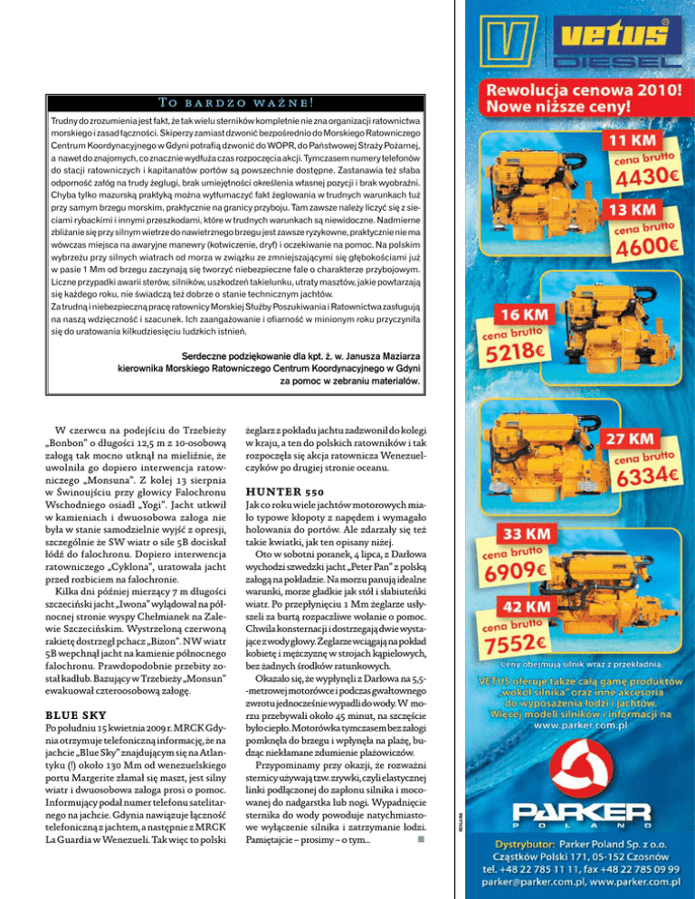 To b a r d z o wa ż n e ! Trudny do zrozumienia jest fakt, że tak wielu sterników kompletnie nie zna organizacji ratownictwa morskiego i zasad łączności. Skiperzy zamiast dzwonić bezpośrednio do Morskiego Ratowniczego Centrum Koordynacyjnego w Gdyni potrafią dzwonić do WOPR, do Państwowej Straży Pożarnej, a nawet do znajomych, co znacznie wydłuża czas rozpoczęcia akcji. Tymczasem numery telefonów do stacji ratowniczych i kapitanatów portów są powszechnie dostępne. Zastanawia też słaba odporność załóg na trudy żeglugi, brak umiejętności określenia własnej pozycji i brak wyobraźni. Chyba tylko mazurską praktyką można wytłumaczyć fakt żeglowania w trudnych warunkach tuż przy samym brzegu morskim, praktycznie na granicy przyboju. Tam zawsze należy liczyć się z sieciami rybackimi i innymi przeszkodami, które w trudnych warunkach są niewidoczne. Nadmierne zbliżanie się przy silnym wietrze do nawietrznego brzegu jest zawsze ryzykowne, praktycznie nie ma wówczas miejsca na awaryjne manewry (kotwiczenie, dryf) i oczekiwanie na pomoc. Na polskim wybrzeżu przy silnych wiatrach od morza w związku ze zmniejszającymi się głębokościami już w pasie 1 Mm od brzegu zaczynają się tworzyć niebezpieczne fale o charakterze przybojowym. Liczne przypadki awarii sterów, silników, uszkodzeń takielunku, utraty masztów, jakie powtarzają się każdego roku, nie świadczą też dobrze o stanie technicznym jachtów. Za trudną i niebezpieczną pracę ratownicy Morskiej Służby Poszukiwania i Ratownictwa zasługują na naszą wdzięczność i szacunek. Ich zaangażowanie i ofiarność w minionym roku przyczyniła się do uratowania kilkudziesięciu ludzkich istnień. Serdeczne podziękowanie dla kpt. ż. w. Janusza Maziarza kierownika Morskiego Ratowniczego Centrum Koordynacyjnego w Gdyni za pomoc w zebraniu materiałów. BLUE SKY Po południu 15 kwietnia 2009 r. MRCK Gdynia otrzymuje telefoniczną informację, że na jachcie „Blue Sky” znajdującym się na Atlantyku (!) około 130 Mm od wenezuelskiego portu Margerite złamał się maszt, jest silny wiatr i dwuosobowa załoga prosi o pomoc. Informujący podał numer telefonu satelitarnego na jachcie. Gdynia nawiązuje łączność telefoniczną z jachtem, a następnie z MRCK La Guardia w Wenezueli. Tak więc to polski żeglarz z pokładu jachtu zadzwonił do kolegi w kraju, a ten do polskich ratowników i tak rozpoczęła się akcja ratownicza Wenezuelczyków po drugiej stronie oceanu. HUNTER 550 Jak co roku wiele jachtów motorowych miało typowe kłopoty z napędem i wymagało holowania do portów. Ale zdarzały się też takie kwiatki, jak ten opisany niżej. Oto w sobotni poranek, 4 lipca, z Darłowa wychodzi szwedzki jacht „Peter Pan” z polską załogą na pokładzie. Na morzu panują idealne warunki, morze gładkie jak stół i słabiuteńki wiatr. Po przepłynięciu 1 Mm żeglarze usłyszeli za burtą rozpaczliwe wołanie o pomoc. Chwila konsternacji i dostrzegają dwie wystające z wody głowy. Żeglarze wciągają na pokład kobietę i mężczyznę w strojach kąpielowych, bez żadnych środków ratunkowych. Okazało się, że wypłynęli z Darłowa na 5,5-metrowej motorówce i podczas gwałtownego zwrotu jednocześnie wypadli do wody. W morzu przebywali około 45 minut, na szczęście było ciepło. Motorówka tymczasem bez załogi pomknęła do brzegu i wpłynęła na plażę, budząc niekłamane zdumienie plażowiczów. Przypominamy przy okazji, że rozważni sternicy używają tzw. zrywki, czyli elastycznej linki podłączonej do zapłonu silnika i mocowanej do nadgarstka lub nogi. Wypadnięcie sternika do wody powoduje natychmiastowe wyłączenie silnika i zatrzymanie łodzi. Pamiętajcie – prosimy – o tym... reklama W czerwcu na podejściu do Trzebieży „Bonbon” o długości 12,5 m z 10-osobową załogą tak mocno utknął na mieliźnie, że uwolniła go dopiero interwencja ratowniczego „Monsuna”. Z kolej 13 sierpnia w Świnoujściu przy głowicy Falochronu Wschodniego osiadł „Yogi”. Jacht utkwił w kamieniach i dwuosobowa załoga nie była w stanie samodzielnie wyjść z opresji, szczególnie że SW wiatr o sile 5B dociskał łódź do falochronu. Dopiero interwencja ratowniczego „Cyklona”, uratowała jacht przed rozbiciem na falochronie. Kilka dni później mierzący 7 m długości szczeciński jacht „Iwona” wylądował na północnej stronie wyspy Chełmianek na Zalewie Szczecińskim. Wystrzeloną czerwoną rakietę dostrzegł pchacz „Bizon”. NW wiatr 5B wepchnął jacht na kamienie północnego falochronu. Prawdopodobnie przebity został kadłub. Bazujący w Trzebieży „Monsun” ewakuował czteroosobową załogę. 69