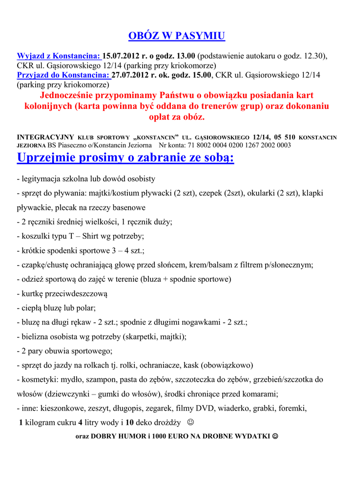 OBÓZ W PASYMIU Wyjazd z Konstancina: 15.07.2012 r. o godz. 13.00 (podstawienie autokaru o godz. 12.30), CKR ul. Gąsiorowskiego 12/14 (parking przy kriokomorze) Przyjazd do Konstancina: 27.07.2012 r. ok. godz. 15.00, CKR ul. Gąsiorowskiego 12/14 (parking przy kriokomorze) Jednocześnie przypominamy Państwu o obowiązku posiadania kart kolonijnych (karta powinna być oddana do trenerów grup) oraz dokonaniu opłat za obóz. INTEGRACYJNY KLUB SPORTOWY „KONSTANCIN” UL. GĄSIOROWSKIEGO 12/14, 05 510 JEZIORNA BS Piaseczno o/Konstancin Jeziorna Nr konta: 71 8002 0004 0200 1267 2002 0003 KONSTANCIN Uprzejmie prosimy o zabranie ze sobą: - legitymacja szkolna lub dowód osobisty - sprzęt do pływania: majtki/kostium pływacki (2 szt), czepek (2szt), okularki (2 szt), klapki pływackie, plecak na rzeczy basenowe - 2 ręczniki średniej wielkości, 1 ręcznik duży; - koszulki typu T – Shirt wg potrzeby; - krótkie spodenki sportowe 3 – 4 szt.; - czapkę/chustę ochraniającą głowę przed słońcem, krem/balsam z filtrem p/słonecznym; - odzież sportową do zajęć w terenie (bluza + spodnie sportowe) - kurtkę przeciwdeszczową - ciepłą bluzę lub polar; - bluzę na długi rękaw - 2 szt.; spodnie z długimi nogawkami - 2 szt.; - bielizna osobista wg potrzeby (skarpetki, majtki); - 2 pary obuwia sportowego; - sprzęt do jazdy na rolkach tj. rolki, ochraniacze, kask (obowiązkowo) - kosmetyki: mydło, szampon, pasta do zębów, szczoteczka do zębów, grzebień/szczotka do włosów (dziewczynki – gumki do włosów), środki chroniące przed komarami; - inne: kieszonkowe, zeszyt, długopis, zegarek, filmy DVD, wiaderko, grabki, foremki, 1 kilogram cukru 4 litry wody i 10 deko drożdży oraz DOBRY HUMOR i 1000 EURO NA DROBNE WYDATKI