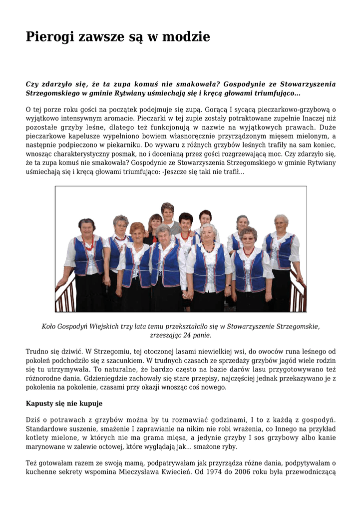 Pierogi zawsze są w modzie Czy zdarzyło się, że ta zupa komuś nie smakowała? Gospodynie ze Stowarzyszenia Strzegomskiego w gminie Rytwiany uśmiechają się i kręcą głowami triumfująco... O tej porze roku gości na początek podejmuje się zupą. Gorącą I sycącą pieczarkowo-grzybową o wyjątkowo intensywnym aromacie. Pieczarki w tej zupie zostały potraktowane zupełnie Inaczej niż pozostałe grzyby leśne, dlatego też funkcjonują w nazwie na wyjątkowych prawach. Duże pieczarkowe kapelusze wypełniono bowiem własnoręcznie przyrządzonym mięsem mielonym, a następnie podpieczono w piekarniku. Do wywaru z różnych grzybów leśnych trafiły na sam koniec, wnosząc charakterystyczny posmak, no i docenianą przez gości rozgrzewającą moc. Czy zdarzyło się, że ta zupa komuś nie smakowała? Gospodynie ze Stowarzyszenia Strzegomskiego w gminie Rytwiany uśmiechają się i kręcą głowami triumfująco: -Jeszcze się taki nie trafił... Koło Gospodyń Wiejskich trzy lata temu przekształciło się w Stowarzyszenie Strzegomskie, zrzeszając 24 panie. Trudno się dziwić. W Strzegomiu, tej otoczonej lasami niewielkiej wsi, do owoców runa leśnego od pokoleń podchodziło się z szacunkiem. W trudnych czasach ze sprzedaży grzybów jagód wiele rodzin się tu utrzymywała. To naturalne, że bardzo często na bazie darów lasu przygotowywano też różnorodne dania. Gdzieniegdzie zachowały się stare przepisy, najczęściej jednak przekazywano je z pokolenia na pokolenie, czasami przy okazji wnosząc coś nowego. Kapusty się nie kupuje Dziś o potrawach z grzybów można by tu rozmawiać godzinami, I to z każdą z gospodyń. Standardowe suszenie, smażenie I zaprawianie na nikim nie robi wrażenia, co Innego na przykład kotlety mielone, w których nie ma grama mięsa, a jedynie grzyby I sos grzybowy albo kanie marynowane w zalewie octowej, które wyglądają jak... smażone ryby. Też gotowałam razem ze swoją mamą, podpatrywałam jak przyrządza różne dania, podpytywałam o kuchenne sekrety wspomina Mieczysława Kwiecień. Od 1974 do 2006 roku była przewodniczącą Koła Gospodyń Wiejskich, które trzy lata temu przekształciło się właśnie w Stowarzyszenie Strzegomskie, zrzeszając 24 panie I łącząc pokolenia strzegomianek. Dziś prezeską stowarzyszenia jest Bogusława Lasek, córka pani Mieczysławy. Co utkwiło mi w pamięci najbardziej? Chyba naleśniki i pierogi jagodami, które przygotowywała moja mama. No i teraz sama je robię bardzo często wnuczki za nimi przepadają. Hit drobiowy, czyli kurczak faszerowany. Świętokrzyski Głos Pana Karpia A dorośli? Dorośli w Strzegomiu na pierwszym miejscu też stawiają pierogi. One zawsze są w modzie I na weselu, I na dożynkach, I na Wigilii zapewniają gospodynie, błyskawicznie podliczając, jak często przychodzi im zabierać się za lepienie. Przepisy niby są oczywiste, ale wiadomo, jak bardzo podczas przygotowania ciasta I farszu liczą się niuanse, nadające pierogom ostateczny smak. W każdym domu pierogi z grzybami, serem z rodzynkami albo pieprzem będą smakowały nieco Inaczej, tak jak I te chyba najpopularniejsze w Strzegomiu z kapustą. W ogóle nie ma mowy o kupowaniu kapusty w sklepie. Kapustę się sadzi na własnym gruncie, pielęgnuje, zbiera, szatkuje, ubija w beczce, soli, dodaje się też zioła I marchew. Jak taka kapusta skwaśnieje, wtedy można być spokojnym o jakość przyrządzonych z niej potraw. Gołąbki smakują dokładnie tak, jak w odległych wspomnieniach z dzieciństwa, a I smak bigosu pozostaje w pamięci przez długie tygodnie. Karp z pobliskich stawów Gospodynie ze Strzegomia lubią się spotykać w swoim pomieszczeniu w remizie Ochotniczej Straży Pożarnej, lubią zakładać swoje piękne kolorowe stroje podczas różnych uroczystości, lubią też razem gotować, przyrządzać potrawy na konkursy kulinarne, no I wymieniać się doświadczeniami. Danuta Nieckarz na gotowaniu zna się jak mało kto w okolicy. Od wielu lat obsługuje duże imprezy rodzinne wesela, komunie, rocznice, przez wiele też lat gotowała strzegomskim księżom. Wiadomo, że jak była jakaś uroczystość bierzmowanie, odpust albo spowiedź, to przyjeżdżali też Inni duchowni, a cała kuchnia była na mojej głowie. Emocji nie brakowało wspomina Danuta Nieckarz. Mówi się, że księża mają delikatne podniebienia, ale to nieprawda. Ksiądz biskup na przykład kiedyś zajadał się zwyczajną zupą pIeczarkową Innym razem podałam mu zupę cytrynową z łazankami. Nie mógł się nadziwić, że taką zupę się w ogóle gotuje. Mówił, że objeździł już wiele parafii, ale na cytrynową jeszcze nie trafił. Kiedyś biskup przyjechał do nas w piątek, to przygotowałam usmażoną na złoty kolor rybę mirunę Też mu bardzo smakowała I dopytywał o szczegóły. Generalnie w Strzegomiu ryby jada się często, może nie tyle morskie, co słodkowodne, w szczególności zaś karpie pochodzące z pobliskich stawów rytwiańskich. Gospodynie doceniają przede wszystkim pewność źródła pochodzenia. Wiadomo, że rytwiańskie karpie hodowane są w czystej wodzie I karmione zbożem. Mają jeszcze jedną ogromnie ważną zaletę kupione bezpośrednio u producenta, są po prostu świeże. Z takiego świeżego mięsa można przygotować prawdziwe cuda. Ja zazwyczaj najpierw karpia filetuję wtedy mam spokój z ośćmi Mieczysława Kwiecień przyznaje, że sama opanowała tę czynność I teraz chętnie pomaga innym. To proste. Wypatroszonego karpia trzymam za głowę, ostrym nożem odcinam wszystkie płetwy, a następnie jadę tym nożem po kręgosłupie I żebrach najpierw z jednej, a później z drugiej strony. A jak już mam filety, to przygotowuję karpia w potrawce (przepis zamieszczamy poniżej). Moja rodzina to danie uwielbia. Tu króluje karpatka Na strzegomskich stołach często pojawia się też karp pieczony w całości, karp nadziewany, tradycyjne smażone w panierce d