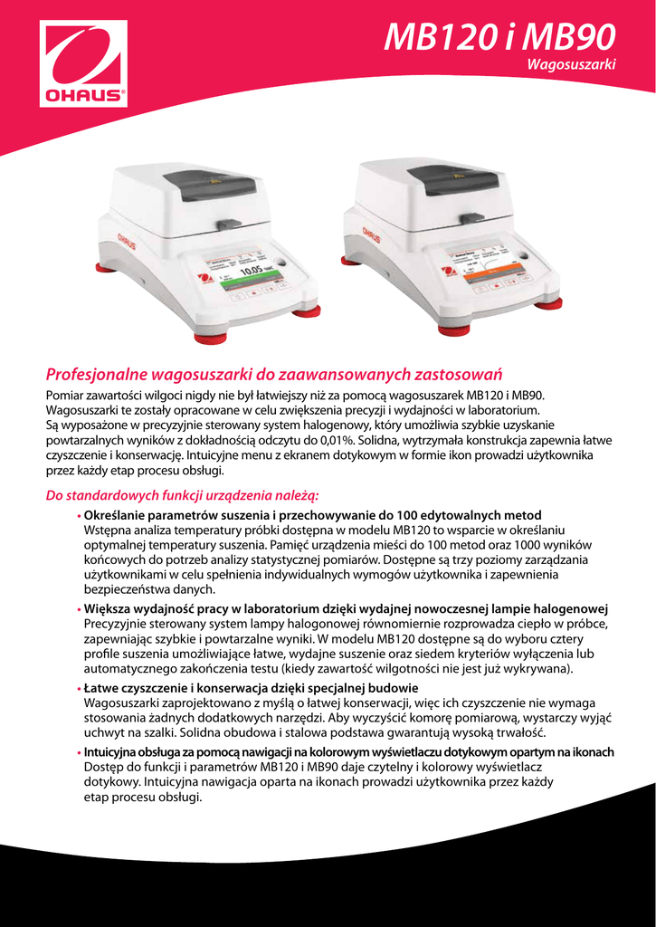 MB120 i MB90 Wagosuszarki Profesjonalne wagosuszarki do zaawansowanych zastosowań Pomiar zawartości wilgoci nigdy nie był łatwiejszy niż za pomocą wagosuszarek MB120 i MB90. Wagosuszarki te zostały opracowane w celu zwiększenia precyzji i wydajności w laboratorium. Są wyposażone w precyzyjnie sterowany system halogenowy, który umożliwia szybkie uzyskanie powtarzalnych wyników z dokładnością odczytu do 0,01%. Solidna, wytrzymała konstrukcja zapewnia łatwe czyszczenie i konserwację. Intuicyjne menu z ekranem dotykowym w formie ikon prowadzi użytkownika przez każdy etap procesu obsługi. Do standardowych funkcji urządzenia należą: • Określanie parametrów suszenia i przechowywanie do 100 edytowalnych metod Wstępna analiza temperatury próbki dostępna w modelu MB120 to wsparcie w określaniu optymalnej temperatury suszenia. Pamięć urządzenia mieści do 100 metod oraz 1000 wyników końcowych do potrzeb analizy statystycznej pomiarów. Dostępne są trzy poziomy zarządzania użytkownikami w celu spełnienia indywidualnych wymogów użytkownika i zapewnienia bezpieczeństwa danych. • Większa wydajność pracy w laboratorium dzięki wydajnej nowoczesnej lampie halogenowej Precyzyjnie sterowany system lampy halogonowej równomiernie rozprowadza ciepło w próbce, zapewniając szybkie i powtarzalne wyniki. W modelu MB120 dostępne są do wyboru cztery profile suszenia umożliwiające łatwe, wydajne suszenie oraz siedem kryteriów wyłączenia lub automatycznego zakończenia testu (kiedy zawartość wilgotności nie jest już wykrywana). • Łatwe czyszczenie i konserwacja dzięki specjalnej budowie Wagosuszarki zaprojektowano z myślą o łatwej konserwacji, więc ich czyszczenie nie wymaga stosowania żadnych dodatkowych narzędzi. Aby wyczyścić komorę pomiarową, wystarczy wyjąć uchwyt na szalki. Solidna obudowa i stalowa podstawa gwarantują wysoką trwałość. • Intuicyjna obsługa za pomocą nawigacji na kolorowym wyświetlaczu dotykowym opartym na ikonach Dostęp do funkcji i parametrów MB120 i MB90 daje czytelny i kolorowy wyświetlacz dotykowy. Intuicyjna nawigacja oparta na ikonach prowadzi użytkownika przez każdy etap procesu obsługi. Wagosuszarki MB120 i MB90 Zaawansowane funkcje MB120 umożliwia analizę szerokiej gamy materiałów o różnych zastosowaniach. • Analiza temperatury suszenia Pozwala na prostą analizę optymalnej temperatury suszenia dla danej próbki materiału. • Biblioteka 100 metod przyspiesza proces analizy Wystarczy zaprogramować parametry dla maksymalnie 100 różnych rodzajów próbek, a następnie wybrać i przeprowadzić test. Pomoc w oznaczaniu temperatury • Przechowywanie do 100 wyników dla każdej metody do celów analizy statystycznej Szybkie przywoływanie danych i zapisywanie ich na dysku USB. • Trzy poziomy zarządzania uzytkownikami Ustawianie i blokowanie ustawień temperatury i parametrów metod przez administratora — użytkownicy nie mają możliwości modyfikowania ustawień. Biblioteka metod Przechowywanie wyników Proste metody pomiarowe Wagosuszarki z serii MB posiadają szeroki i jasny ekran dotykowy oraz intuicyjną nawigację po menu (PL), co pozwala na szybką i dokładną analizę zawartości wilgotności. • Ekran dotykowy Łatwy odczyt i interpretacja danych • N awigacja za pomocą menu opartego na ikonach Łatwa obsługa bez konieczności szkolenia • 4 przyciski mechaniczne umożliwiające szybką, intuicyjną obsługę Tara, Start/Stop, Wydruk, Włącz/Wyłącz • P orty USB i RS232 Możliwość szybkiego podłączenia do komputera lub dysku USB. • P rosta analiza zawartości wilgotności Rutynowe badanie próbek w zaledwie trzech łatwych krokach! 1. Wytaruj pustą szalkę na próbki. 2. Dodaj próbkę zgodnie z zasadami najlepszej praktyki ważenia. 3. Naciśnij start, aby po chwili zobaczyć wyniki! Prosta i skuteczna analiza wilgotności! Wyjątkowa precyzja MB120 i MB90 oferują precyzyjne wyniki, zapewniając większą pewność podczas wykonywania testów. Temperatura Temperature źródła ciepłasource of the heat Halogen technology Technologia halogenowa Traditional Tradycyjne Technologia podczerwieni IR technology • Wydajna lampa halogenowa Dzięki lampie halogenowej suszenie próbki to kwestia sekund i trwa do 40% krócej niż w przypadku tradycyjnych metod z wykorzystaniem podczerwieni. • Równomierne suszenie umożliwia uzyskanie precyzyjnych, powtarzalnych wyników Odblaskowa komora pomiarowa zapewnia równomierny rozkład temperatury, umożliwiając uzyskanie miarodajnych wyników z dokładnością odczytu do 0,01%. Time Czas Krótki czas podgrzewania • Wydajna i elastyczna Pełen zakres temperatur roboczych 40º-200ºC (MB90) lub 40º-230ºC (MB120) przy stopniowym zwiększaniu temperatury o 1 stopień. • Cztery profile suszenia zapewniające precyzję pomiaru Dostosuj profil suszenia do próbki-ustaw temperaturę i do dzieła! Szybki: najkrótszy z możliwych czasów uzyskania odpowiedniej temperatury Standardowy: szybki przyrost temperatury dla dokładnego pomiaru w czasie Równomierne suszenie Łagodny: kontrolowana jednostajna zmiana temperatury Krokowy: ustawienie trzech kroków temperaturowych w danych odstępach czasowych • Kryteria zakończenia pomiaru Kryteria wyłączenia rozumiane są jako warunek, który musi być spełniony, aby wagosuszarka automatycznie wyłączyła się i zakończyła pomiar. Kryteria zakończenia pomiaru definiowane przez użytkownika. Wybór do 7 kryteriów — ręczne, czasowe, automatyczne, AutoFree procentowy ubytek masy na sekundę, AutoFree utrata masy w mg na sekundę, A30, A60, A90. Cztery profile suszenia Kryteria wyłączenia dostosowane do potrzeb użytkownika Łatwe czyszczenie i konserwacja Wagosuszaki MB90 i MB120 posiadają specjalny uchwyt na szalki i łatwo demontowalne cześci komory pomiarowej, co znacznie ułatwia czyszczenie i konserwację. • Nierdzewny uchwyt na szalki Łatwe usuwanie