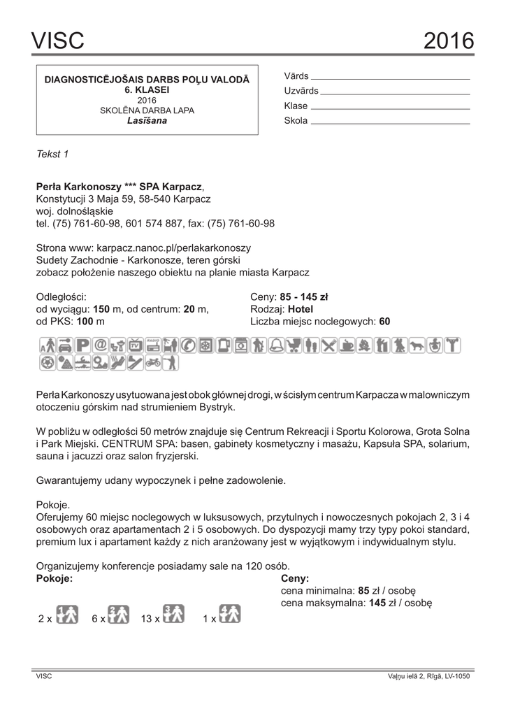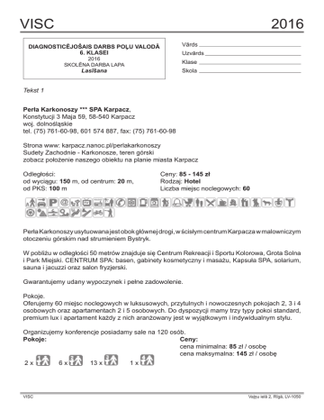 VISC 2016 Vārds DIAGNOSTICĒJOŠAIS DARBS POĻU VALODĀ 6. KLASEI Uzvārds 2016 SKOLĒNA DARBA LAPA Klase Lasīšana Skola Tekst 1 Perła Karkonoszy *** SPA Karpacz, Konstytucji 3 Maja 59, 58-540 Karpacz woj. dolnośląskie tel. (75) 761-60-98, 601 574 887, fax: (75) 761-60-98 Strona www: karpacz.nanoc.pl/perlakarkonoszy Sudety Zachodnie - Karkonosze, teren górski zobacz położenie naszego obiektu na planie miasta Karpacz Odległości: od wyciągu: 150 m, od centrum: 20 m, od PKS: 100 m Ceny: 85 - 145 zł Rodzaj: Hotel Liczba miejsc noclegowych: 60 Perła Karkonoszy usytuowana jest obok głównej drogi, w ścisłym centrum Karpacza w malowniczym otoczeniu górskim nad strumieniem Bystryk. W pobliżu w odległości 50 metrów znajduje się Centrum Rekreacji i Sportu Kolorowa, Grota Solna i Park Miejski. CENTRUM SPA: basen, gabinety kosmetyczny i masażu, Kapsuła SPA, solarium, sauna i jacuzzi oraz salon fryzjerski. Gwarantujemy udany wypoczynek i pełne zadowolenie. Pokoje. Oferujemy 60 miejsc noclegowych w luksusowych, przytulnych i nowoczesnych pokojach 2, 3 i 4 osobowych oraz apartamentach 2 i 5 osobowych. Do dyspozycji mamy trzy typy pokoi standard, premium lux i apartament każdy z nich aranżowany jest w wyjątkowym i indywidualnym stylu. Organizujemy konferencje posiadamy sale na 120 osób. Pokoje: Ceny: cena minimalna: 85 zł / osobę cena maksymalna: 145 zł / osobę 2x VISC 6x 13 x 1x Vaļņu ielā 2, Rīgā, LV-1050 Diagnosticējošais darbs poļu valodā 6. klasei Skolēna darba lapa Lasīšana Zadanie 1 (7 punktów) Proszę przeczytać tekst i zaznaczyć kółkiem właściwą odpowiedź! 2016 2 Aizpilda skolotājs: 1. Karpacz położony jest w województwie: a) śląskim b) dolnośląskim c) małopolskim d) mazowieckim 1.1._____ 2. Perła Karkonoszy to: a) ulica b) hotel c) potok d) rzeka 1.2._____ 3. Perła Karkonoszy znajduje się od wyciągu w odległości: a) 100m b) 150m c) 20m d) 60m 1.3._____ 4. Aby zatelefonować do hotelu, wykręcisz numer kierunkowy: a) 105 b) 48 c) 12 d) 75 1.4._____ 5. Centrum SPA oferuje możliwość skorzystania z: a) basenu, solarium, gabinetu dentystycznego b) basenu, solarium, sauny, jacuzzi c) jacuzzi, basenu, siłowni d) solarium, siłowni, basenu 1.5._____ 6. W apartamentach można zamieszkać w: a) 1 i 4 osoby b) 2 i 4 osoby c) 2 i 5 osób d) 2, 3 i 4 osoby 1.6._____ 7. Minimalna cena za pobyt w hotelu wynosi: a) 145 zł/os b) 85 zł/os c) 58 zł/os d) 100 zł/os 1.7._____ Kopā par 1. uzd.: Zadanie 2 (3 punkty) Proszę odnaleźć w tekście synonimy do podanych wyrazów! 0 Znajduje się 1. lokalizacja _______ Usytuowana jest 2.1._____ 2.2._____ 2. 3. satysfakcja urządzony 2.3._____ Kopā par 2. uzd.: _______ VISC Vaļņu ielā 2, Rīgā, LV-1050 Diagnosticējošais darbs poļu valodā 6. klasei Skolēna darba lapa Lasīšana 2016 3 Tekst 2 Proszę przeczytać tekst i wykonać zadania 3 -5! Jabłko Żaden owoc nie ma ____ 0 ____ jabłko. Jabłko było jedynym zakazanym owocem ____ 1 ____. W mitologii też nie odbyło się bez jabłka. Złote jabłko niezgody z napisem „Najpiękniejszej” rzuciła na weselu między biesiadników bogini Eris. Boginie: Hera, Atena i Afrodyta ____ 2 ____ chwycić owoc. Każda z nich uważała, że tylko jej należy się ten tytuł. Spór miał rozstrzygnąć Parys. Hera obiecała mu władzę, Atena sławę, a Afrodyta najpiękniejszą kobietę za żonę. Rywalizacja zakończyła się zwycięstwem Afrodyty, a spełnienie przez nią obietnicy danej Parysowi stało się przyczyną wojny trojańskiej, która prawdopodobnie miała miejsce w XII wieku p.n.e. Wydarzenia te opisał w „Iliadzie” Homer. Tytuł dzieła pochodzi od Ilionu – dawnej nazwy Troi. Zwycięstwo w wojnie trojańskiej zawdzięczają greccy wojownicy niezwykłemu pomysłowi Odyseusza. Zaproponował on zbudowanie drewnianego konia i umieszczenie w jego wnętrzu wojowników, którzy umożliwiliby dostanie się do miasta. Konia zostawiono przed murami Troi w nadziei, że mieszkańcy miasta przyjmą go jako dar dla Ateny. Tak się też stało, dlatego „koń trojański” jest odtąd symbolem podstępu. Oto co potrafi spowodować jedno jabłko. Jabłko jest też jednym z symboli władzy królewskiej. Ojczyzną dzikich gatunków jabłoni są Chiny lub Azja Środkowa. Stamtąd dotarły one do Europy i podbijały po kolei państwa w strefie klimatu umiarkowanego. Taki klimat odpowiada im najbardziej. W tropikach jabłka są niedobre, ponieważ ____ 3 ____ tracą wodę i jędrność. Jabłko wspaniale działa na krążenie krwi, ułatwia też przyswajanie wapnia przez organizm. Jabłka możemy spożywać przez cały rok pod różnymi postaciami, jednak przetwory z nich, chociaż równie smaczne, nie są już tak wartościowe. VISC Vaļņu ielā 2, Rīgā, LV-1050 Diagnosticējošais darbs poļu valodā 6. klasei Skolēna darba lapa Lasīšana 2016 4 Zadanie 3 (3 punkty) Proszę wpisać do tablicy właściwą literkę! A wyciągnęły dłonie, by B w rajskim ogrodzie C w gorącym klimacie szybko D tak starej tradycji, jak 0 D 1. 3.1._____ 2. 3.2._____ 3. 3.3._____ Kopā par 3. uzd.: _______ Zadanie 4 (6 punktów) Proszę zaznaczyć poprawną odpowiedź „x” przy P (prawda) lub F (fałsz)! L. p. Zdanie 0 Jabłko nie było jedynym zakazanem owocem 1. Tytuł „Najpiękniejszej” Parys przyznał Herze. P F x 4.1._____ 2. Konia trojańskiego w walce użyli Grecy. 3. Wyrażenie „koń trojański” w znaczeniu przenośnym oznacza wdzięczność i życzliwość. 4. 4.2._____ 4.3._____ Dzikie gatunki jabłoni pochodzą z krajów azjatyckich. 4.4._____ 5. 6. Najsmaczniejsze jabłka dojrzewają w strefie klimatu umiarkowanego. Najwięcej wartości odżywczych dostarczysz organizmowi, jedząc jabłka pieczone. 4.5._____ 4.6._____ Kopā par 4. uzd.: Zadanie 5 (1 punkt) Proszę podkreślić, z której książki skorzystasz, by znaleźć przepis na jabłecznik! A. „Domowe przetwory z owoców”. B. „Owocowe ciasta i desery”. C. „Dżemy i gal
