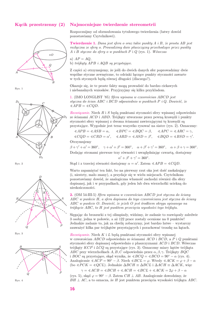 Kącik przestrzenny (2) Najmocniejsze twierdzenie stereometrii Rozpocznijmy od sformułowania tytułowego twierdzenia (łatwy dowód pozostawiamy Czytelnikowi). Twierdzenie 1. Dana jest sfera o oraz takie punkty A i B, że prosta AB jest rozłączna ze sferą o. Prowadzimy dwie płaszczyzny przechodzące przez punkty A i B styczne do sfery o w punktach P i Q (rys. 1). Wówczas a) AP = AQ, b) trójkąty AP B i AQB są przystające. Z części a) otrzymujemy, że jeśli do dwóch danych sfer poprowadzimy dwie wspólne styczne zewnętrzne, to odcinki łączące punkty styczności zawarte w tych stycznych będą równej długości (dlaczego?). Rys. 1 Okazuje się, że te proste fakty mogą prowadzić do bardzo ciekawych i niebanalnych wniosków. Przyjrzyjmy się kilku przykładom. 1. (IMO LONGLIST ’85) Sfera wpisana w czworościan ABCD jest styczna do ścian ABC i BCD odpowiednio w punktach P i Q. Dowieść, że <) AP B = <) CQD. Rozwiązanie. Niech R i S będą punktami styczności sfery wpisanej odpowiednio ze ścianami ACD i ABD. Trójkąty utworzone przez pewną krawędź i punkty styczności sfery wpisanej z dwoma ścianami zawierającymi tę krawędź są przystające. Wygodnie jest teraz wszystko rysować na siatce (rys. 2). Oznaczmy: ) BP C = < ) BQC = β, ) AP C = < ) ARC = γ, <) AP B = <) ASB = α, < < ′ ′ ) ) ) ) ) < CQD = < CRD = α , < ARD = < ASD = β , < BQD = <) BSD = γ ′ . Otrzymujemy β + γ ′ + α′ = 360◦ , γ + α′ + β ′ = 360◦ , α + β ′ + γ ′ = 360◦ , α + β + γ = 360◦ . Dodając stronami pierwsze trzy równości i uwzględniając czwartą, dostajemy α′ + β ′ + γ ′ = 360◦ . Rys. 2 Stąd i z trzeciej równości dostajemy α = α′ . Zatem <) AP B = <) CQD. Warto zapamiętać ten fakt, bo na pierwszy rzut oka jest dość zaskakujący (i, niestety, mało znany), a przydaje się w wielu miejscach. Czytelnikom pozostawiamy dowód, że analogiczna własność zachodzi również dla sfery dopisanej, jak i w przypadkach, gdy jeden lub dwa wierzchołki uciekną do nieskończoności. 2. (OM 54-III-5) Sfera wpisana w czworościan ABCD jest styczna do ściany ABC w punkcie H, a sfera dopisana do tego czworościanu jest styczna do ściany ABC w punkcie O. Dowieść, że jeżeli O jest środkiem okręgu opisanego na trójkącie ABC, to H jest punktem przecięcia wysokości tego trójkąta. Sięgając do broszurki z tej olimpiady, widzimy, że zadanie to rozwiązały zaledwie 3 osoby, jedna w połowie, a aż 122 prace zostały ocenione na 0 punktów! Jednakże zadanie to, jak za chwilę zobaczymy, jest bardzo łatwe – wystarczy zauważyć kilka par trójkątów przystających i porachować troszkę na kątach. Rys. 3 Rys. 4 Rozwiązanie. Niech K i L będą punktami styczności sfery wpisanej w czworościan ABCD odpowiednio ze ścianami ACD i BCD, a P i Q punktami styczności sfery dopisanej odpowiednio z płaszczyznami ACD i BCD. Wówczas trójkąty KCP i LCQ są przystające (rys. 3). Oznaczmy miary kątów trójkąta ABC przy wierzchołkach A, B, C odpowiednio przez α, β, γ. Trójkąty BQC i BOC są przystające, skąd wynika, że <) BCQ = <) BCO = 90◦ − α (rys. 4). Analogicznie <) ACP = 90◦ − β. Niech <) BCL = ϕ. Wtedy <) ACK = ϕ + β − α (bo <) P CK = <) QCL). Jednakże ∆BCH ≡ ∆BCL i ∆ACH ≡ ∆ACK, więc γ = <) ACB = <) BCH + <) ACH = <) BCL + <) ACK = 2ϕ + β − α (rys. 5), skąd ϕ = 90◦ − β. Zatem CH ⊥ AB. Analogicznie dowodzimy, że BH ⊥ AC, a to oznacza, że H jest punktem przecięcia wysokości trójkąta ABC. 16 Dlaczego więc tak proste zadanie sieje takie spustoszenie na finale? Częstym błędem wielu olimpijczyków jest rysowanie wszystkich rzeczy na jednym rysunku. Na powyższym przykładzie przekonaliśmy się, jak dużo może dać zrobienie kilku rysunków i zaznaczenie na każdym z nich jedynie pewnych elementów! Być może brakuje też wiary, że do tego typu zadań wystarczają jedynie te prościutkie fakty przytoczone na początku. Pamiętajcie: wiara czyni cuda! Zadania 3. (RUS 1986) Czworościan ABXY jest opisany na sferze. Punkty A i B są ustalone, a punkty X i Y poruszają się. Udowodnić, że suma <) AXB + <) XBY + <) BYA + <) YAX jest stała. Rys. 5 4. (OM 57-III-5) Dany jest czworościan ABCD, w którym AB = CD. Sfera wpisana w ten czworościan jest styczna do ścian ABC i ABD odpowiednio w punktach K i L. Dowieść, że jeżeli punkty K i L są środkami ciężkości ścian ABC i ABD, to czworościan ABCD jest foremny. Więcej zadań i objaśnienie skrótów na internetowej stronie Delty. Michał KIEZA Rozwiązania zadań lingwistycznych Zadanie nr 1. Oto wyrazy, z których tworzy się liczebniki w języku sulka: • tgiang 1, lomin 2, korlotge 3, korlolo 4, ktiëk 5, mhelom 20; • hori orom – oznacza dodawanie, lo – podwojenie; • a – l. pojedyncza lub podwójna, o – l. mnoga (od 3). Rzeczowniki mają te same formy w liczbie pojedynczej i podwójnej, natomiast inne w liczbie mnogiej (tu, sngu; vhoi, vuo). Istnieją osobne wyrazy dla czwórki kokosów oraz dla pary i czwórki owoców chlebowca (ngausmia, moulang, ngaitegaap). Odpowiedzi: (a) a ksie a tgiang: 1 kokos o ngaitegaap a korlotge: 12 owoców chlebowca o ngausmia a ktiëk: 20 kokosów o vuo a lo ktiëk hori orom a tgiang: 11 orzechów betelu (b) 2 pochrzyny: a lo tu a lomin 14 pochrzynów: o sngu a lo ktiëk hori orom a korlolo 15 owoców chlebowca: o ngaitegaap a korlotge hori orom a moulang hori orom a tgiang 20 orzechów betelu: o vuo a mhelom Zadanie nr 5. Zdania w nahuatl zaczynają się od orzeczenia. Podmiot i dopełnienie (dopełnienia) niebędące zaimkami występują za nim w dowolnej kolejności, poprzedzone wyrazem in (rodzajnik określony). Czasownik otrzymuje kolejno następujące przedrostki: • podmiot: ni- 1. os. l.p., ti- 2. os. l.p., — 3. os. l.p.; • dopełnienie: nēch- 1. os. l.p., mitz- 2. os. l.p., k- 3. os. l.p.; • kolejne dopełnienie: tē- ‘kogoś, komuś’, t
