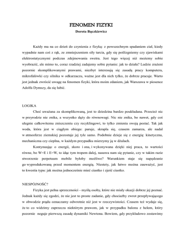 FENOMEN FIZYKI Dorota Bączkiewicz Każdy ma na co dzień do czynienia z fizyką: z powszechnym spadaniem ciał, kiedy wypadnie nam coś z rąk, ze zmniejszeniem siły tarcia, gdy się poślizgniemy czy zjawiskami elektrostatycznymi podczas zdejmowania swetra. Jest tego więcej niż możemy sobie wyobrazić, ale mimo to, coraz rzadziej zadajemy sobie pytanie: jak to działa? Ludzie zrażeni pozornie skomplikowanymi prawami, niezbyt interesują się zasadą pracy komputera, mikrofalówki czy silnika w odkurzaczu, ważne jest dla nich tylko, że dobrze pracuje. Warto jest jednak zwrócić uwagę na fenomen fizyki, która moim zdaniem, jak Warszawa w piosence Adolfa Dymszy, da się lubić. LOGIKA Choć uważana za skomplikowaną, jest to dziedzina bardzo poukładana. Przecież nic w przyrodzie nie znika, a wszystko dąży do równowagi. Nic nie znika, bo nawet, gdy coś ulegnie całkowitemu zniszczeniu czy recyklingowi, to tylko zmienia swoją postać. Tak jak woda, która jest w ciągłym obiegu: paruje, skrapla się, czasem zamarza, ale nadal w atmosferze ziemskiej pozostaje jej tyle samo. Podobnie dzieje się z energią: kinetyczna, mechaniczna czy cieplna, w każdym przypadku mierzymy ją w dżulach. Kontynuując o energii, skoro i ona, i wykonywana dzięki niej praca, to wartości równe, bo W=E i E=W, to idąc tym tropem dalej, nasuwa nam się pytanie, czy w takim razie stworzenie perpetuum mobile byłoby możliwe? Warunkiem staje się napędzanie go wyprodukowaną przed momentem energią. Niestety, jak łatwo można zauważyć, jest to kwestia typu: jak można jednocześnie mieć ciastko i zjeść ciastko. NIESPÓJNOŚĆ? Fizyka jest pełna sprzeczności - myślą osoby, które nie miały okazji dobrze jej poznać. Jednak każdy się zgodzi, że nie jest to proste zadanie, gdy chociażby zwrot przepływającego w obwodzie prądu oznaczamy odwrotnie niż jest w rzeczywistości. Czasem też wydaje się, że to co widzimy zaprzecza niektórym prawom, jak w przypadku balonu z helem, który pozornie neguje pierwszą zasadę dynamiki Newtona. Bowiem, gdy przykładowo zostawimy go w poruszającym się na przód autobusie, w chwili zatrzymania powinien poruszać się dalej z ruchem jednostajnie prostoliniowym, a jednak „buntuje się” i zmienia zwrot na odwrotny. Odpowiedź, dlaczego tak się dzieje jest w gruncie rzeczy oczywista, lecz gdy nie weźmiemy pod uwagę, że powietrze jest cięższe od helu i wypchnęło balon ze swojego miejsca, powiedzielibyśmy, że to niemożliwe. To czyni tę naukę wyjątkową. Co rusz napotykamy niezgodności i to właśnie między innymi te paradoksy nie pozwalają nam nudzić się podczas poznawania fizycznych ścieżek. A co z teorią Galileusza? Osoby, którym dopiero co powiedziano, że dwa ciała spadające w takim samym polu grawitacyjnym, dotkną ziemi w tym samym momencie niezależnie od swojej masy, otwierają szeroko oczy i pytają : „Jak to możliwe?”. Wielu musiało to zobaczyć na własne oczy, zanim uwierzyło, że średniowieczny naukowiec jednak miał rację, a obliczenia dodatkowo to potwierdzają. Jak widać, jedne twierdzenia są prawdziwe choć na pierwszy rzut oka wydają się błędne. Natomiast niektóre konstrukcje nie działają, choć zgodnie z naszą wiedzą, nie mają prawa nie działać (co często zdarza się przy domowych doświadczeniach). W tym momencie zapala nam się czerwona lampka, że najwyraźniej istnieje zasada, której akurat nie braliśmy pod uwagę. Wtedy naszym zadaniem jest szukanie odpowiedzi, a gdy ją znajdziemy paradoks przestanie być sprzecznością, dlatego poznawanie fizyki jest tak ciekawym zajęciem. ZNOWU PARADOKS Gdybyśmy zatrzymali się na podziwianiu świata, cywilizacja nigdy nie miałaby szans ruszyć dalej. To ciekawość, która jak mawiają starsze pokolenia, jest pierwszym stopniem do piekła, pozwoliła byśmy nie musieli chodzić wszędzie pieszo i każdej nocy rozpalać ognia. Pomyśleć, że gdyby Isaac Newton nie poszedł na studia, tylko zgodnie z pierwotnym zamysłem rodziców pozostał na roli, moglibyśmy nadal pozostawać w przekonaniu, że jabłko spada na ziemię, bo tak po prostu Ilustracja 1. Dysk Farradaya jest, a nie, bo istnieje prawo powszechnego ciążenia. Podobnie z Faradayem. Gdyby nie był żądny wiedzy i nie zadał sobie pytania, dlaczego igła magnetyczna zmienia położenie względem elektromagnesu, jedynie podczas otwierania i zamykania obwodu, nie poznałby indukcji magnetycznej i nie zbudowałby prądnicy, dzięki której wytwarzamy dziś energię elektryczną. A WIĘC...? Jak żadna inna w moim przekonaniu, nie zadaje tylu pytań, jednocześnie znając tak wiele odpowiedzi. Pełna pozornych sprzeczności i paradoksów, zarówno w samych prawach, jak i procesie ich odkrywania. Zauważmy, że dzięki ciekawości i dążeniu do wiedzy pozornie zwyczajnych osób, możemy cieszyć się dzisiaj z wysokich technologii. Nie zapominajmy jednak, że wysokość jest pojęciem względnym i niedługo możemy się o tym przekonać, ponieważ choć fizykę poznajemy nieustannie już od starożytności, ciągle odkrywamy i konstruujemy coś nowego. Nic jednak nie powstałoby bez ludzi, którzy odważyli się fizykę polubić i spróbować zgłębić jej fenomen. Nie mam tutaj na myśli jedynie naukowców, bo przecież z tej nauki czerpią również inspirację filozofowie i artyści. Nie można by mówić o metafizyce, Ilustracja 2. Instalacja Dana Flavina czyli o zjawiskach ponad fizyką, gdybyśmy nie „Monument” złożona z wytyczyli granicy - granicy pomiędzy tym, co jasnozielonych świetlówek w Monachium materialne i mierzalne oraz materialne inaczej. Również nie mylą się według mnie ci, którzy uważają fizykę za formę sztuki, bowiem obie dziedziny wyraźnie się przeplatają. Jak zauważył Vladimir Nabokov „nie ma fizyki bez fantazji ani sztuki bez faktów”. Podsumowując swoje wnioski, które nasunęły mi się podczas nauki, myślę, że nie