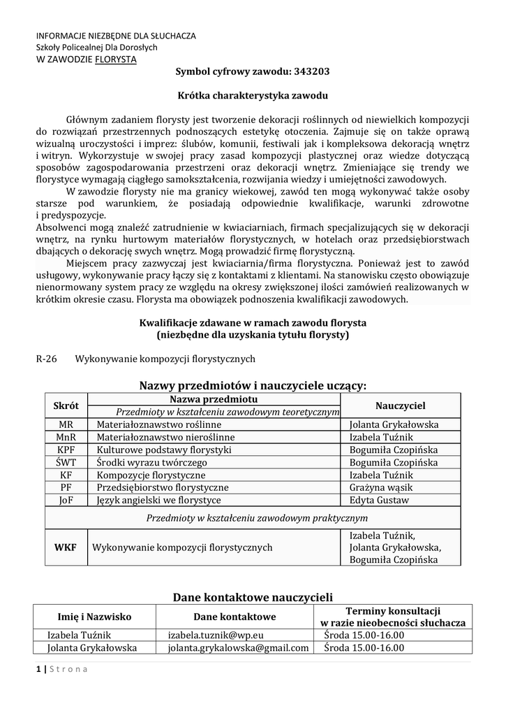 INFORMACJE NIEZBĘDNE DLA SŁUCHACZA Szkoły Policealnej Dla Dorosłych W ZAWODZIE FLORYSTA Symbol cyfrowy zawodu: 343203 Krótka charakterystyka zawodu Głównym zadaniem florysty jest tworzenie dekoracji roślinnych od niewielkich kompozycji do rozwiązań przestrzennych podnoszących estetykę otoczenia. Zajmuje się on także oprawą wizualną uroczystości i imprez: ślubów, komunii, festiwali jak i kompleksowa dekoracją wnętrz i witryn. Wykorzystuje w swojej pracy zasad kompozycji plastycznej oraz wiedze dotyczącą sposobów zagospodarowania przestrzeni oraz dekoracji wnętrz. Zmieniające się trendy we florystyce wymagają ciągłego samokształcenia, rozwijania wiedzy i umiejętności zawodowych. W zawodzie florysty nie ma granicy wiekowej, zawód ten mogą wykonywać także osoby starsze pod warunkiem, że posiadają odpowiednie kwalifikacje, warunki zdrowotne i predyspozycje. Absolwenci mogą znaleźć zatrudnienie w kwiaciarniach, firmach specjalizujących się w dekoracji wnętrz, na rynku hurtowym materiałów florystycznych, w hotelach oraz przedsiębiorstwach dbających o dekorację swych wnętrz. Mogą prowadzić firmę florystyczną. Miejscem pracy zazwyczaj jest kwiaciarnia/firma florystyczna. Ponieważ jest to zawód usługowy, wykonywanie pracy łączy się z kontaktami z klientami. Na stanowisku często obowiązuje nienormowany system pracy ze względu na okresy zwiększonej ilości zamówień realizowanych w krótkim okresie czasu. Florysta ma obowiązek podnoszenia kwalifikacji zawodowych. Kwalifikacje zdawane w ramach zawodu florysta (niezbędne dla uzyskania tytułu florysty) R-26 Wykonywanie kompozycji florystycznych Nazwy przedmiotów i nauczyciele uczący: Skrót MR MnR KPF ŚWT KF PF JoF Nazwa przedmiotu Przedmioty w kształceniu zawodowym teoretycznym Materiałoznawstwo roślinne Materiałoznawstwo nieroślinne Kulturowe podstawy florystyki Środki wyrazu twórczego Kompozycje florystyczne Przedsiębiorstwo florystyczne Język angielski we florystyce Nauczyciel Jolanta Grykałowska Izabela Tuźnik Bogumiła Czopińska Bogumiła Czopińska Izabela Tuźnik Grażyna wąsik Edyta Gustaw Przedmioty w kształceniu zawodowym praktycznym WKF Izabela Tuźnik, Jolanta Grykałowska, Bogumiła Czopińska Wykonywanie kompozycji florystycznych Dane kontaktowe nauczycieli Imię i Nazwisko Izabela Tuźnik Jolanta Grykałowska 1|Strona Dane kontaktowe [email protected] [email protected] Terminy konsultacji w razie nieobecności słuchacza Środa 15.00-16.00 Środa 15.00-16.00 Bogumiła Czopińska Grażyna Wąsik Edyta Gustaw [email protected] [email protected] [email protected] Środa 13.30-14.30 EGZAMINY ZDAWANE PODCZAS NAUKI W ZSA W ZAWODZIE FLORYSTA Przedmiot Semestr I Materiałoznawstwo roślinne U Materiałoznawstwo nieroślinne U Kulturowe podstawy florystyki U Środki wyrazu twórczego PS Kompozycje florystyczne PS Przedsiębiorstwo florystyczne Język angielski we florystyce Wykonywanie kompozycji florystycznych PR Legenda: PS – pisemny PR – ustny w formie zadania praktycznego Semestr II PS PS U U PR U - ustny INFORMACJE NA TEMAT EGZAMINU ZEWNĘTRZNEGO (Kwalifikacja R26). Części egzaminu: Część pisemna: test składający się z 40 zadań wielokrotnego wyboru, czas 60 min. Część praktyczna: test praktyczny składający się z jednego zadania praktycznego, czas 120min Część praktyczna egzaminu. WYCIĄG Z PODSTAWY PROGRAMOWEJ czyli co słuchacz powinien umieć (cele i efekty kształcenia dla danego zawodu) 1. CELE KSZTAŁCENIA W ZAWODZIE Absolwent szkoły kształcącej w zawodzie florysta powinien być przygotowany do wykonywania następujących zadań zawodowych: 1) projektowania dekoracji roślinnych; 2) wykonywania dekoracji roślinnych; 3) aranżacji florystycznego wystroju wnętrz oraz otwartej przestrzeni. 2. EFEKTY KSZTAŁCENIA Do wykonywania wyżej wymienionych zadań zawodowych niezbędne jest osiągnięcie zakładanych efektów kształcenia, na które składają się: 1) efekty kształcenia wspólne dla wszystkich zawodów; (BHP). Bezpieczeństwo i higiena pracy Uczeń: 1) rozróżnia pojęcia związane z bezpieczeństwem i higieną pracy, ochroną przeciwpożarową, ochroną środowiska i ergonomią; 2|Strona 2) rozróżnia zadania i uprawnienia instytucji oraz służb działających w zakresie ochrony pracy i ochrony środowiska w Polsce; 3) określa prawa i obowiązki pracownika oraz pracodawcy w zakresie bezpieczeństwa i higieny pracy; 4) przewiduje zagrożenia dla zdrowia i życia człowieka oraz mienia i środowiska związane z wykonywaniem zadań zawodowych; 5) określa zagrożenia związane z występowaniem szkodliwych czynników w środowisku pracy; 6) określa skutki oddziaływania czynników szkodliwych na organizm człowieka; 7) organizuje stanowisko pracy zgodnie z obowiązującymi wymaganiami ergonomii, przepisami bezpieczeństwa i higieny pracy, ochrony przeciwpożarowej i ochrony środowiska; 8) stosuje środki ochrony indywidualnej i zbiorowej podczas wykonywania zadań zawodowych; 9) przestrzega zasad bezpieczeństwa i higieny pracy oraz stosuje przepisy prawa dotyczące ochrony przeciwpożarowej i ochrony środowiska; 10) udziela pierwszej pomocy poszkodowanym w wypadkach przy pracy oraz w stanach zagrożenia zdrowia i życia. (PDG). Podejmowanie i prowadzenie działalności gospodarczej Uczeń: 1) stosuje pojęcia z obszaru funkcjonowania gospodarki rynkowej; 2) stosuje przepisy prawa pracy, przepisy prawa dotyczące ochrony danych osobowych oraz przepisy prawa podatkowego i prawa autorskiego; 3) stosuje przepisy prawa dotyczące prowadzenia działalności gospodarczej; 4) rozróżnia przedsiębiorstwa i instytucje występujące w branży i powiązania między nimi; 5) analizuje działania prowadzone przez przedsiębiorstwa funkcjonujące w branży; 6) inicjuje wspólne przedsięwzięcia z różnymi przedsiębiorstwami z branży; 7) przygotowuje dokumentację niezbędną do uruchomienia i prowadzenia działalności gosp